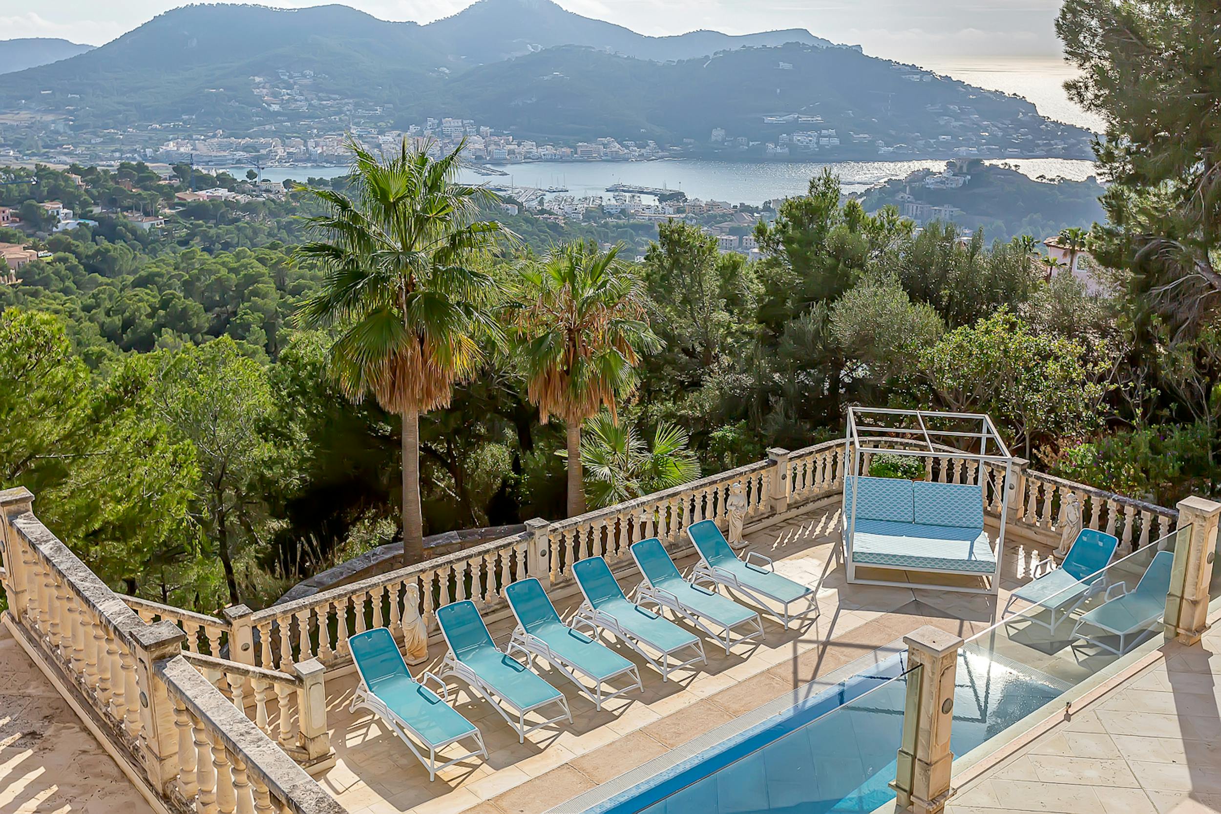 Perched high above Port d’Andratx, this stunning villa blends seamlessly into its hillside setting.
