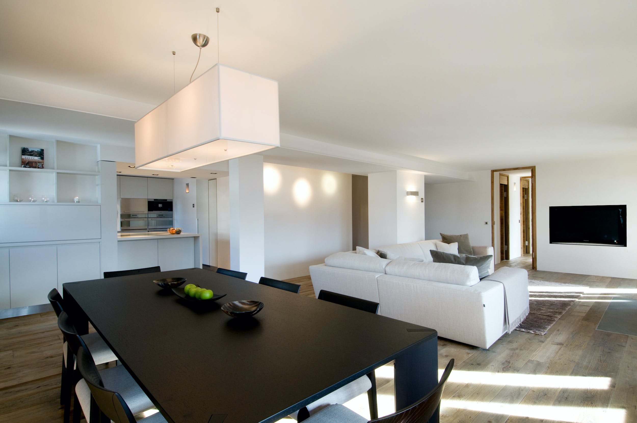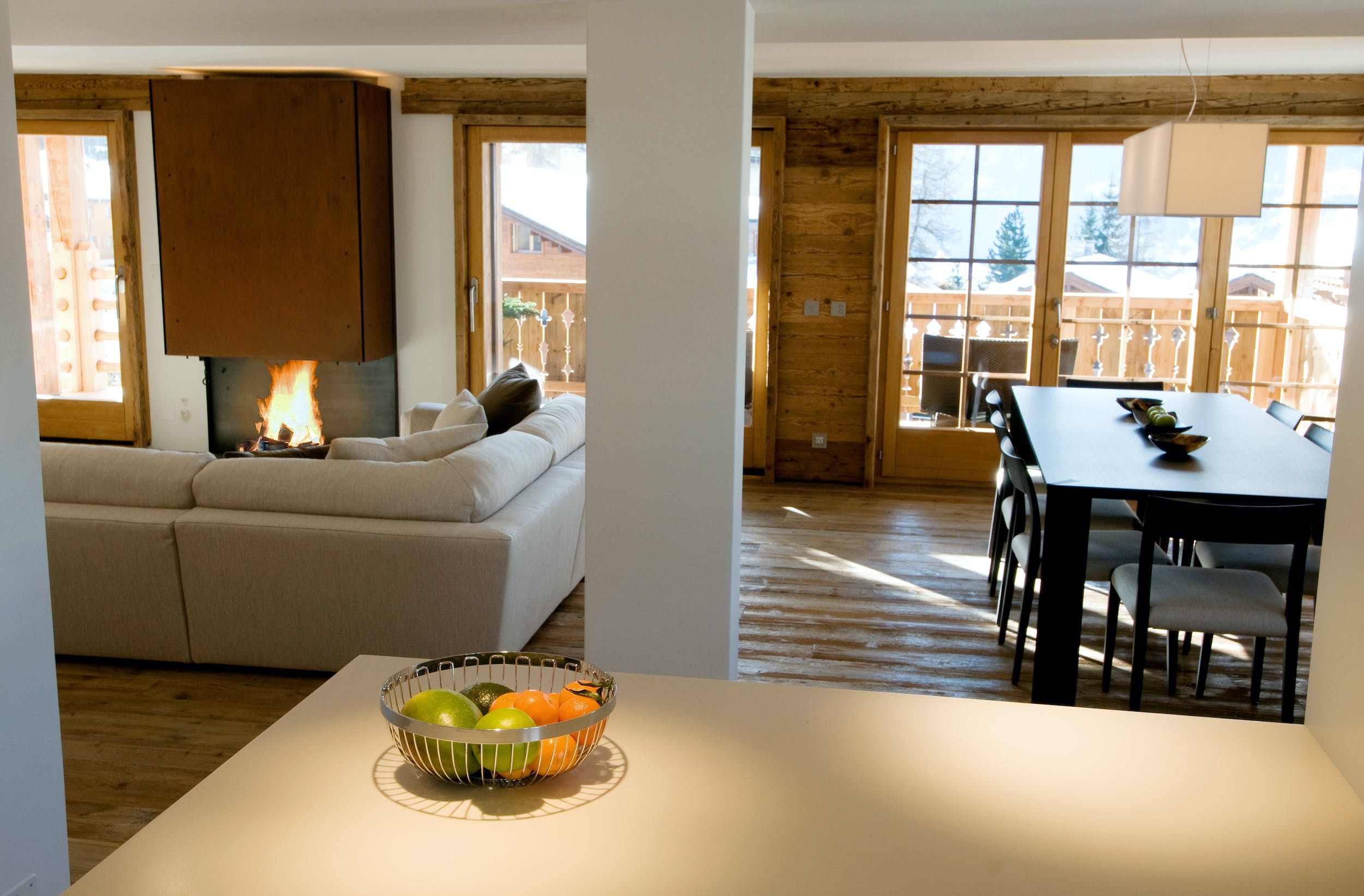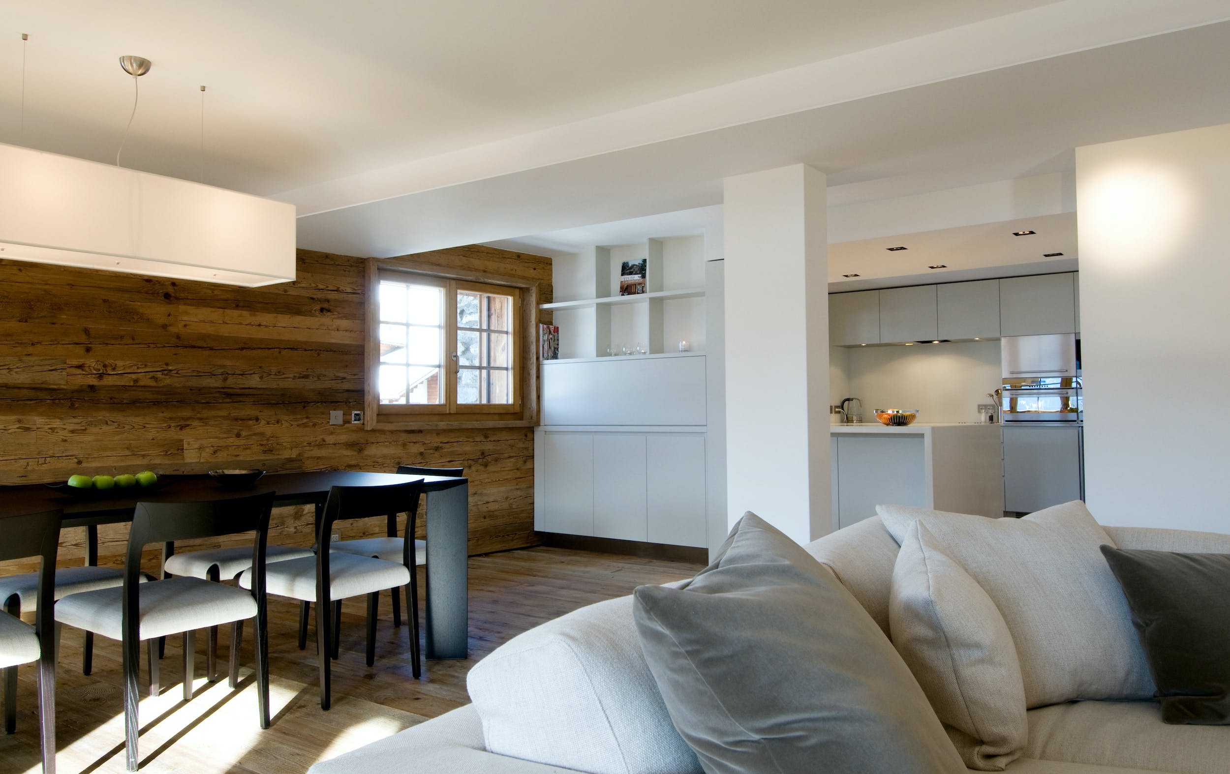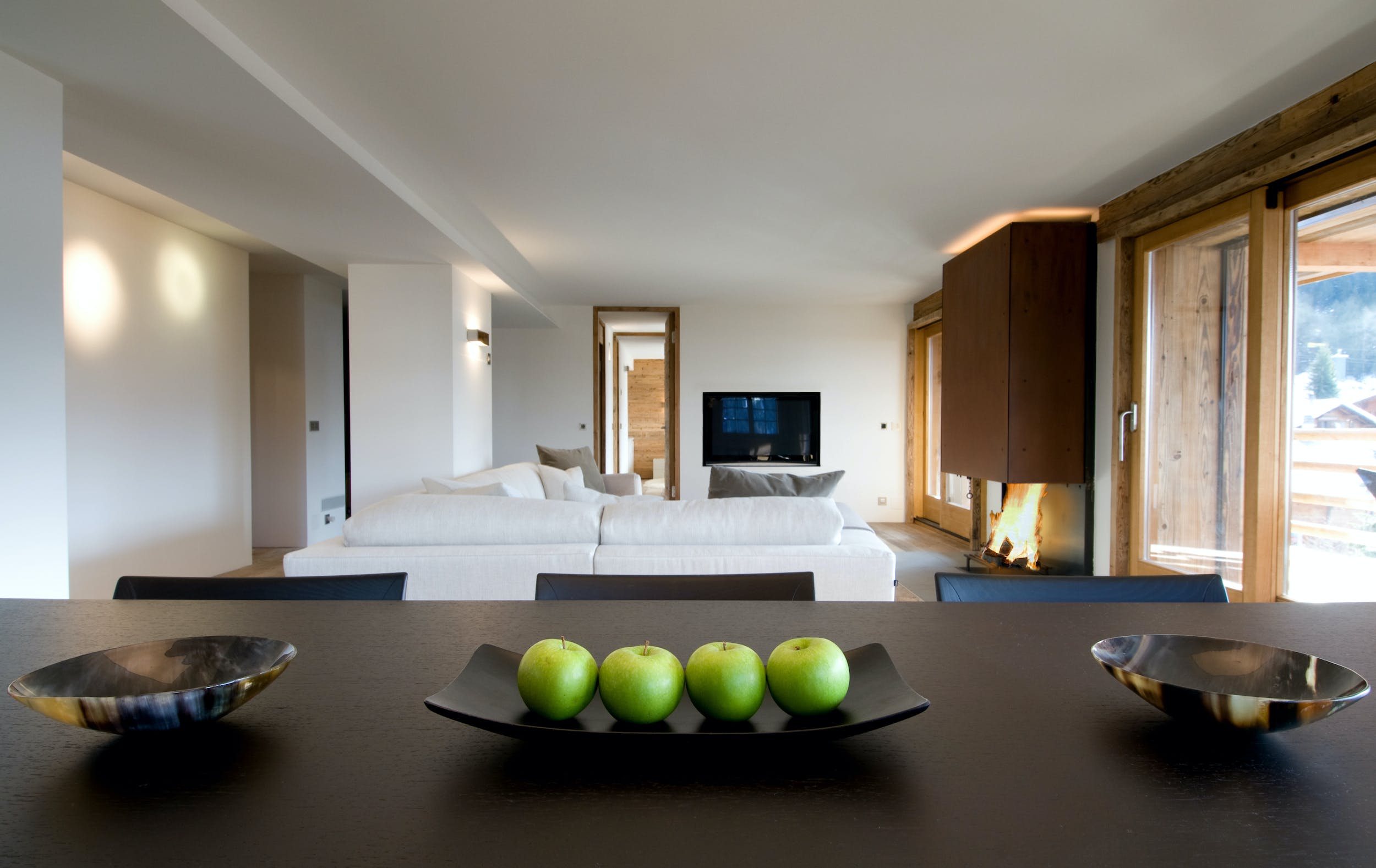 Accommodating eight adults and two children in four spacious bedrooms, Chalet Alps is perfect for family and small group holidays in this famed ski resort. The pristine, well-equipped kitchen boasts Miele appliances, including an integrated coffee machine and wine cooler, and opens on to the open-plan dining and living space. Dominated by the mountain views over the Combins and beyond to Mont Blanc, this sleek space opens onto the south-facing balcony that spans the width of the property. Here, you can relax on the wide L-shaped sofa in front of the huge contemporary fireplace and soak up those mountain views.