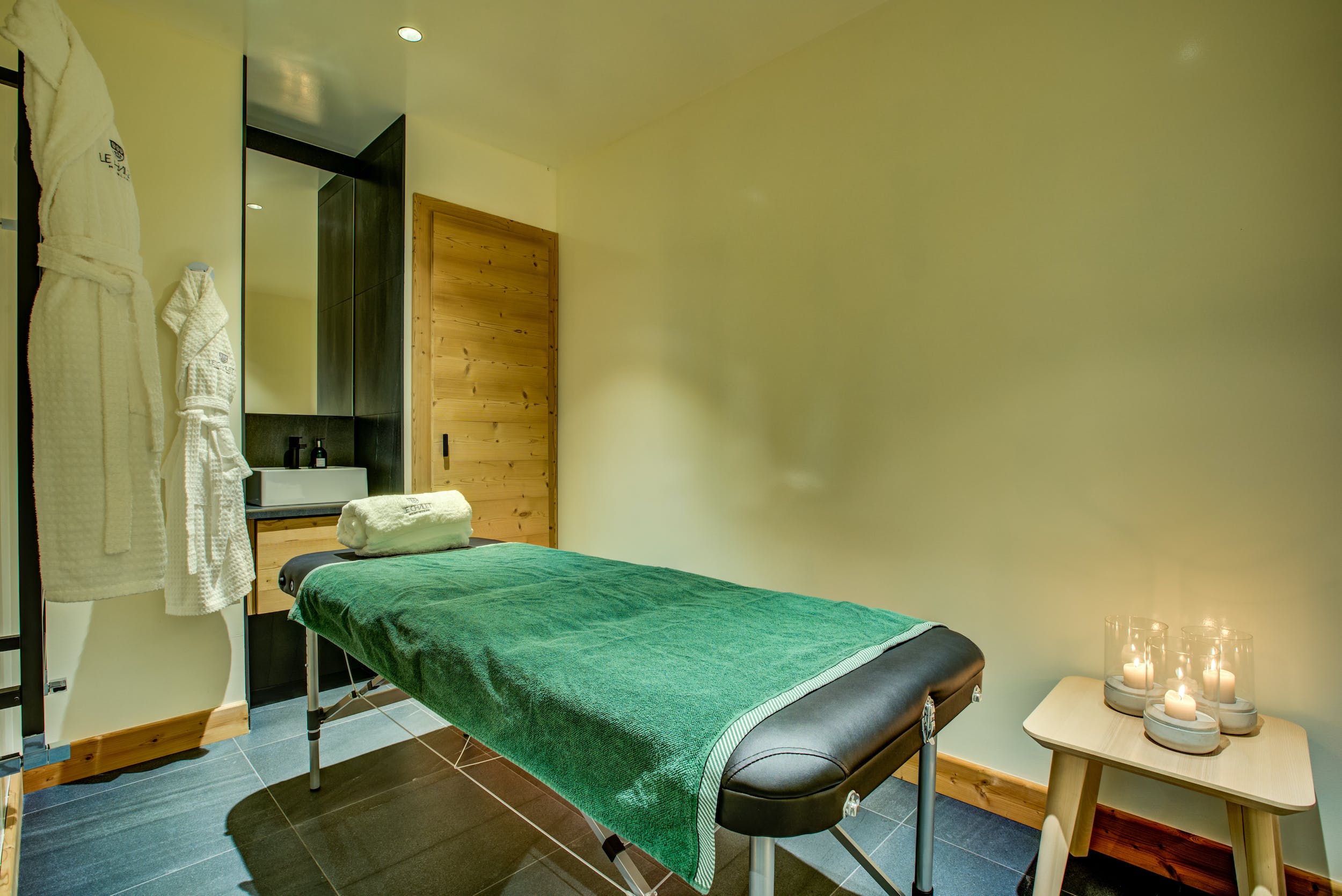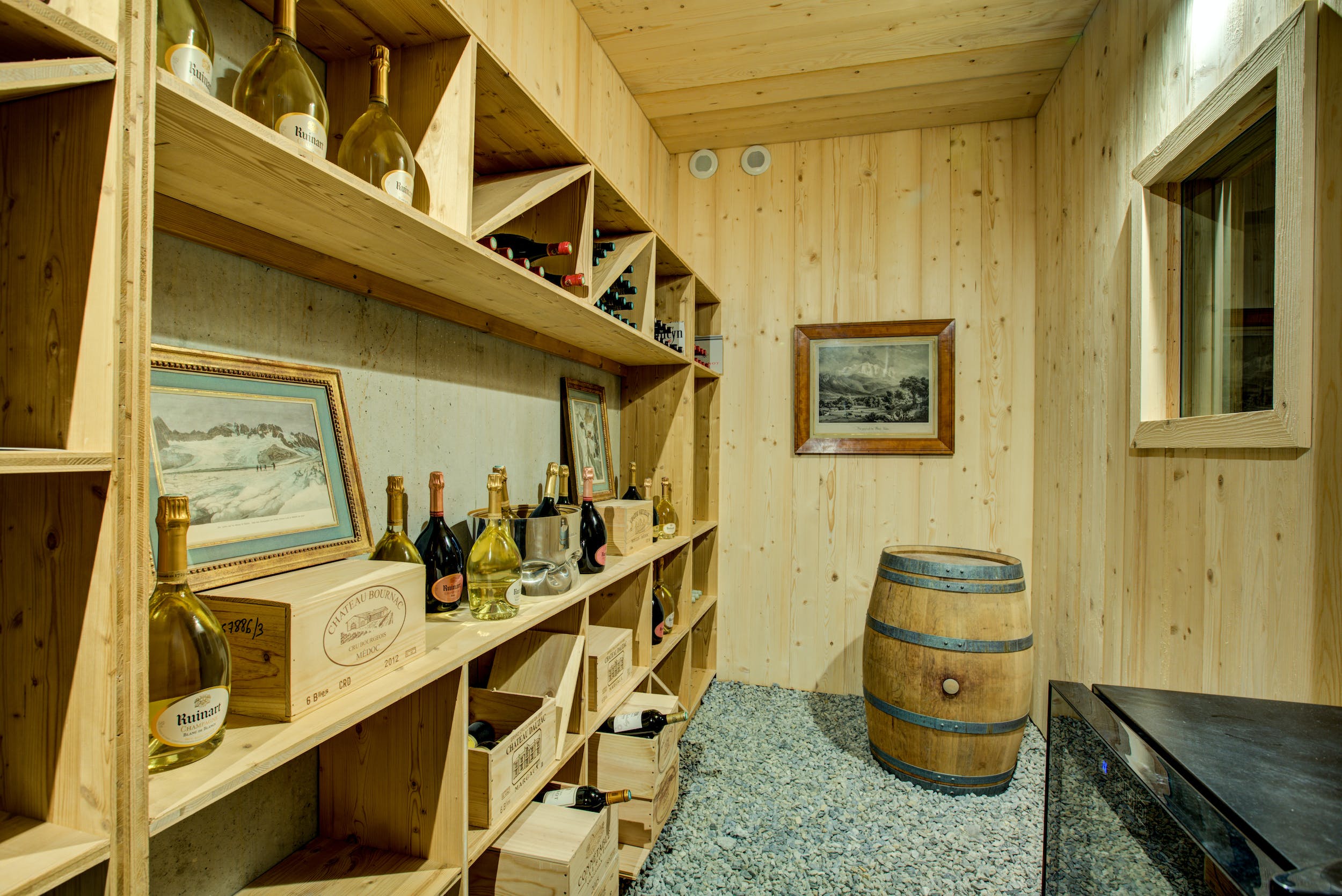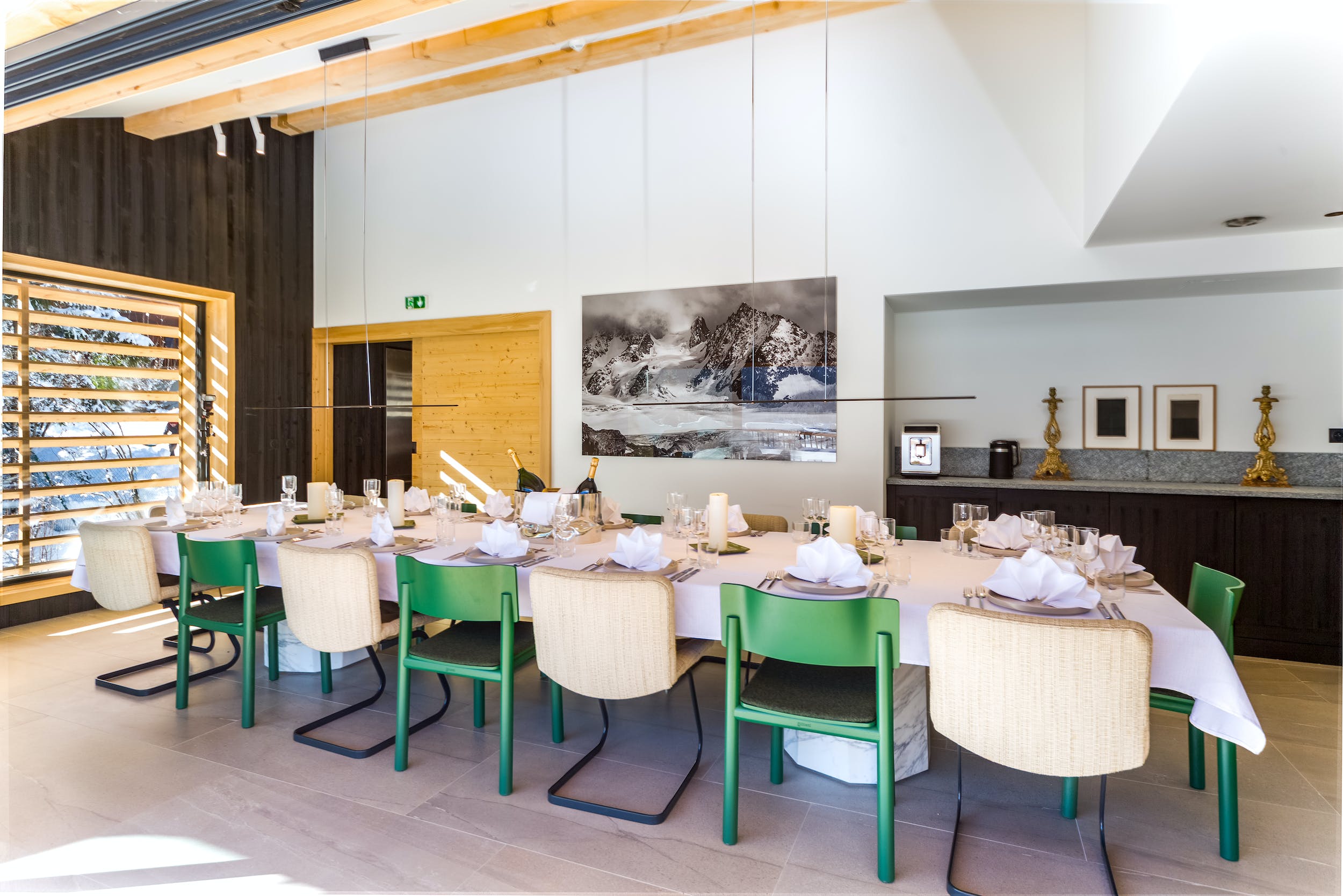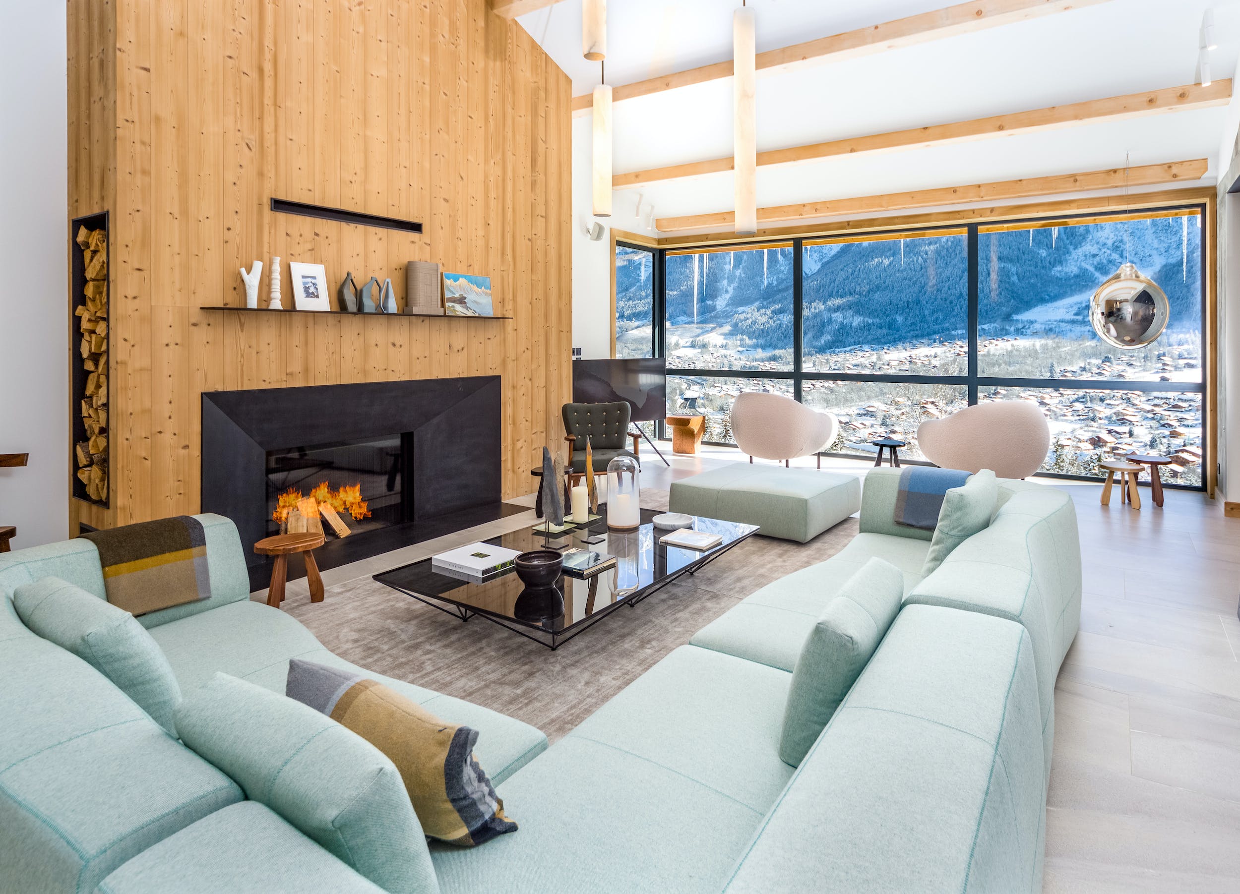 The main living space is a wonderful place to gather after an exhilarating day on the slopes. Sink into soft sofa seating around the impressive fireplace under high ceilings. A well-stocked wine cellar, a cinema and projection room, and the dining room with sensational mountain panoramas offer further opportunities to relax.