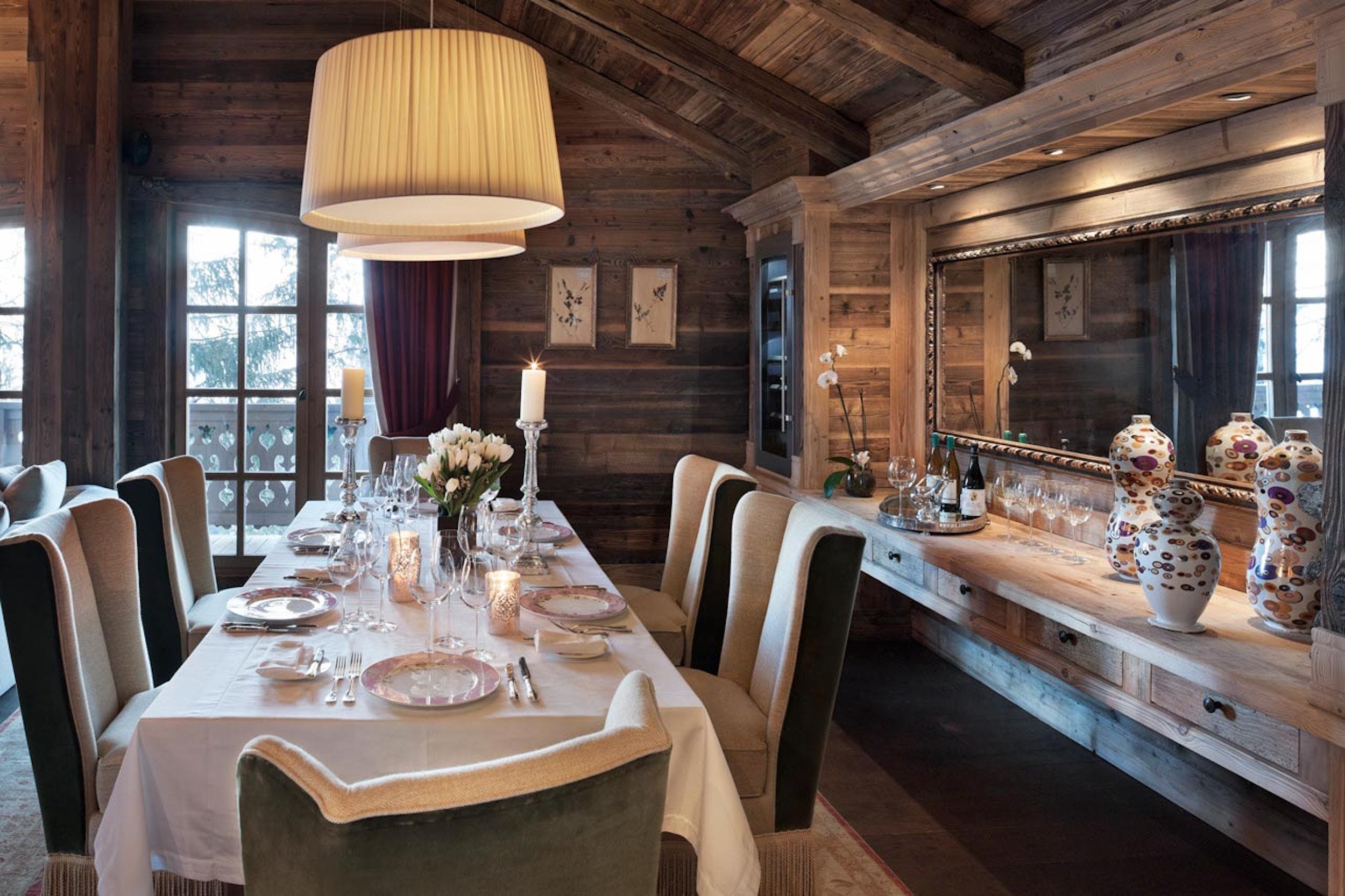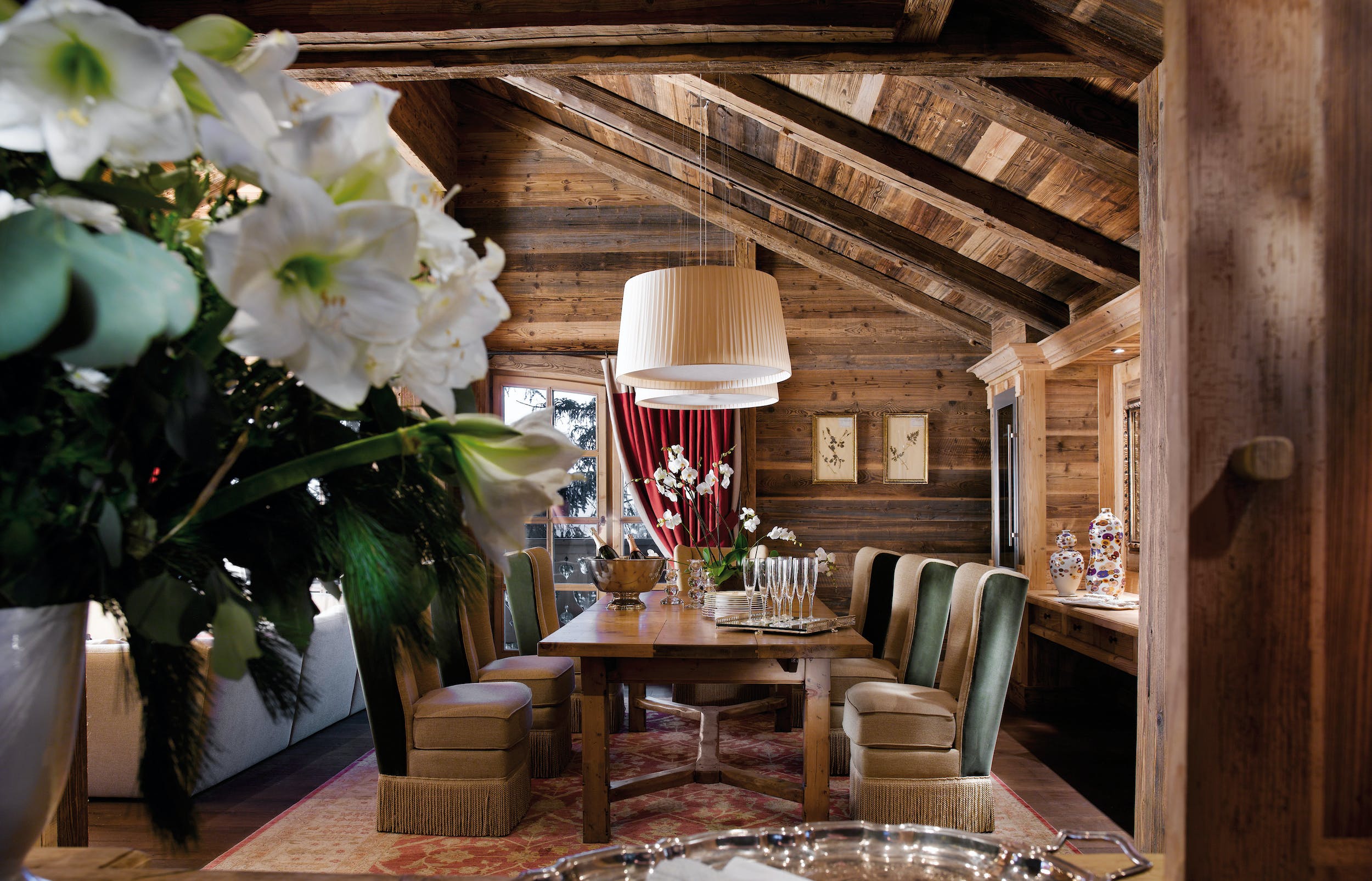 A romantic wood fire is the centrepiece of the main living area. Cosy sofa seating arranged on all sides creates a convivial atmosphere where you can all come together at the end of the day. Upstairs, the dining room, seating fifteen, has a terrace with magnificent mountain views.