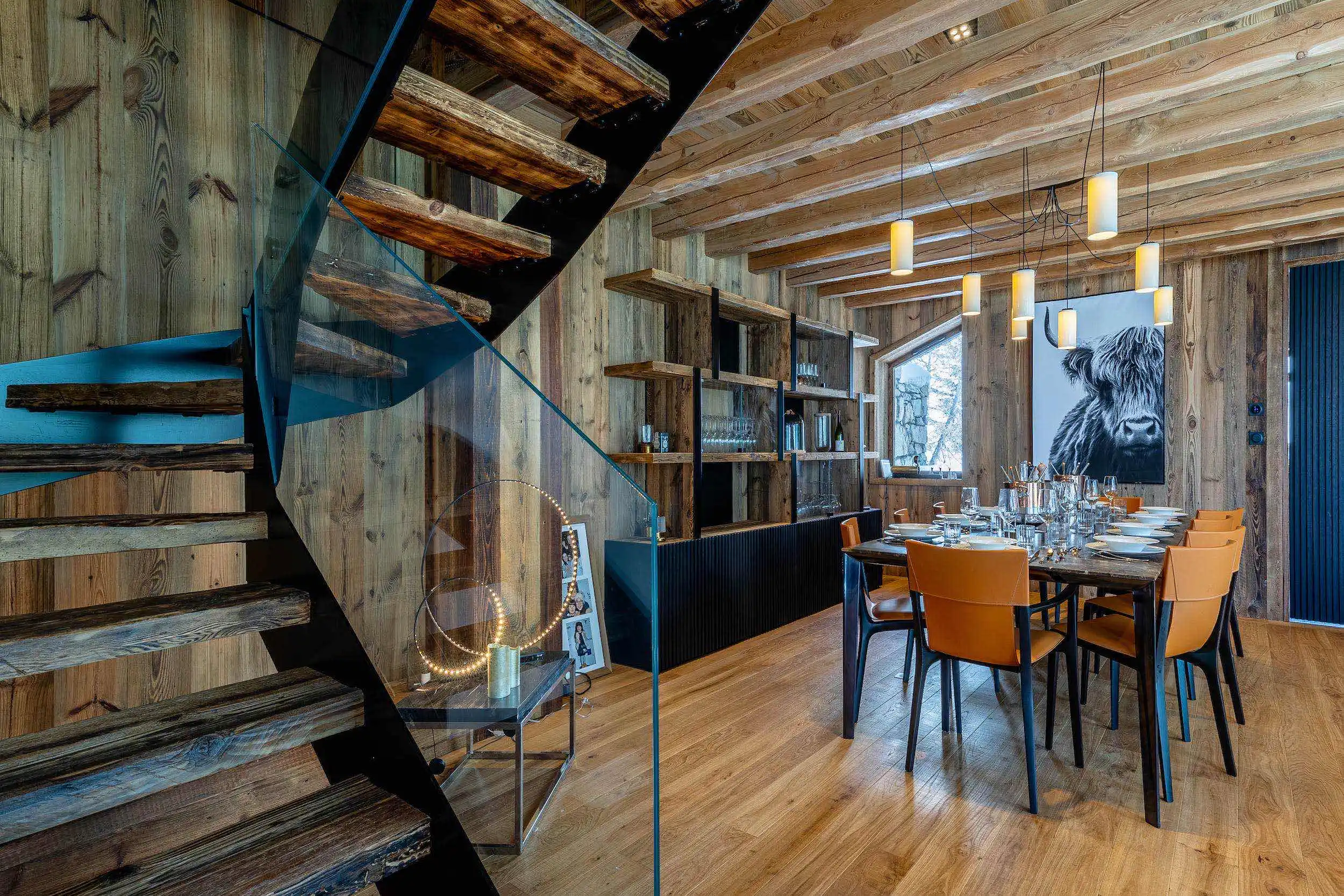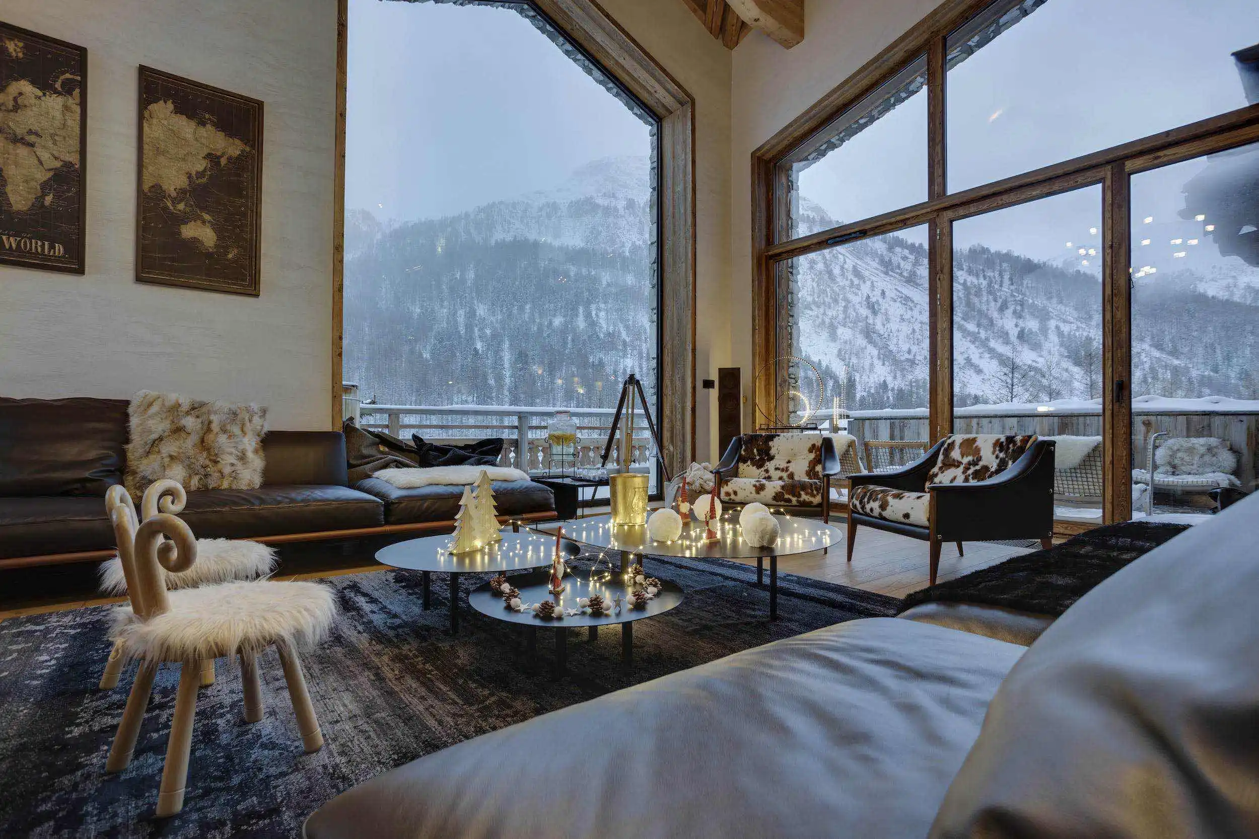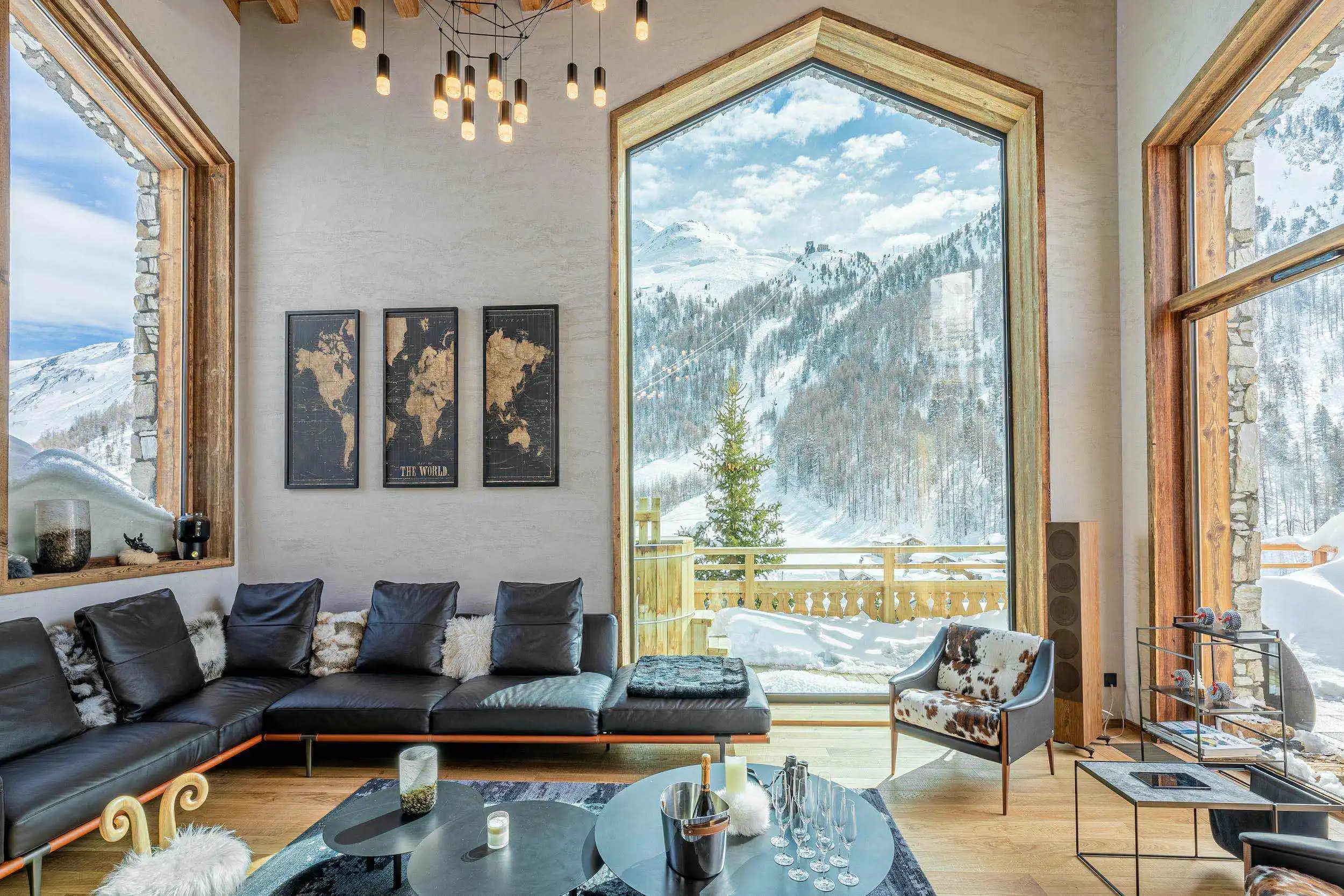 The living room, with spectacular dimensions and incredible glazed units, benefits from a 180° view which immerses you in the middle of the peaks and offers you all the purity and beauty of the Mountain in its raw state.
