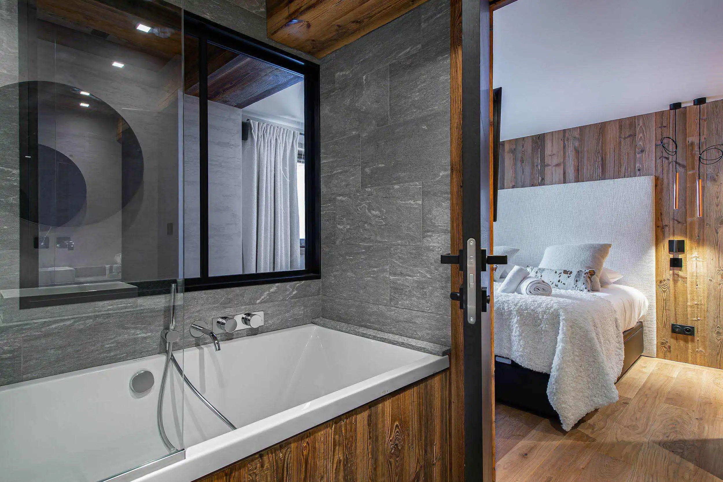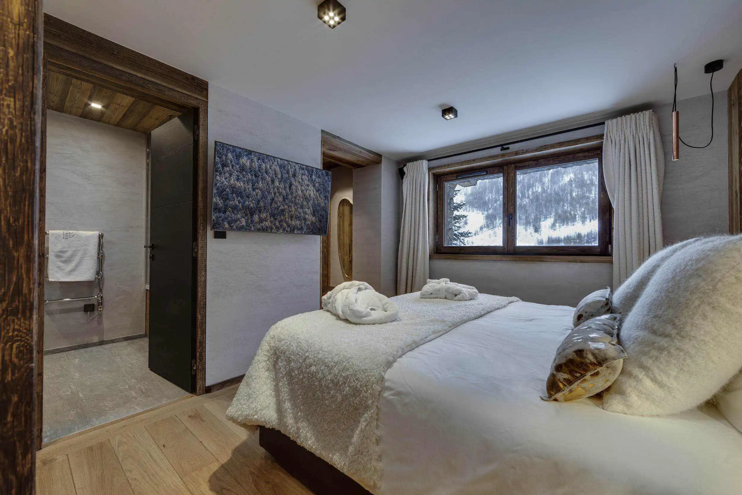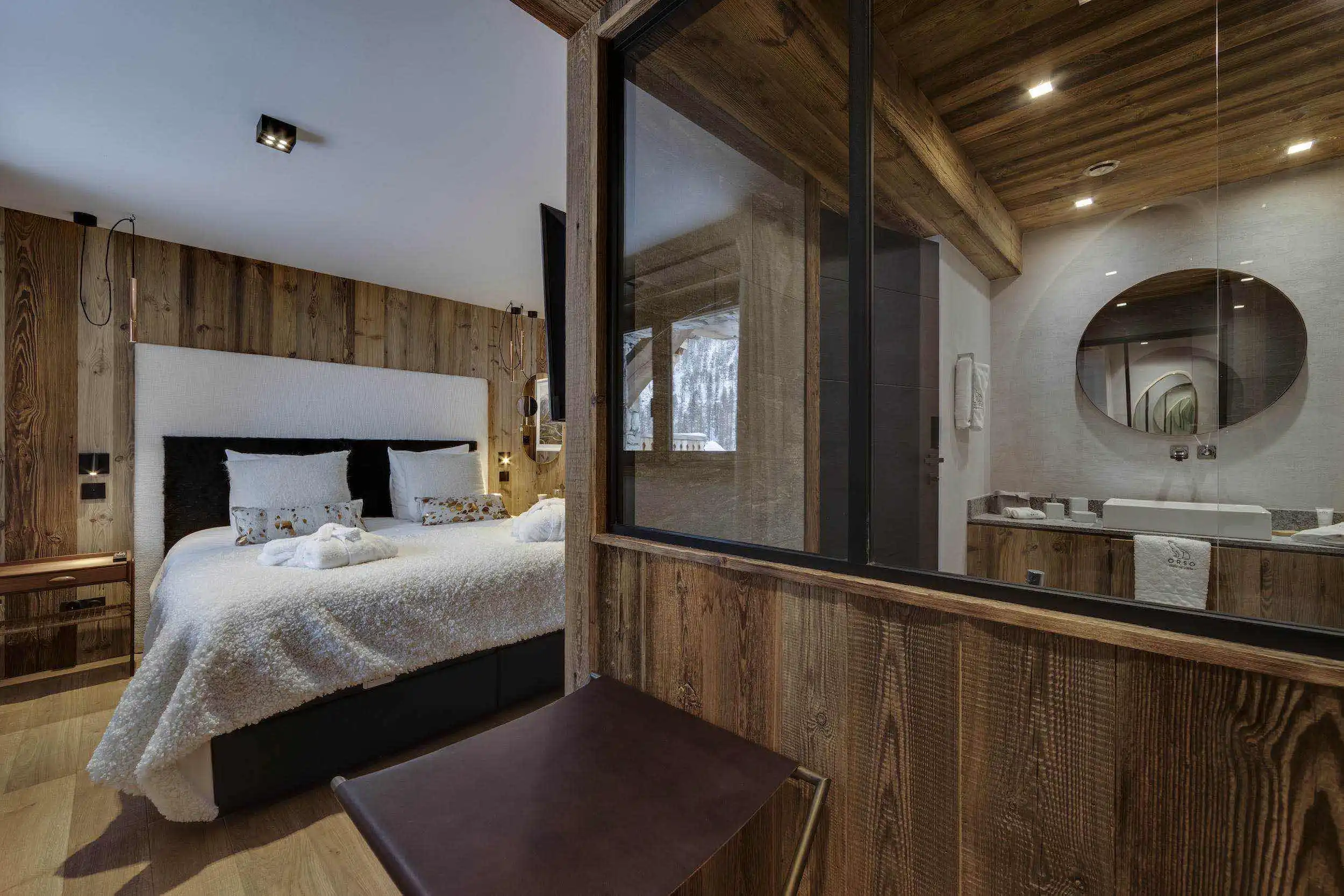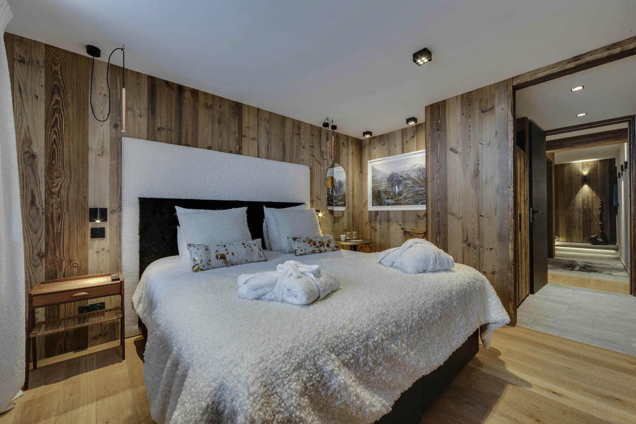 The sleeping areas of the chalet, in natural and warm tones, invite you to relax and fully benefit the surrounding serenity in a soft and silky environment. The bedding and furnishings have been carefully selected from the best craftsmen and suppliers, to guarantee peaceful and deep sleeps.
