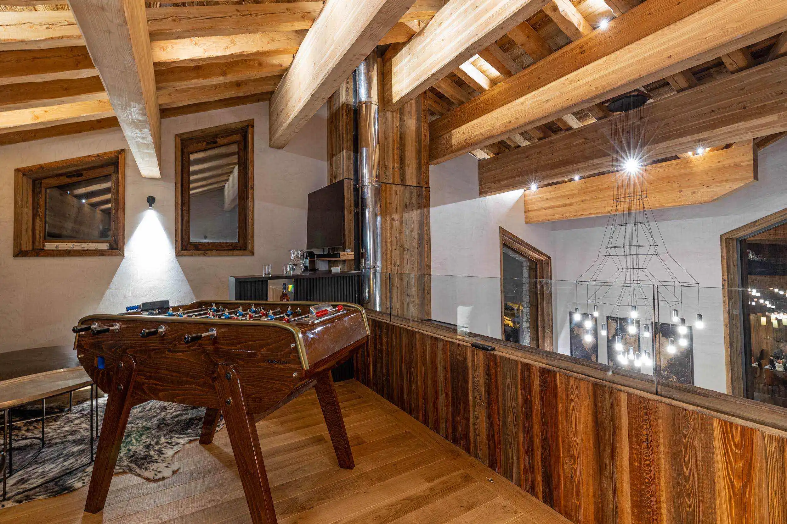 The architecture and decoration of the living room combine the authenticity of a mountain chalet with the modernity of cosy materials and equipment in a perfect balance.