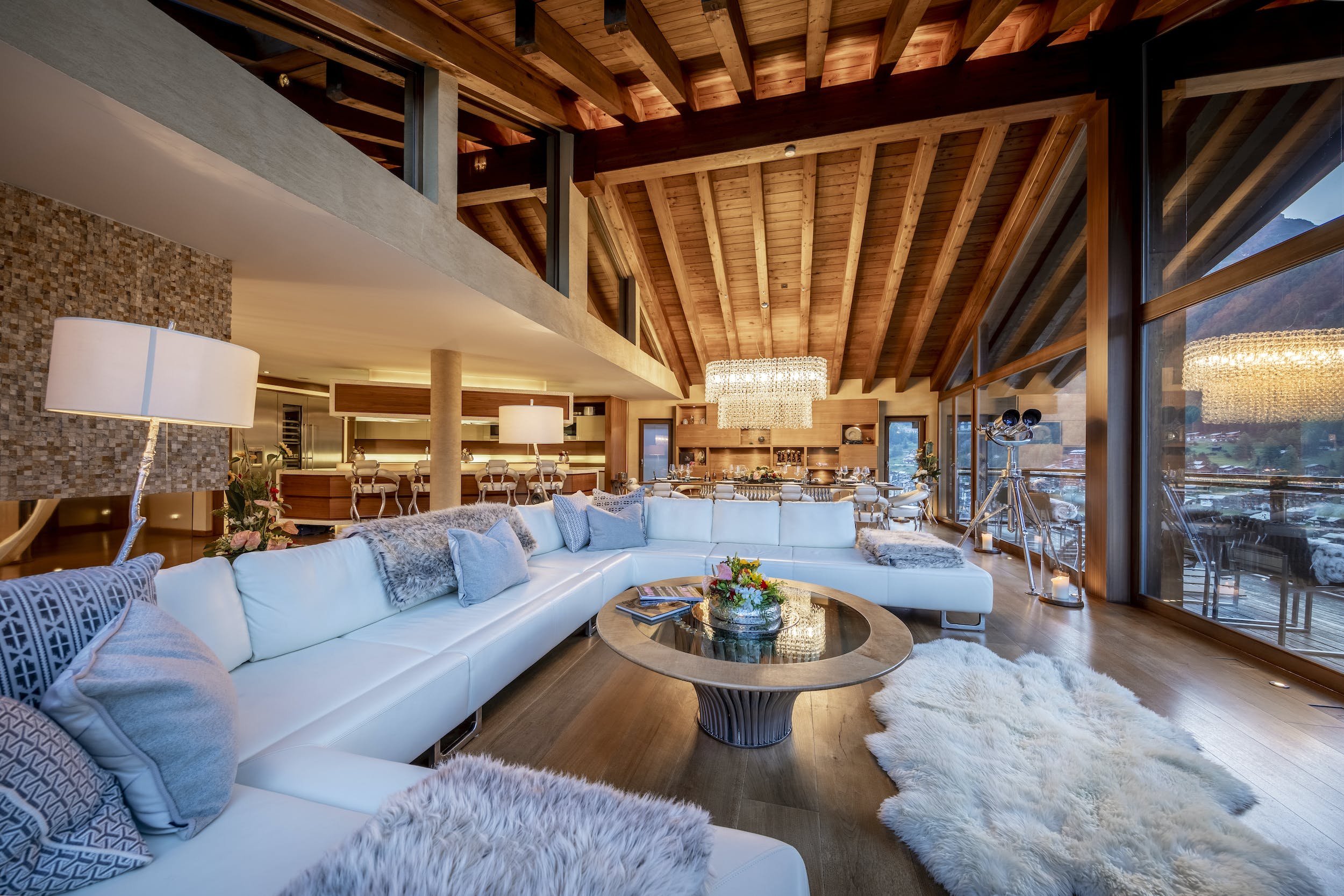 Large, modern, open-plan living spaces boast floor to ceiling windows, a glass roof, large wrap around sofa, open fireplace and unobstructed views of the enchanting village and the Matterhorn. The spacious living areas spill out onto the generous wrap around balcony, all framed by the most envied view in Zermatt.
