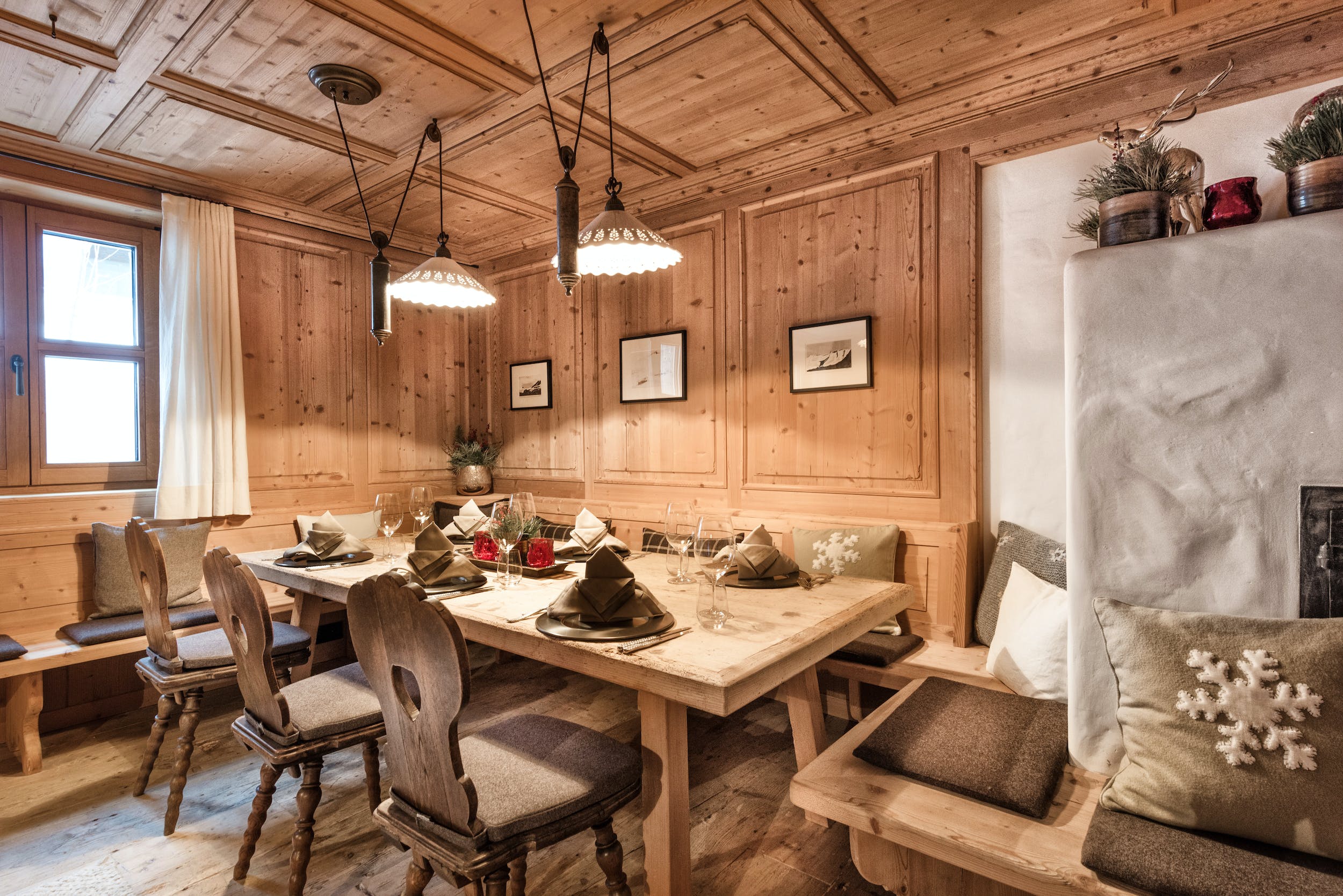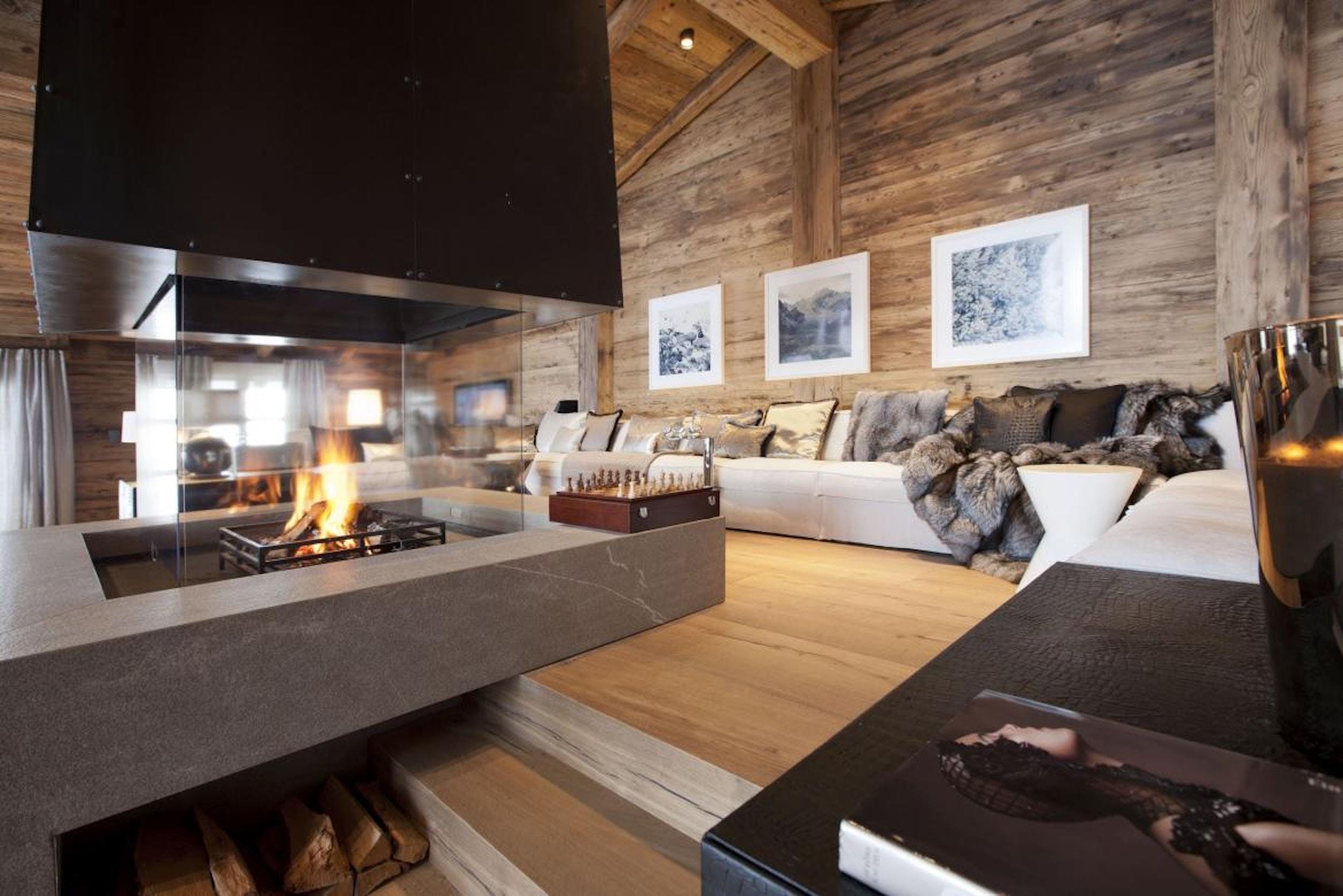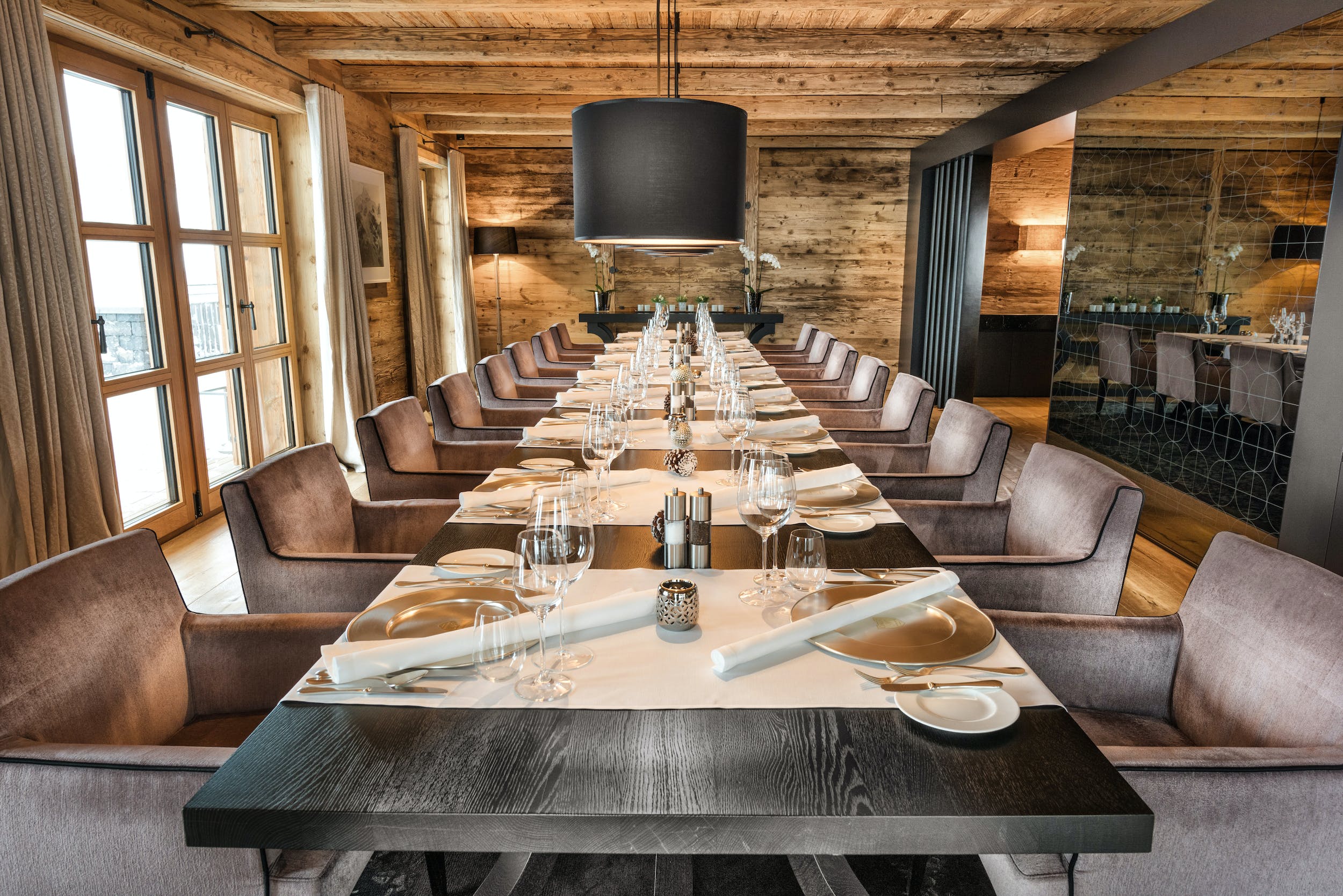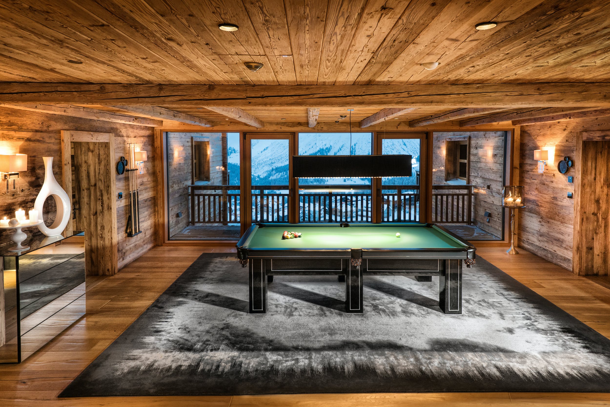 Gather for pre-dinner drinks in the spacious lounge, where light streams in through the floor to ceiling windows and the fire blazes brilliantly in the centre of the room. Afterwards, choose from the glittering private bar, the numerous cosy lounges, the pool table with a terrace and beautiful mountain views or the private cinema room with cosy sofa seating.