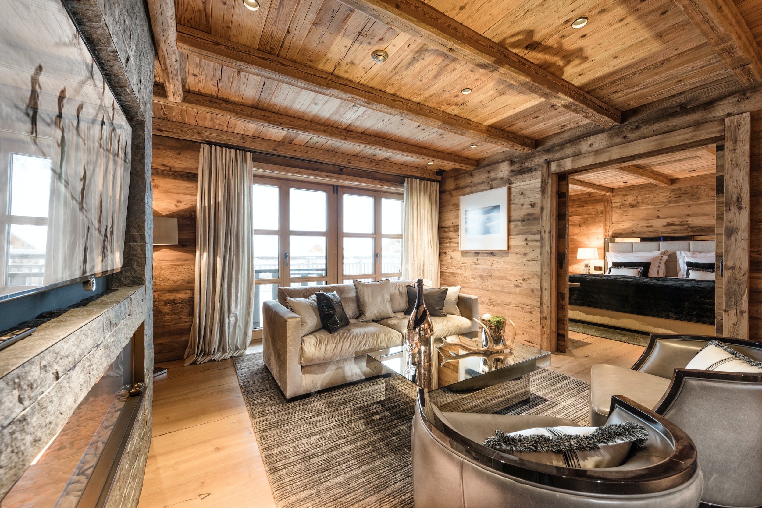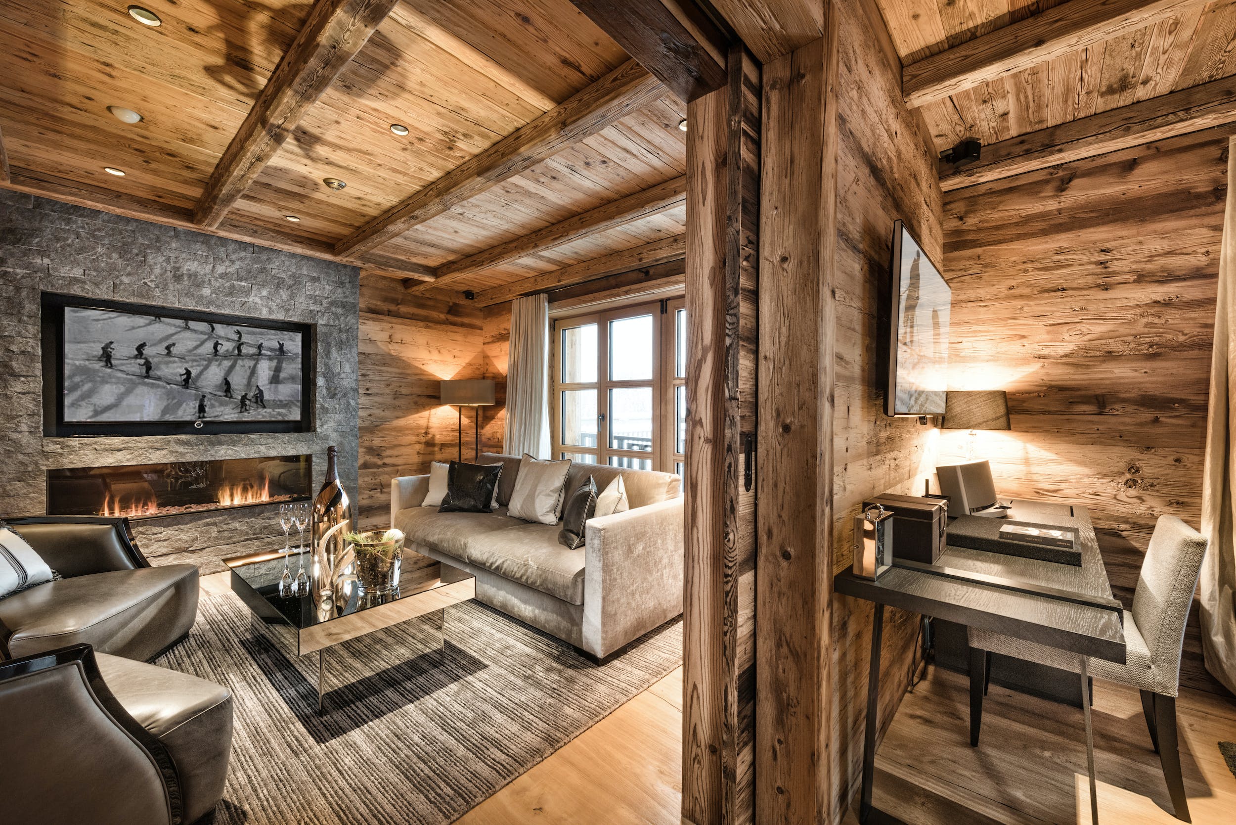 Large double suite with living area, dressing room, fireplace, a private balcony with stunning views of Lech and Oberlech, stylish bathroom adorned with full size Herm??s shower and bath products. 3D-TV and an IP-TV System with a selection of international channels and an audio system.