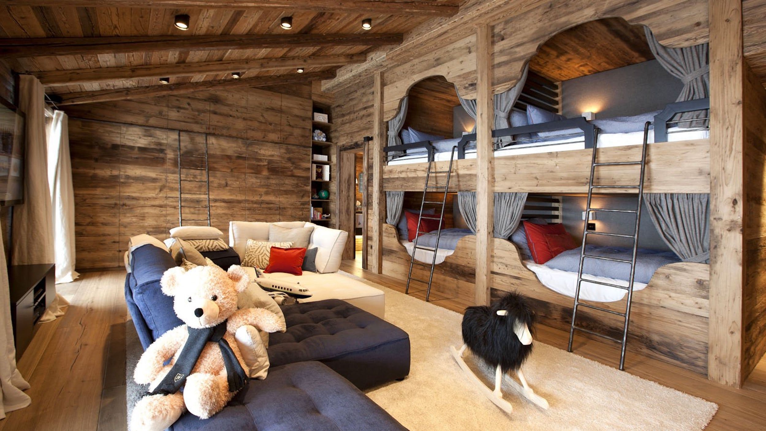 Children?s bunk room featuring 2 bunk beds, sleeping 4 children, a private balcony with stunning views of Lech and Oberlech, stylish bathroom adorned with full size Herm??s shower and for children there are bath products from Bulgari kids. 3D-TV and an IP-TV System with a selection of international channels and an audio system.
