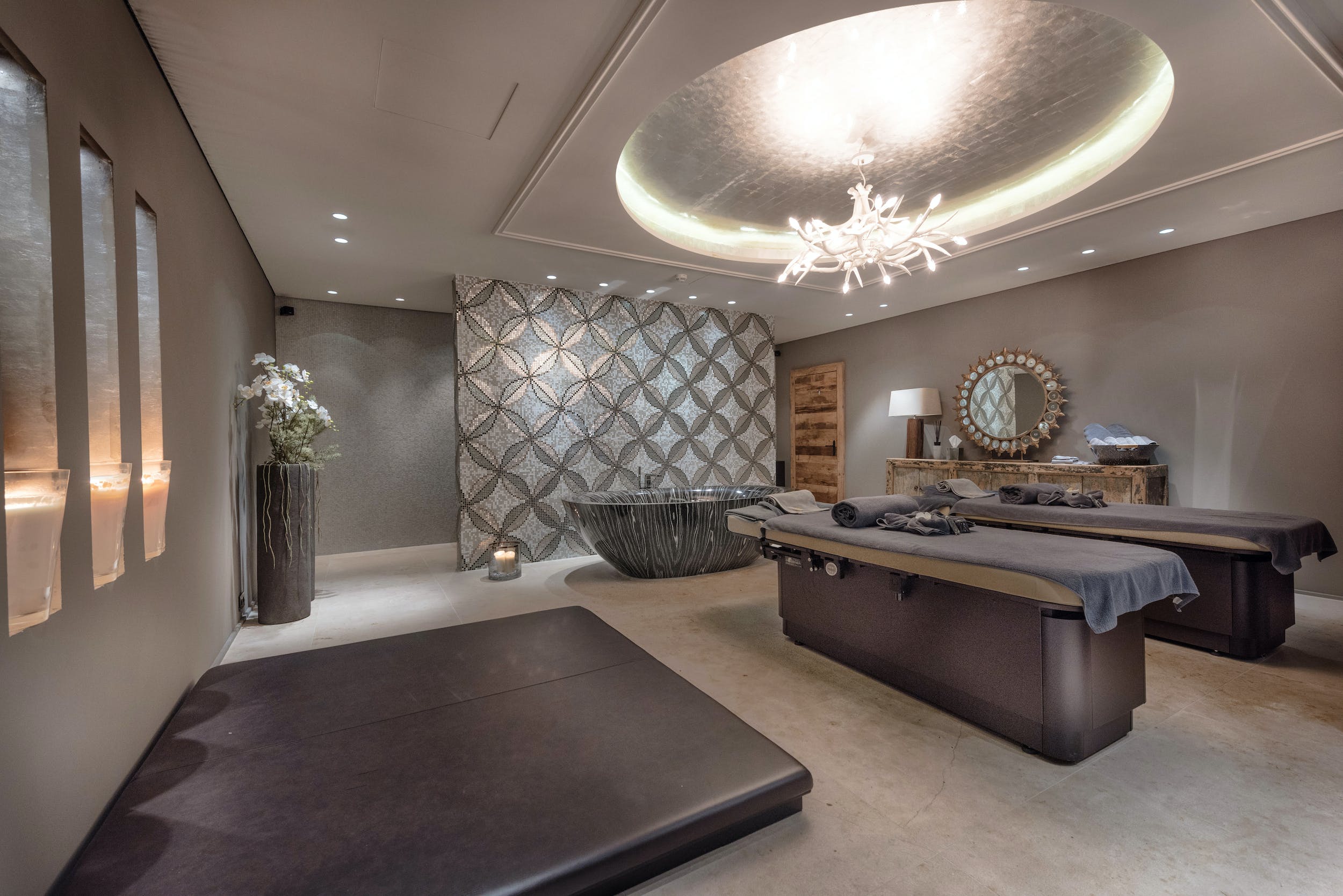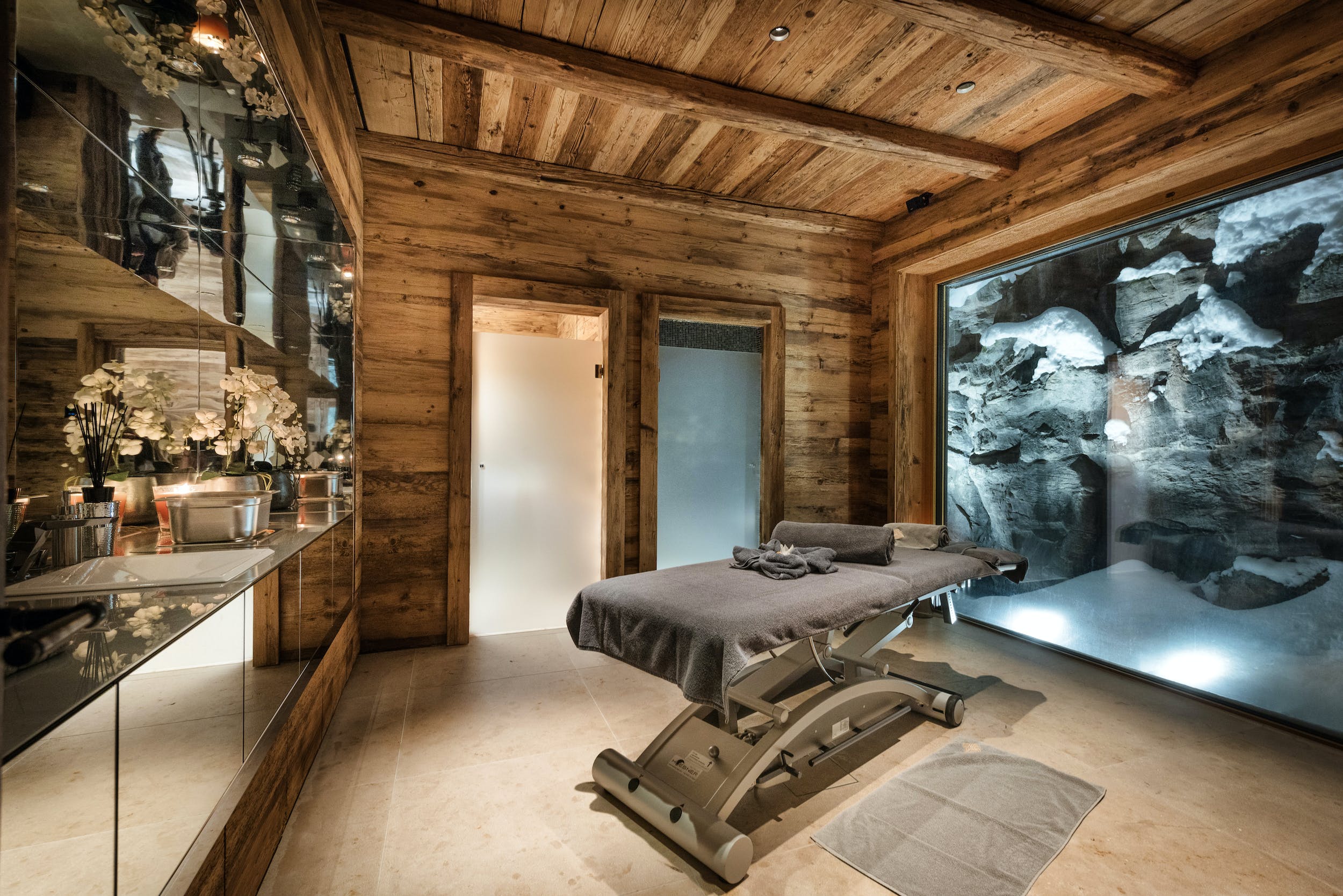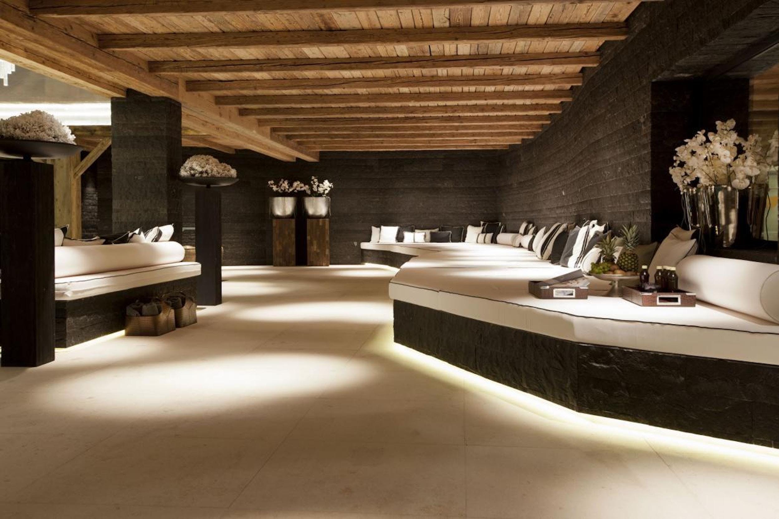 Chalet Oberlech is a welcoming sight as you return home from an exhilarating day on the slopes. Find refuge in the extensive spa area. Here, you and your guests can unwind in the large indoor pool, sauna, steam room, plunge pool and hot tub. Wide daybeds sweep around the edge of the pool and there are several treatment rooms besides where you can enjoy private treatments. The bright, well-appointed gym is also located on this floor.