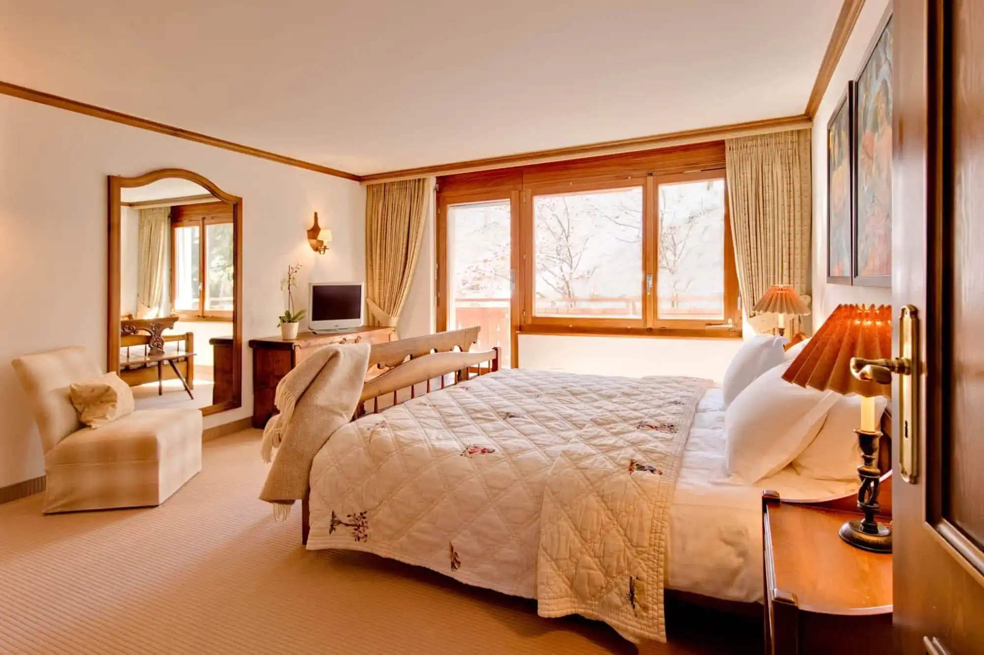 Second Floor – Spacious room with king size bed, TV, wardrobe, central heating, fireplace, marble en-suite bathroom with underfloor heating, access to south facing balcony with views of the majestic Matterhorn.