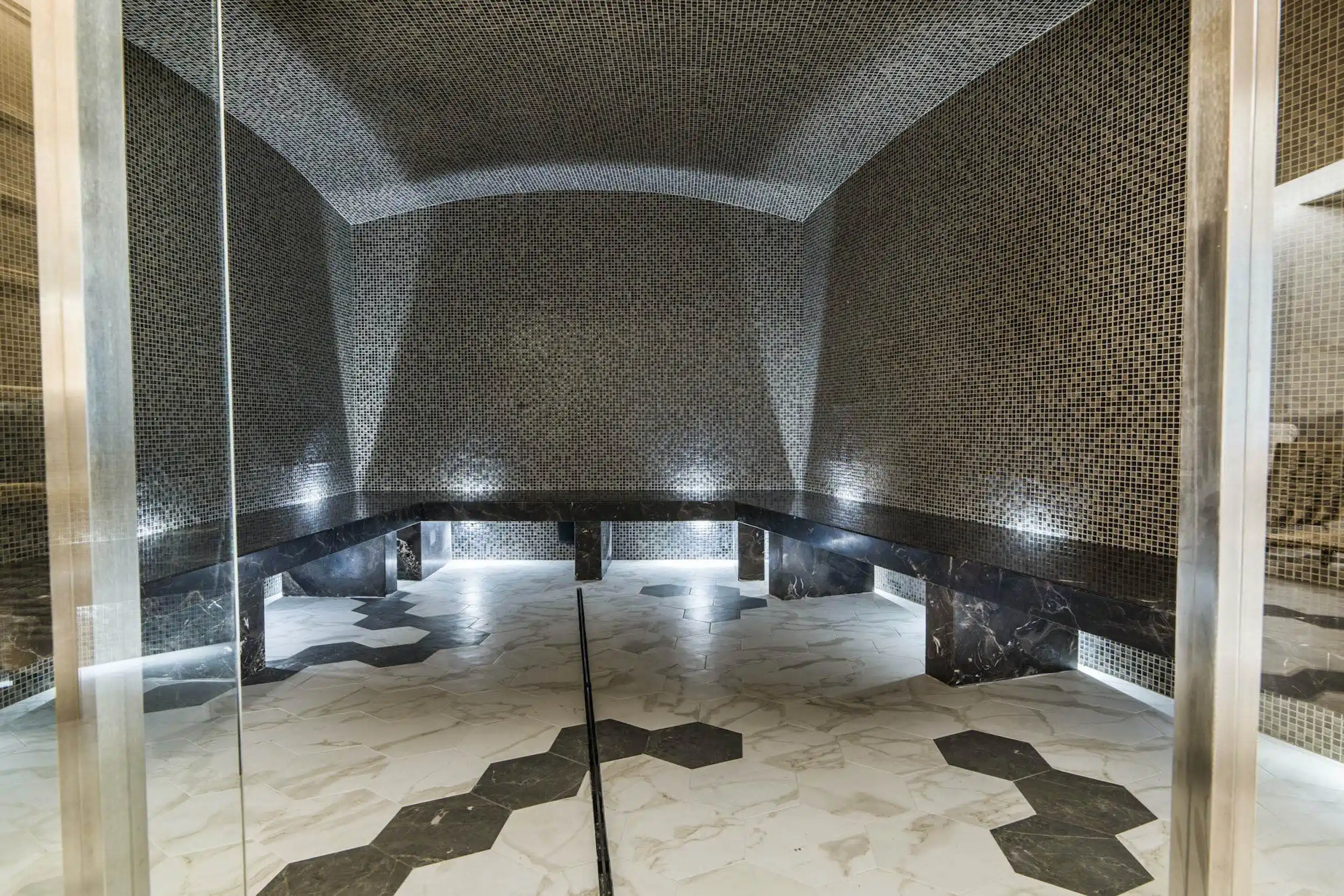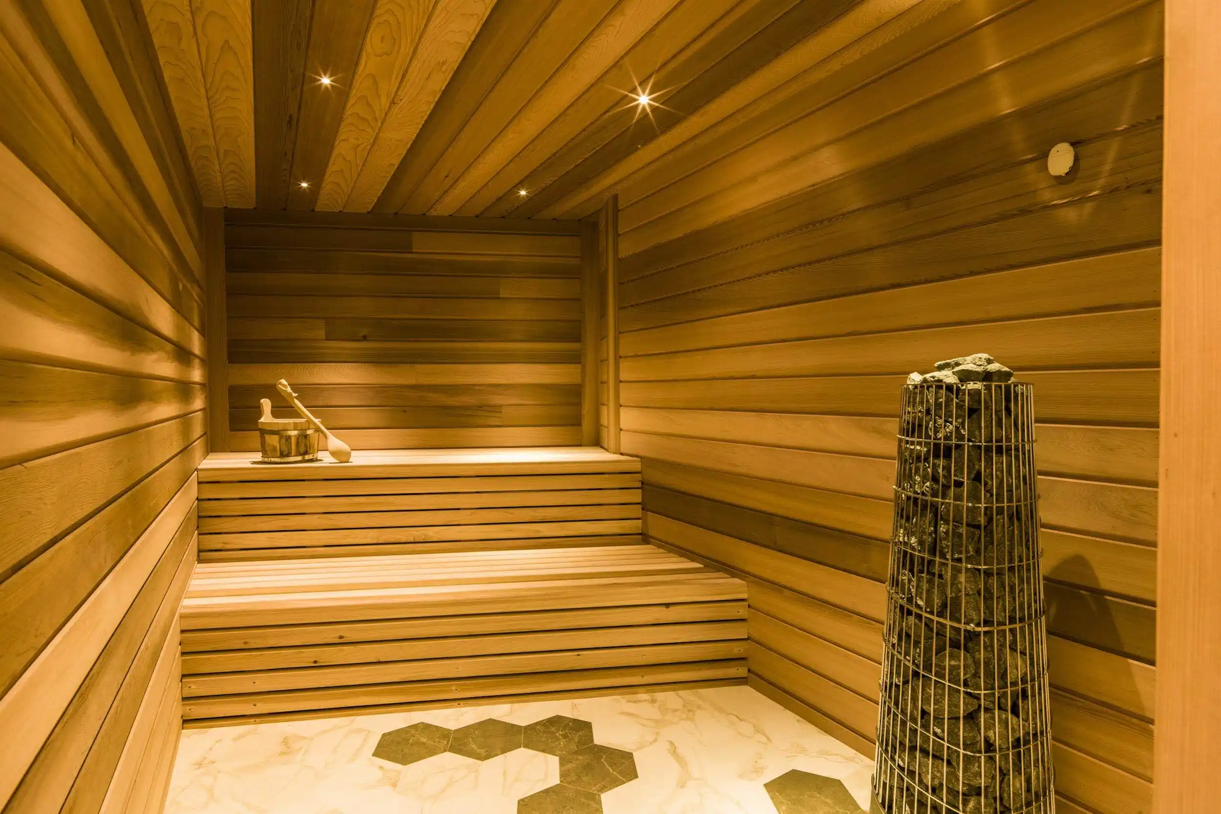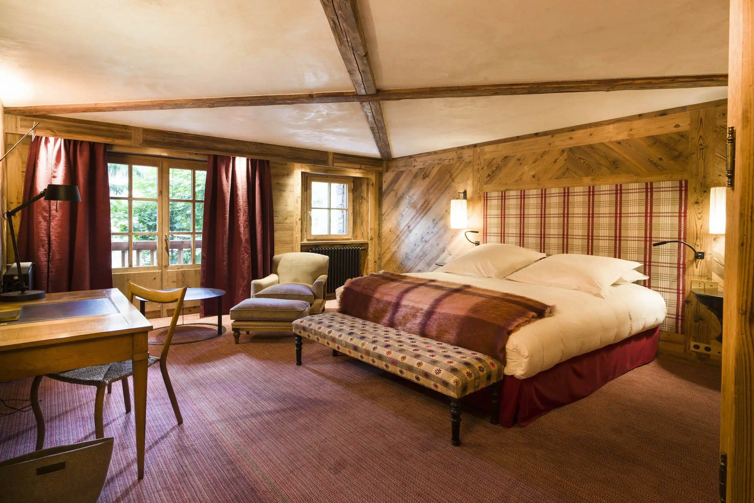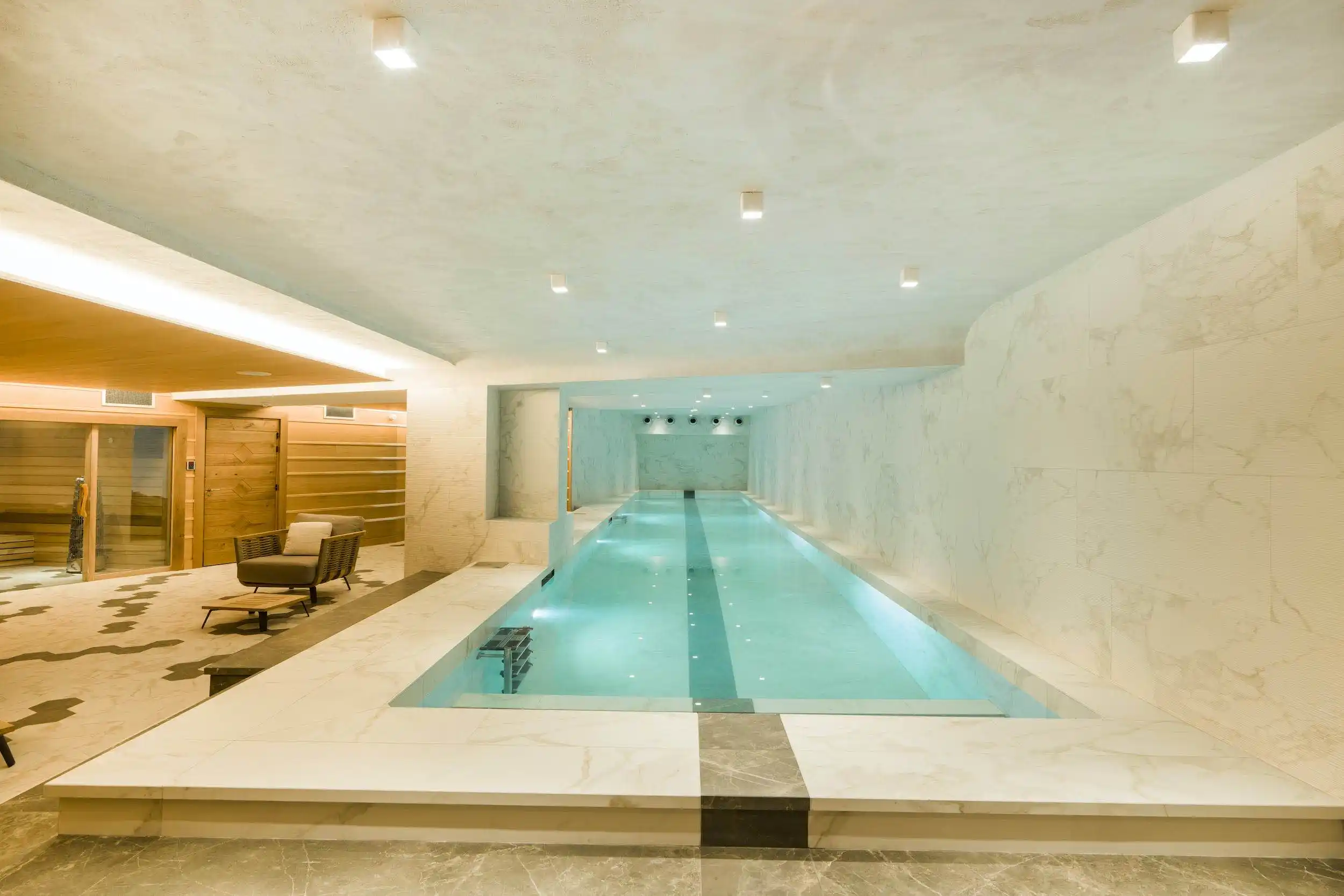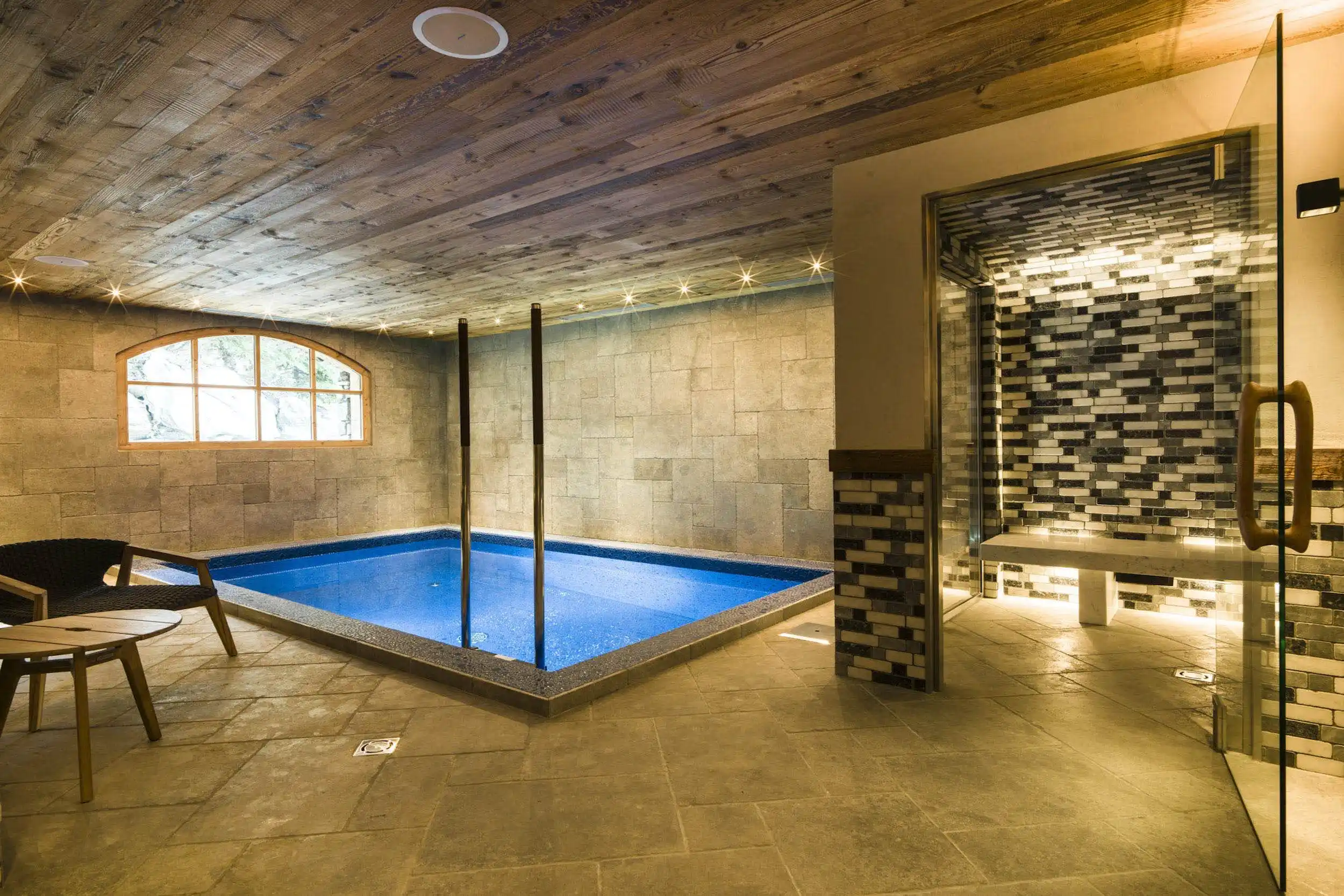 The ground floor features a spacious bedroom with a large bathtub and double sink, as well as the chalet’s wellness center, including an indoor swimming pool with counter-current, steam room, sauna, and massage room. The ski room is also located on this level.