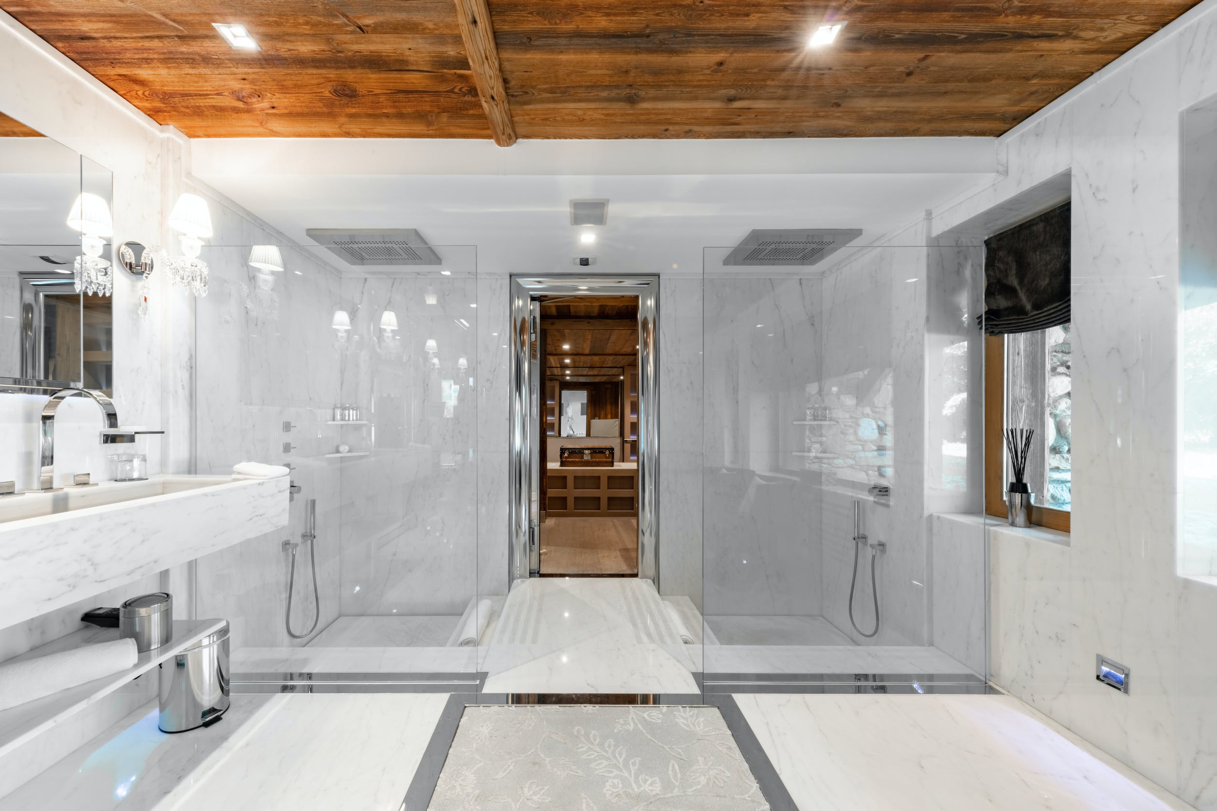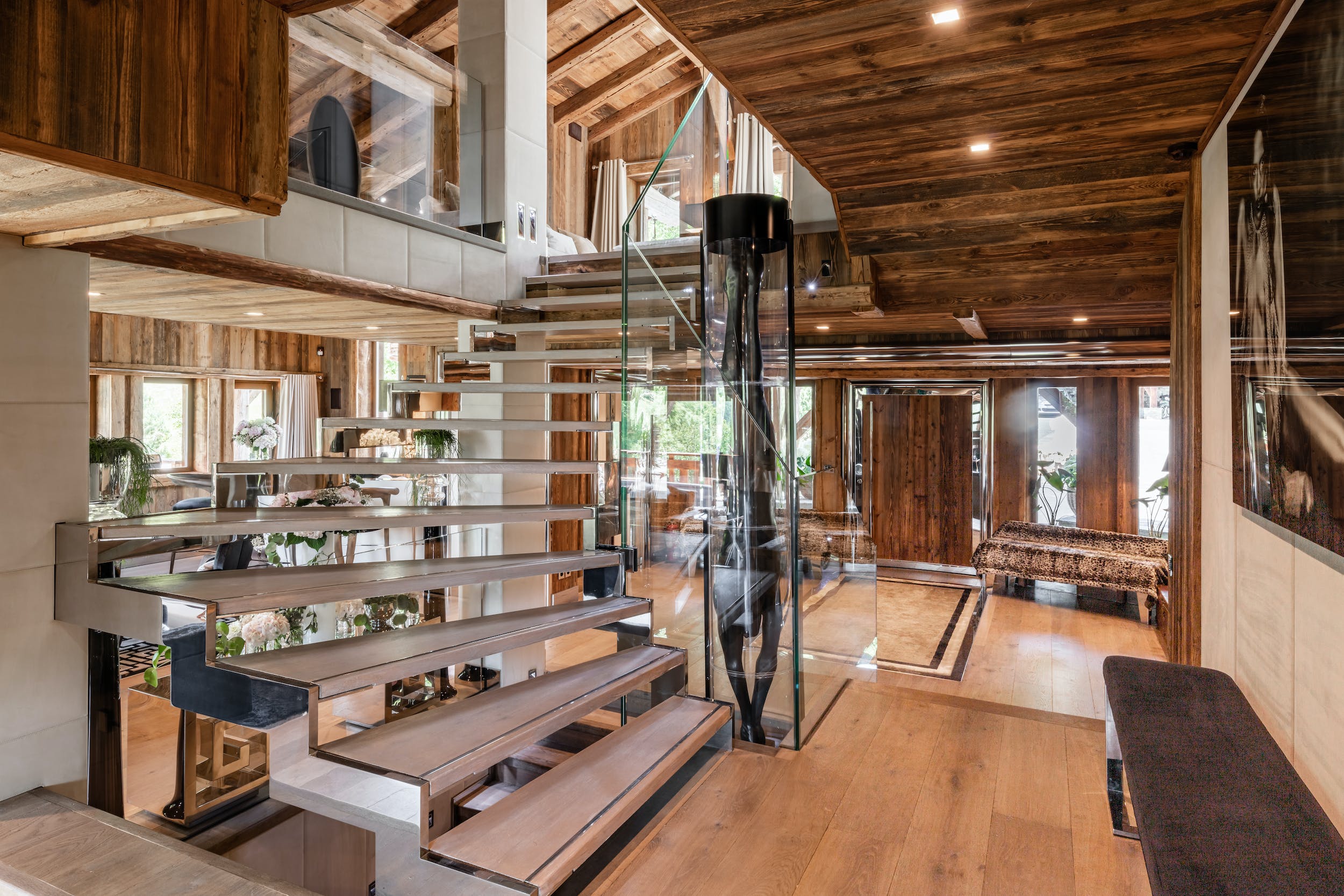 Comprising the main house and the wellbeing centre, Chalet Sanctuary’s 1,500m2 offers idyllic accommodation for up to 18 guests. From its secluded location above Demi-Quartier, you are treated to commanding views across the valley to the mountains beyond and Mont Blanc.