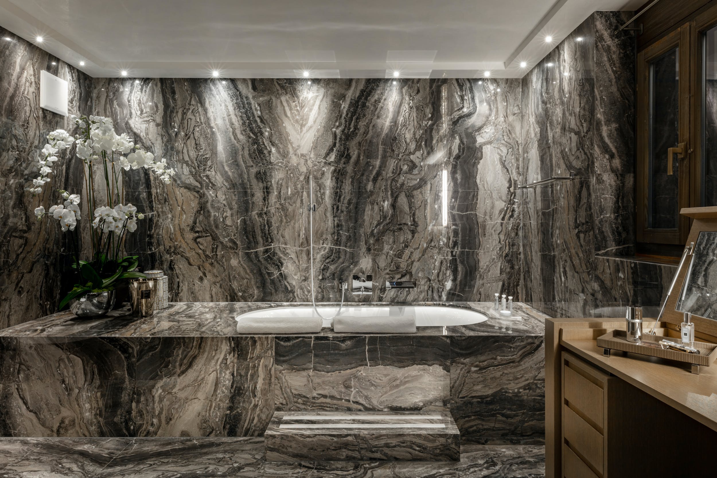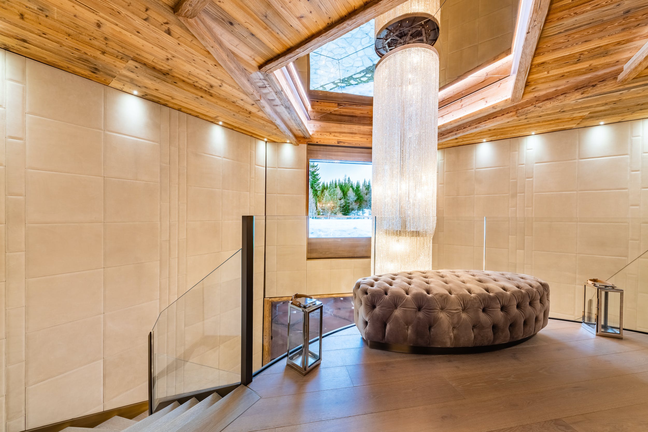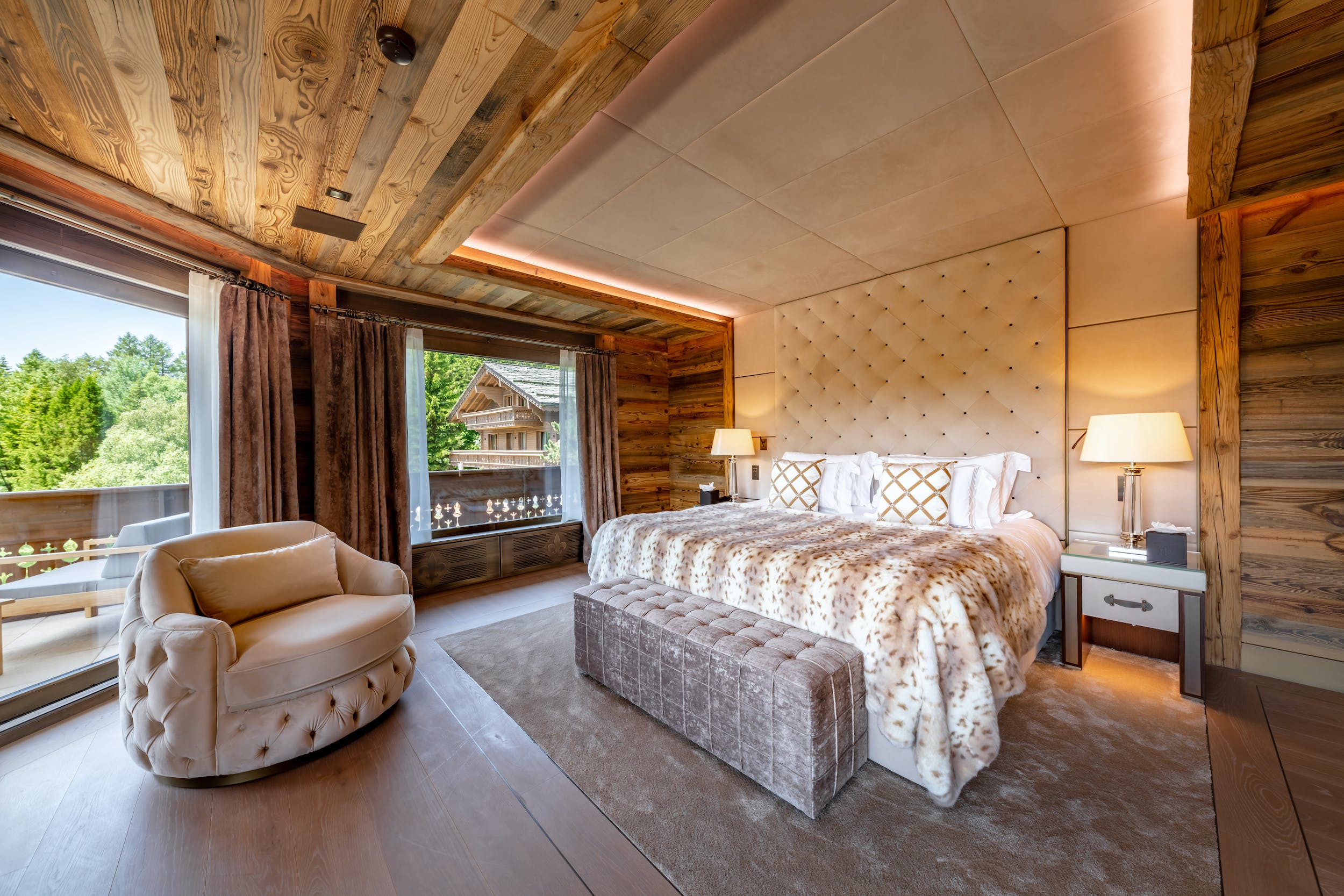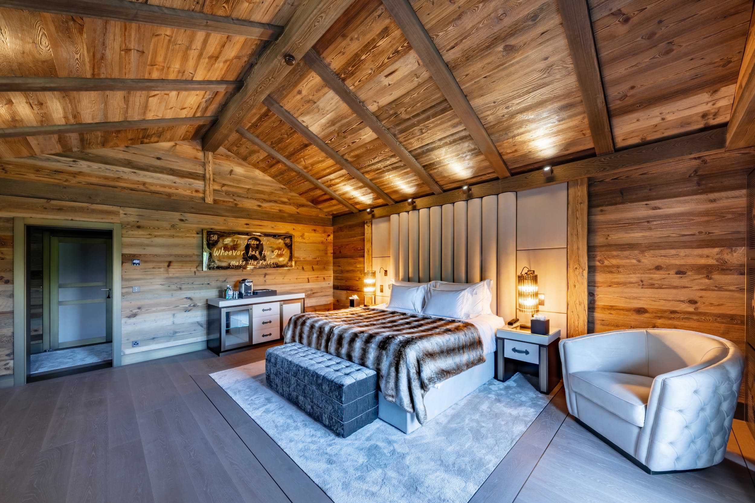 Chalet Valais’s sophisticated interiors nod to the Alpine vernacular with characterful timber ceilings, cozy furs and magnificent mountain views at every turn. Up to 26 guests can be accommodated here. The eight master suites all boast private dressing rooms, sophisticated bathrooms and gorgeous balconies. Plus, there are two children’s dormitories which can host up to ten children.