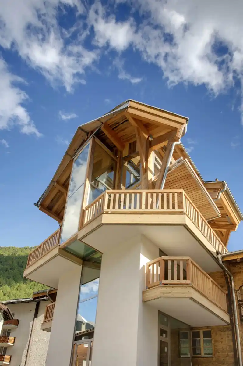 The foundation of this magnificent retreat is an original Valais house dating back to the 1940s. The current owners have skilfully enhanced the structure by adding two contemporary floors, all while preserving the traditional essence of a chalet. The extension exquisitely showcases local larch wood and incorporates an abundance of glass, providing an unobstructed 360-degree panoramic view of the village and the majestic Matterhorn summit.