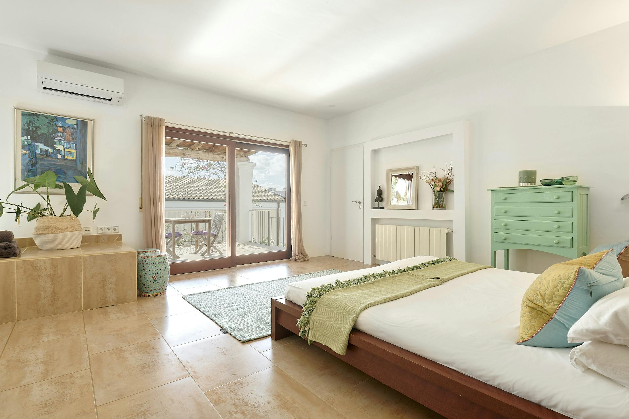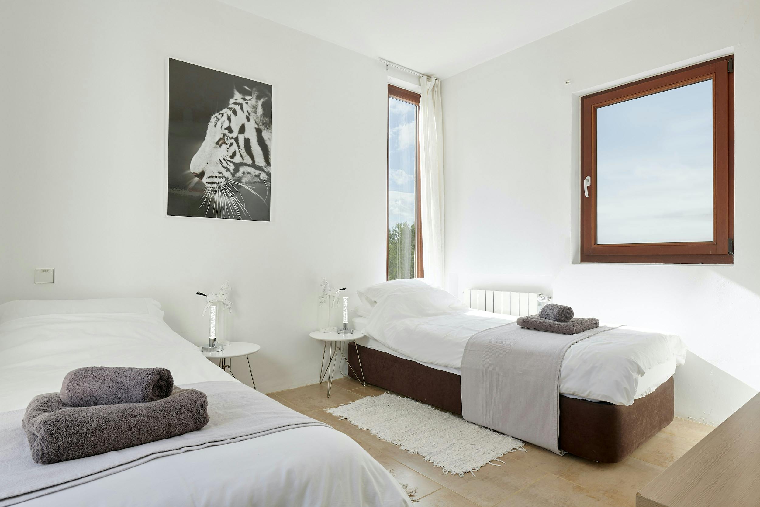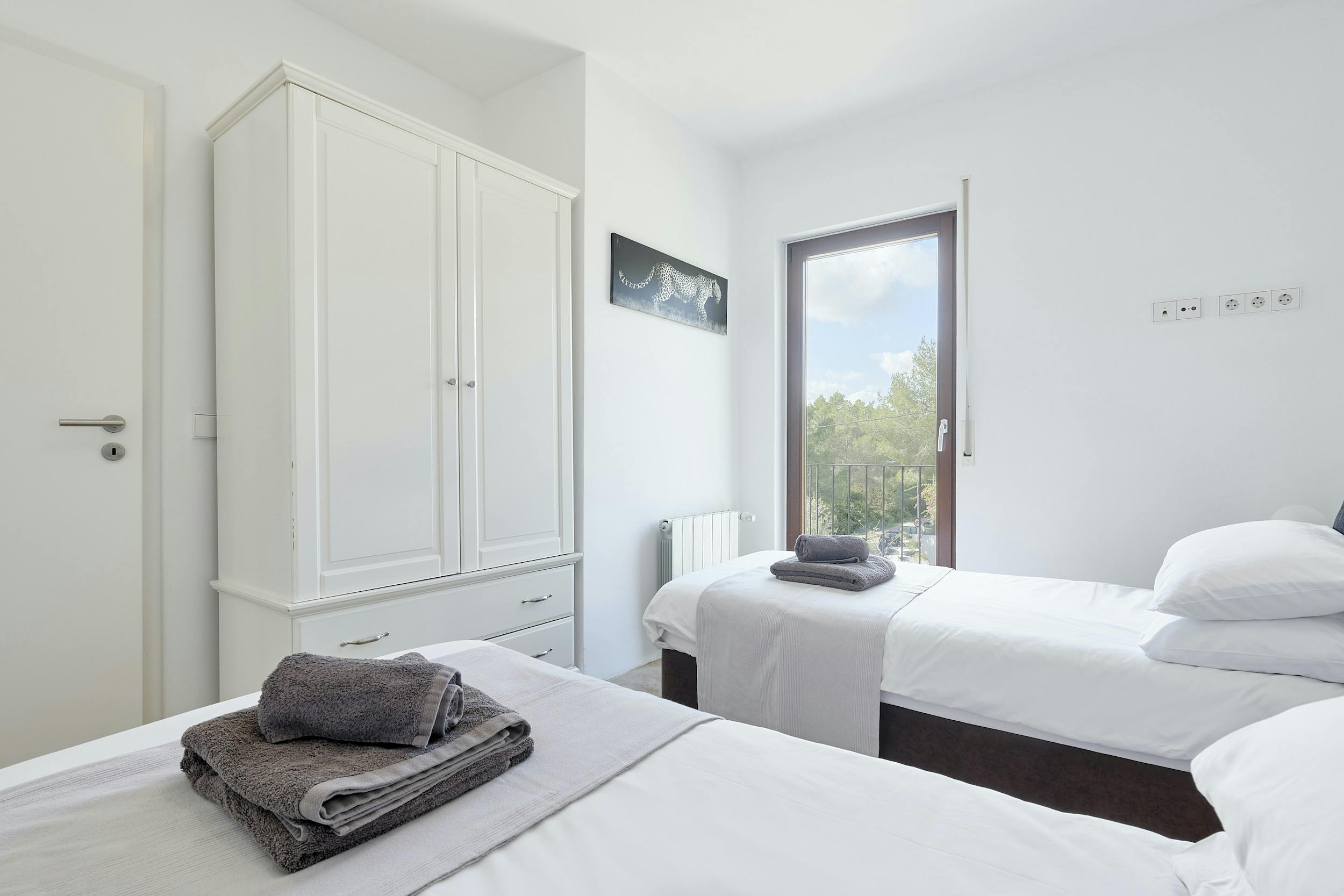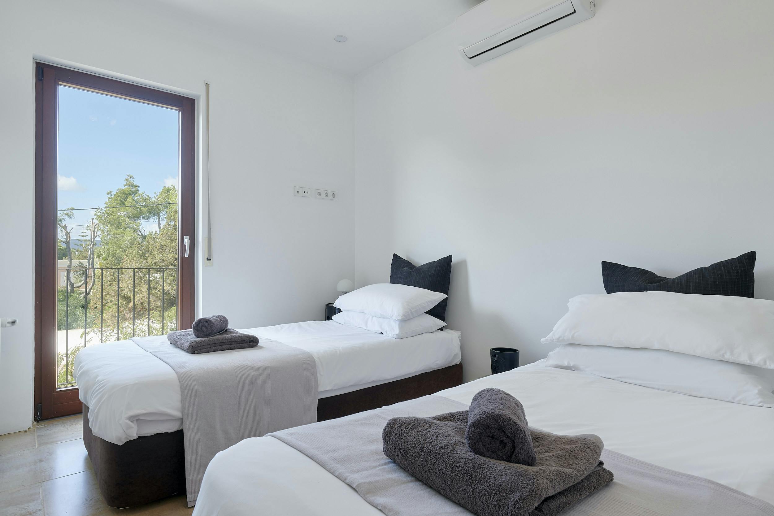 Twin beds, air conditioning, access to terrace with lovely views to Santa Eulalia church and countryside. Shared bathroom with bedroom 2 featuring a large walk-in shower.