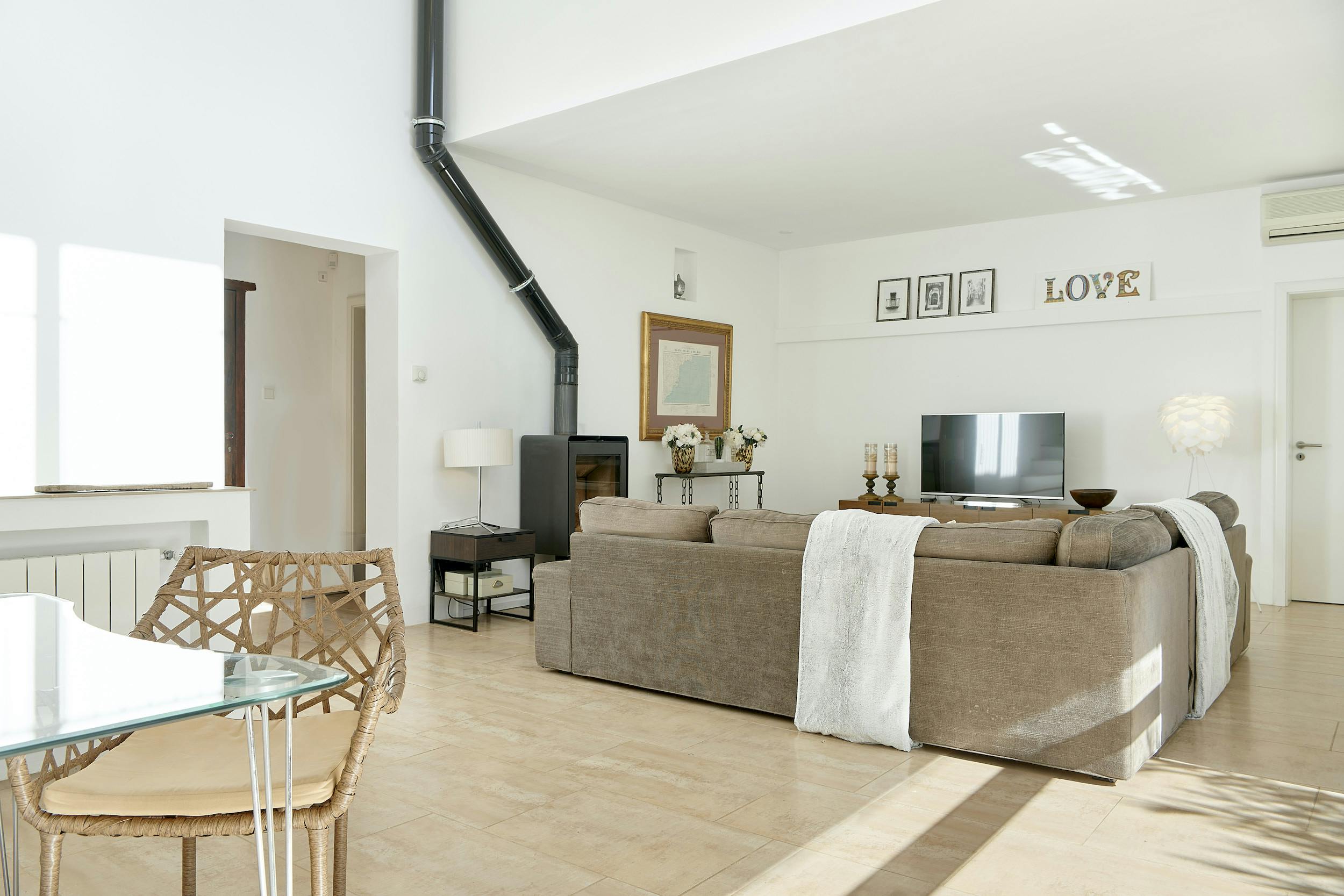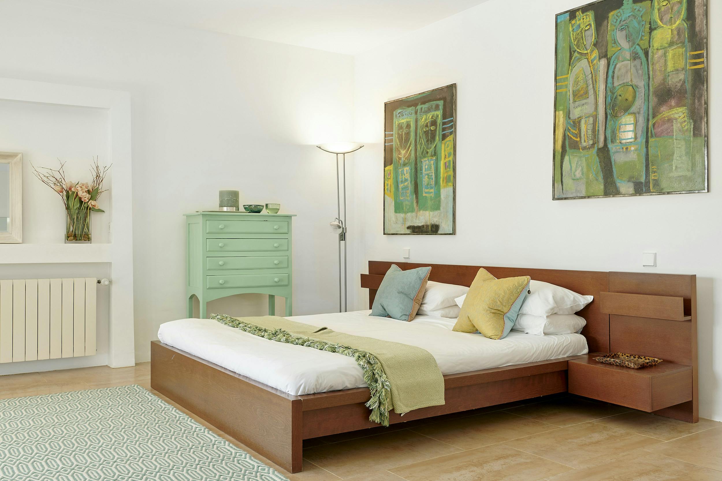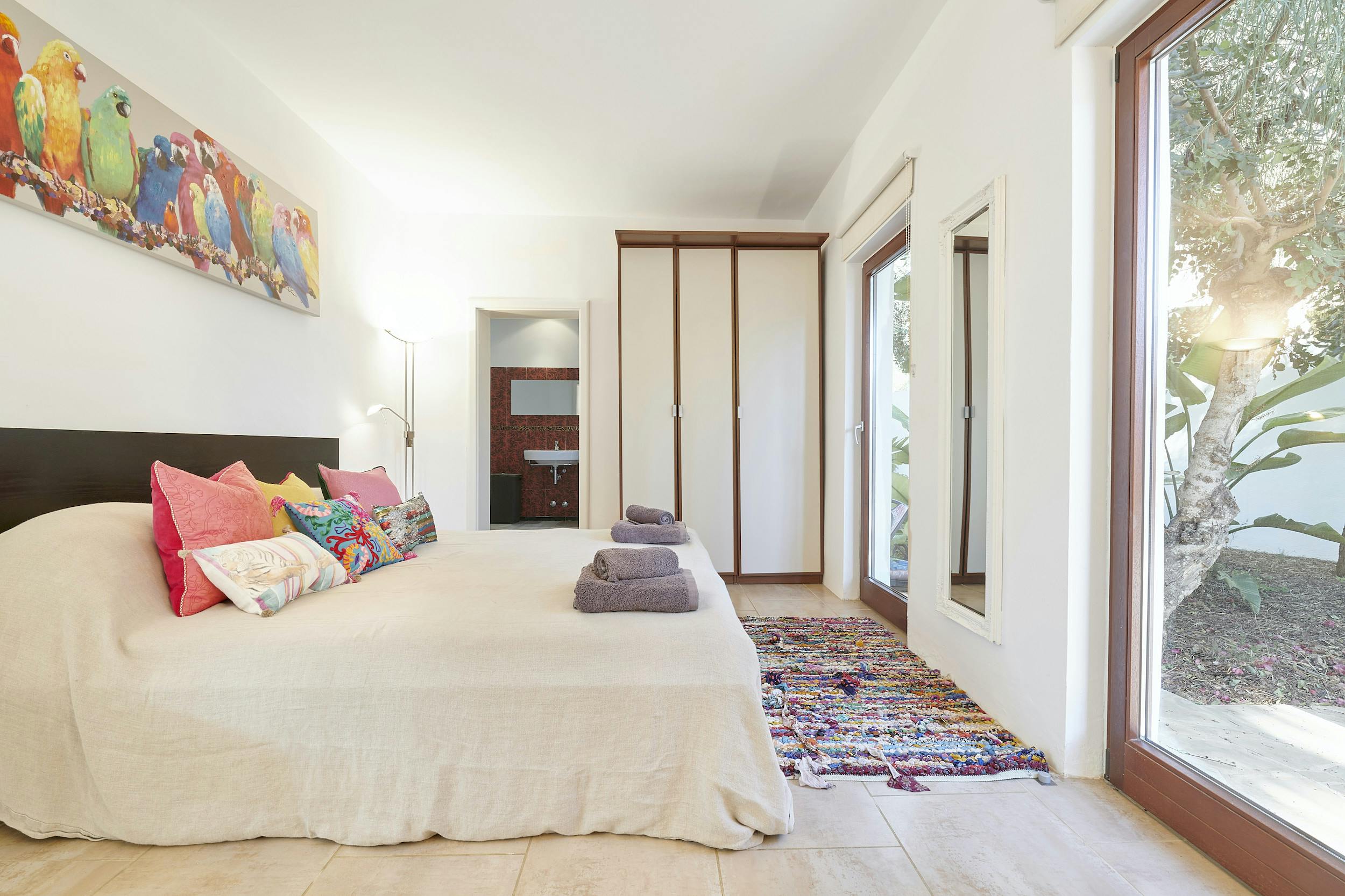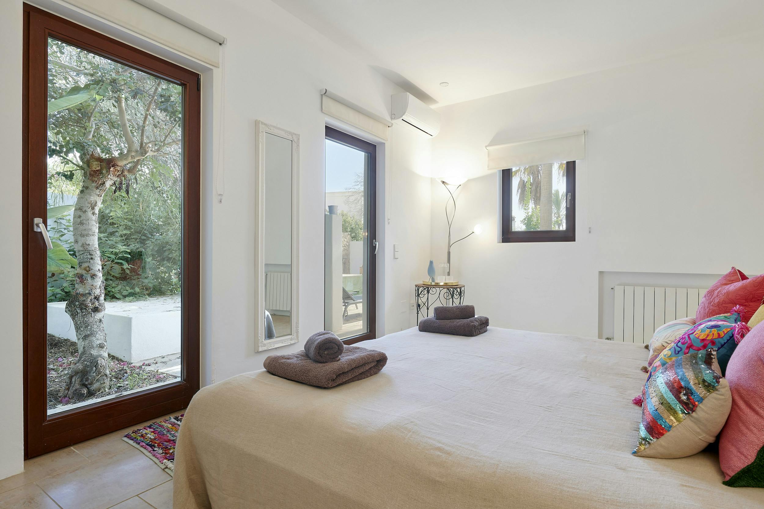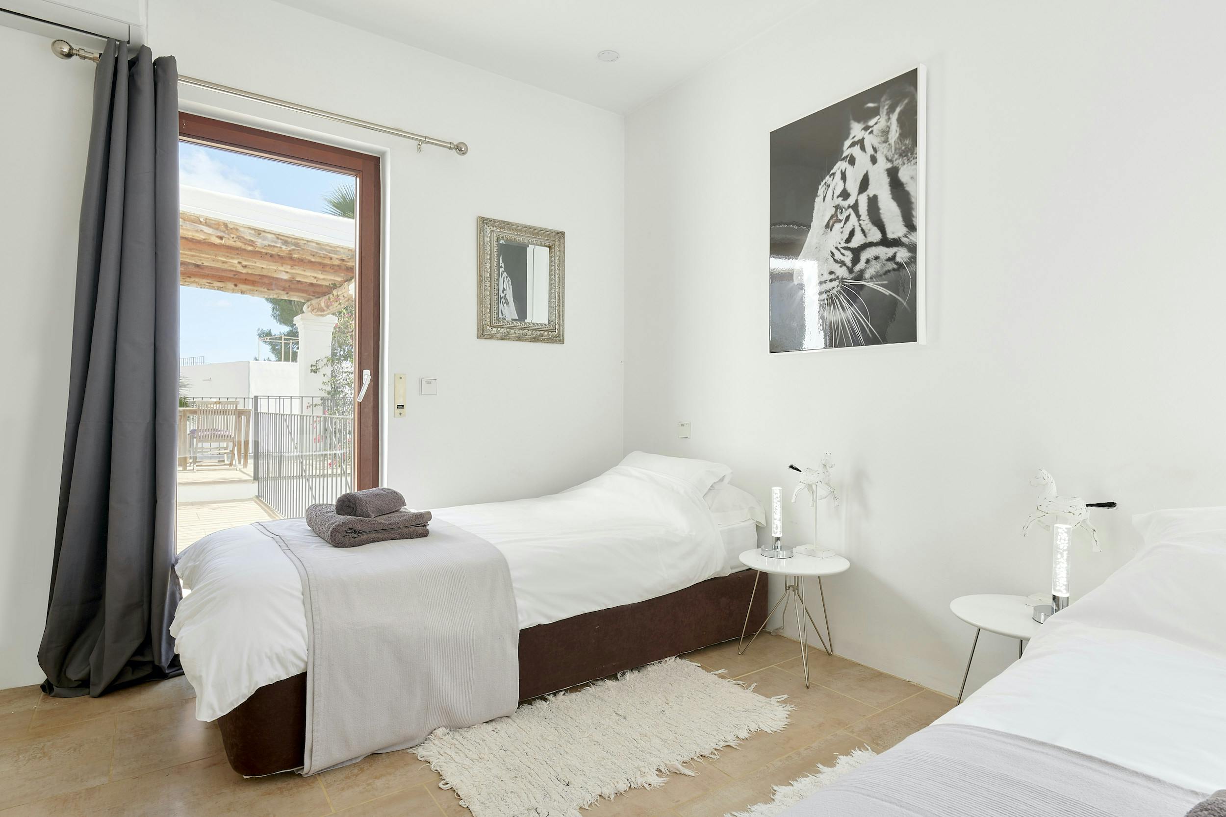 Twin beds, air conditioning, access to terrace with lovely views to Santa Eulalia church and countryside. Shared bathroom with bedroom 2 featuring a large walk-in shower.