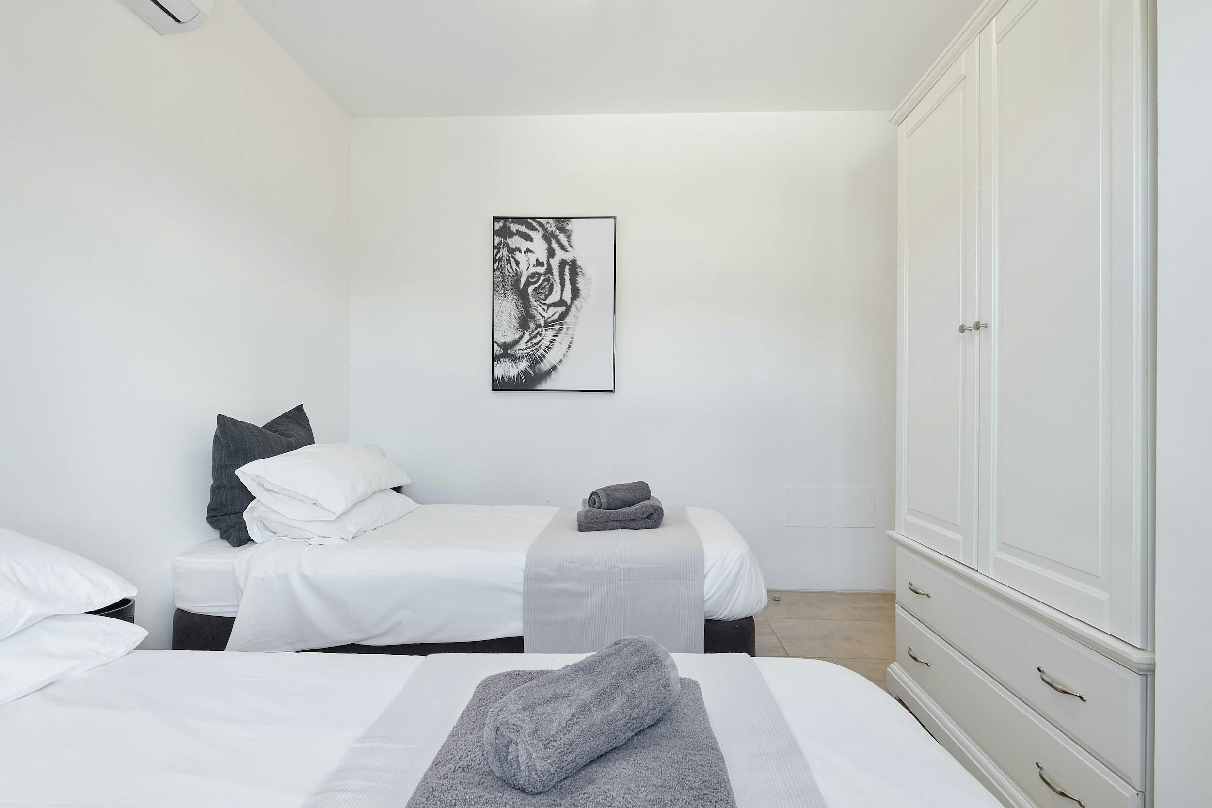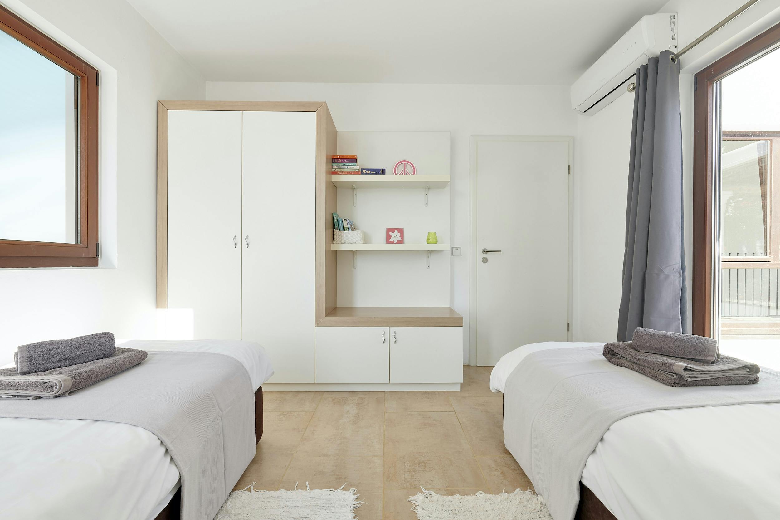 Twin beds, air conditioning, small balcony. Shared bathroom with bedroom 3 featuring a large walk-in shower.