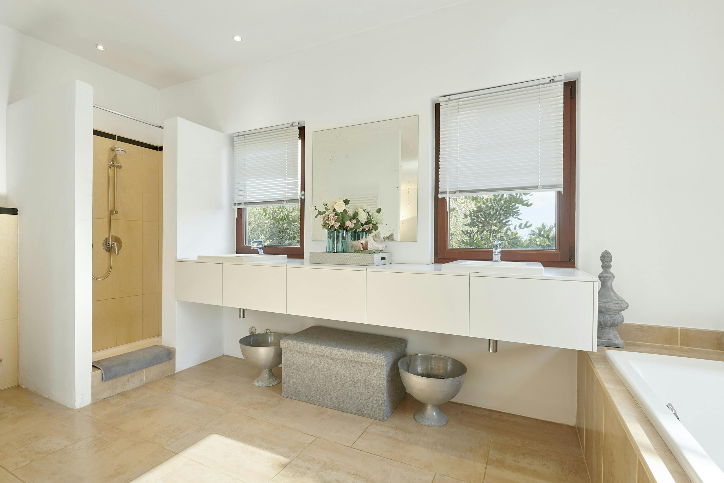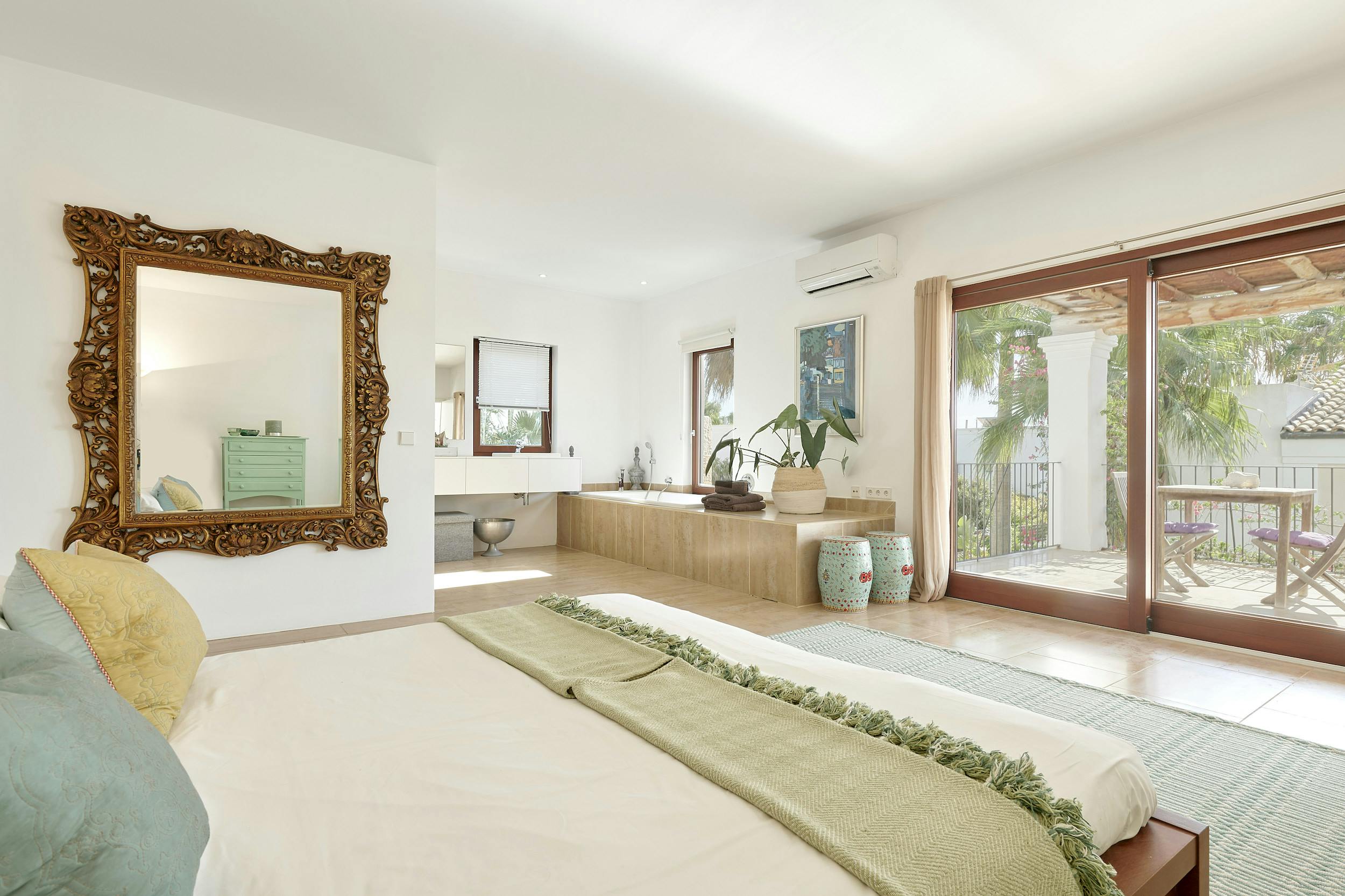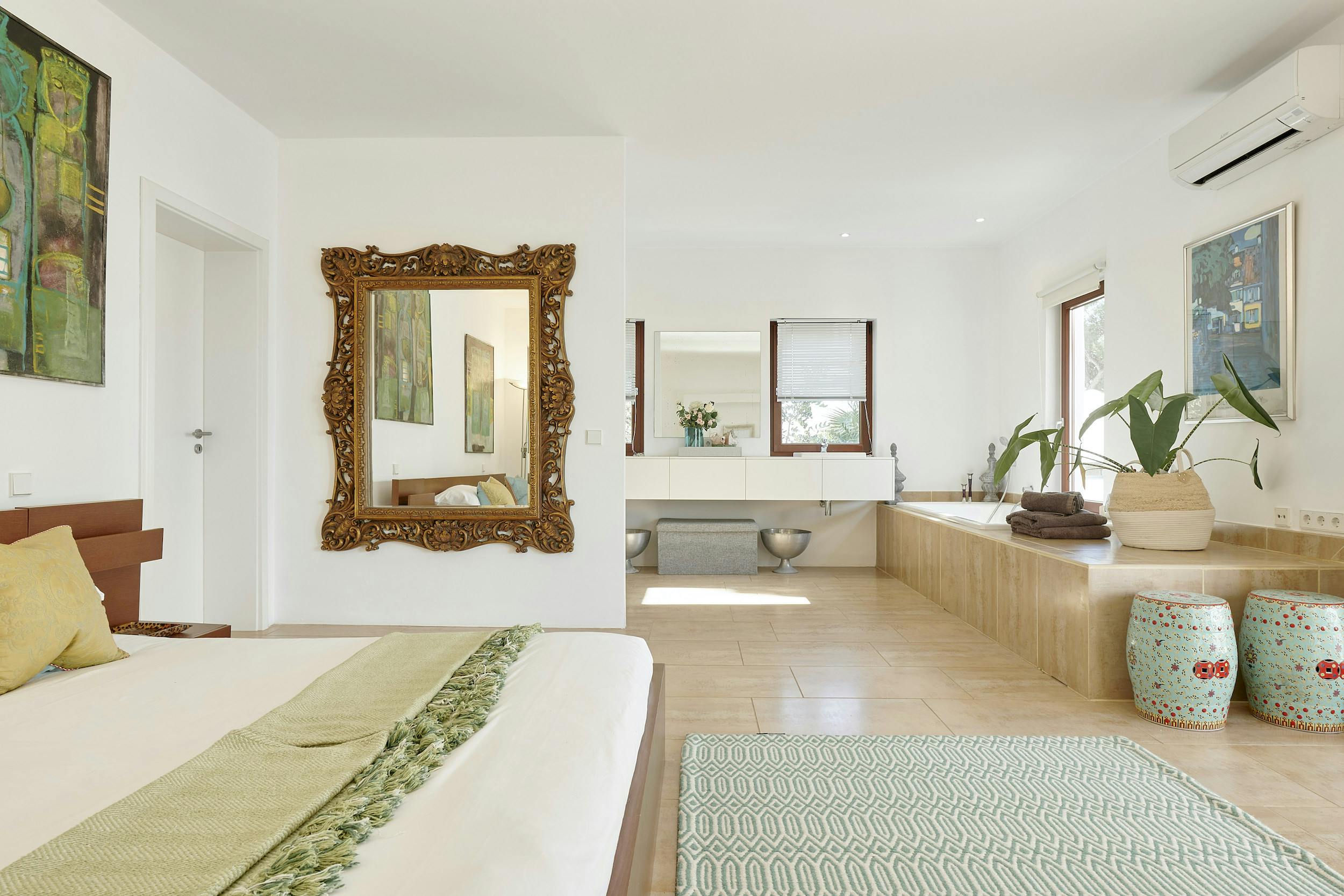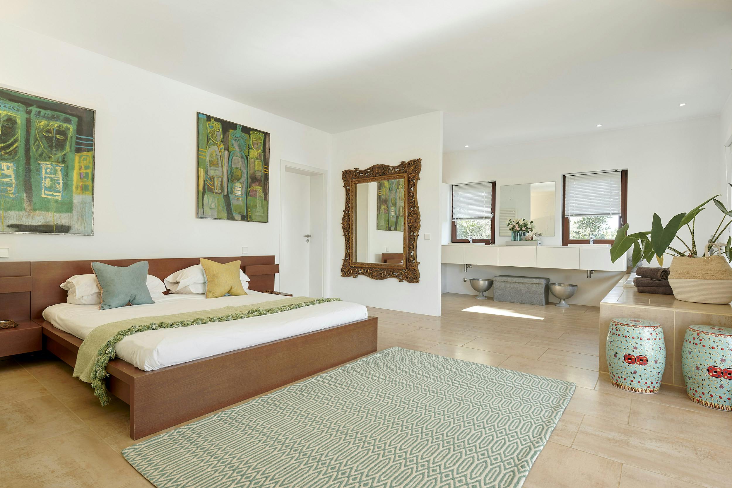 King size bed, air conditioning. Large open plan en-suite bathroom with walk-in shower, oversized bath and views overlooking the pool. There are sliding doors out onto a large terrace with distant views down to the town and sea.