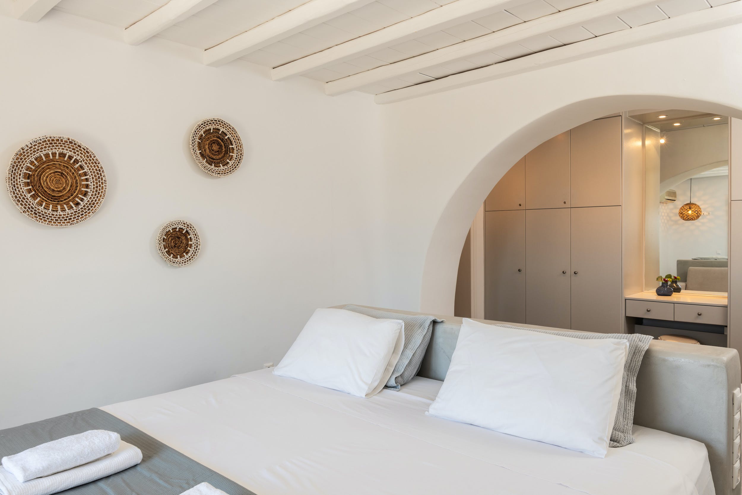 Main House Upper Level – Super-king size built-in bed, air conditioning, large wardrobe featuring a safe box, en-suite bathroom with shower, desk area, spectacular sea views from bed and access to 2 private patios. (2 guests)