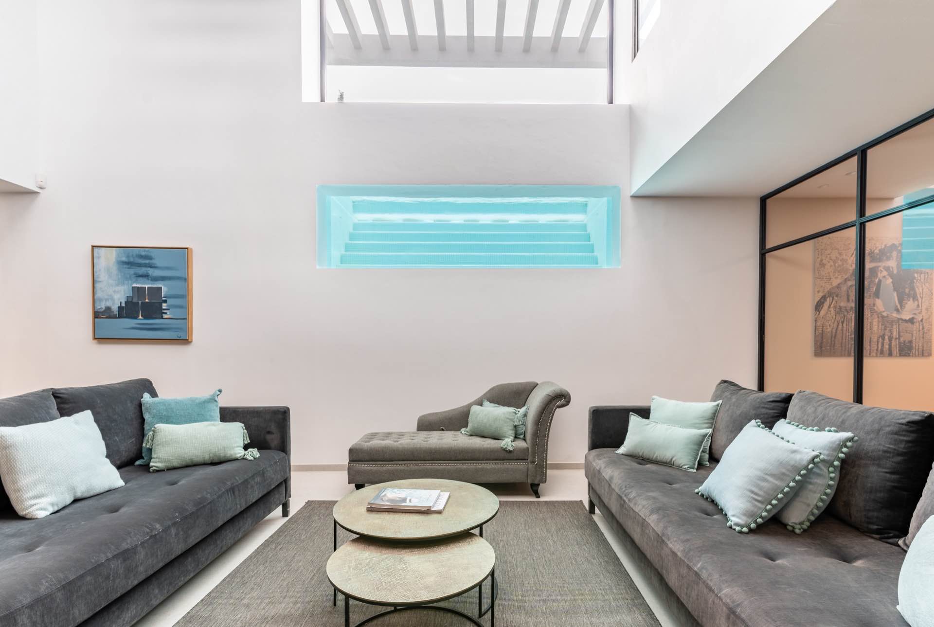 ✔ Private gym, sauna & cinema room—your own wellness retreat.✔ Lounge with dramatic open sightlines to upper floors and views of the illuminated pool.✔ Four-car garage, utility and storage rooms for total convenience.