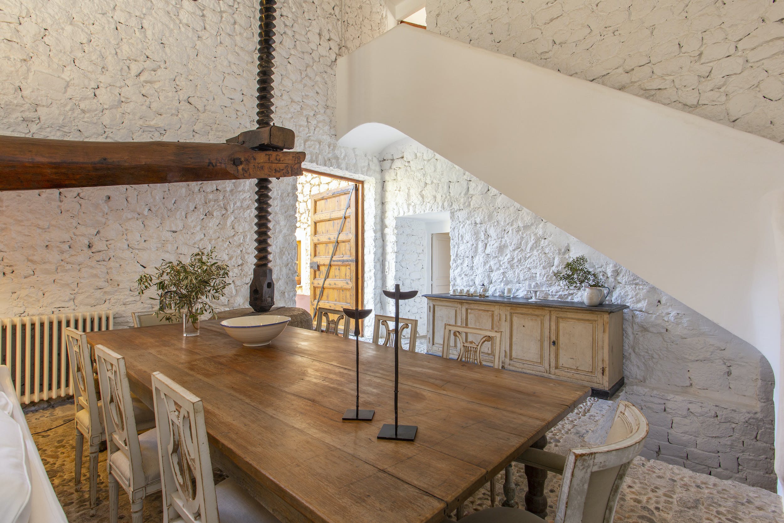 Step into a soaring double-height living room wrapped around a historic oil press, with a cosy fireplace and stylish lounge. The interiors flow seamlessly into a fully equipped kitchen and elegant dining room overlooking the gardens.