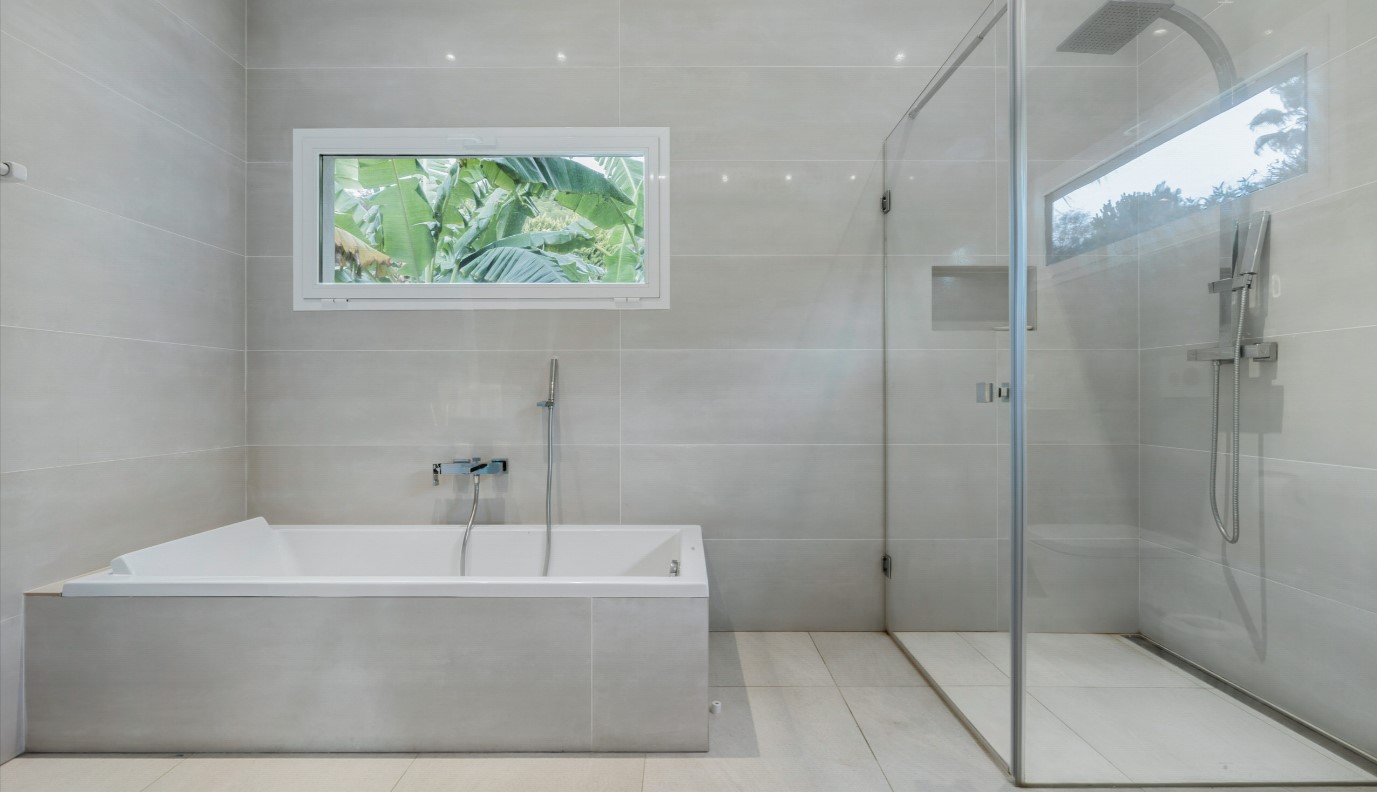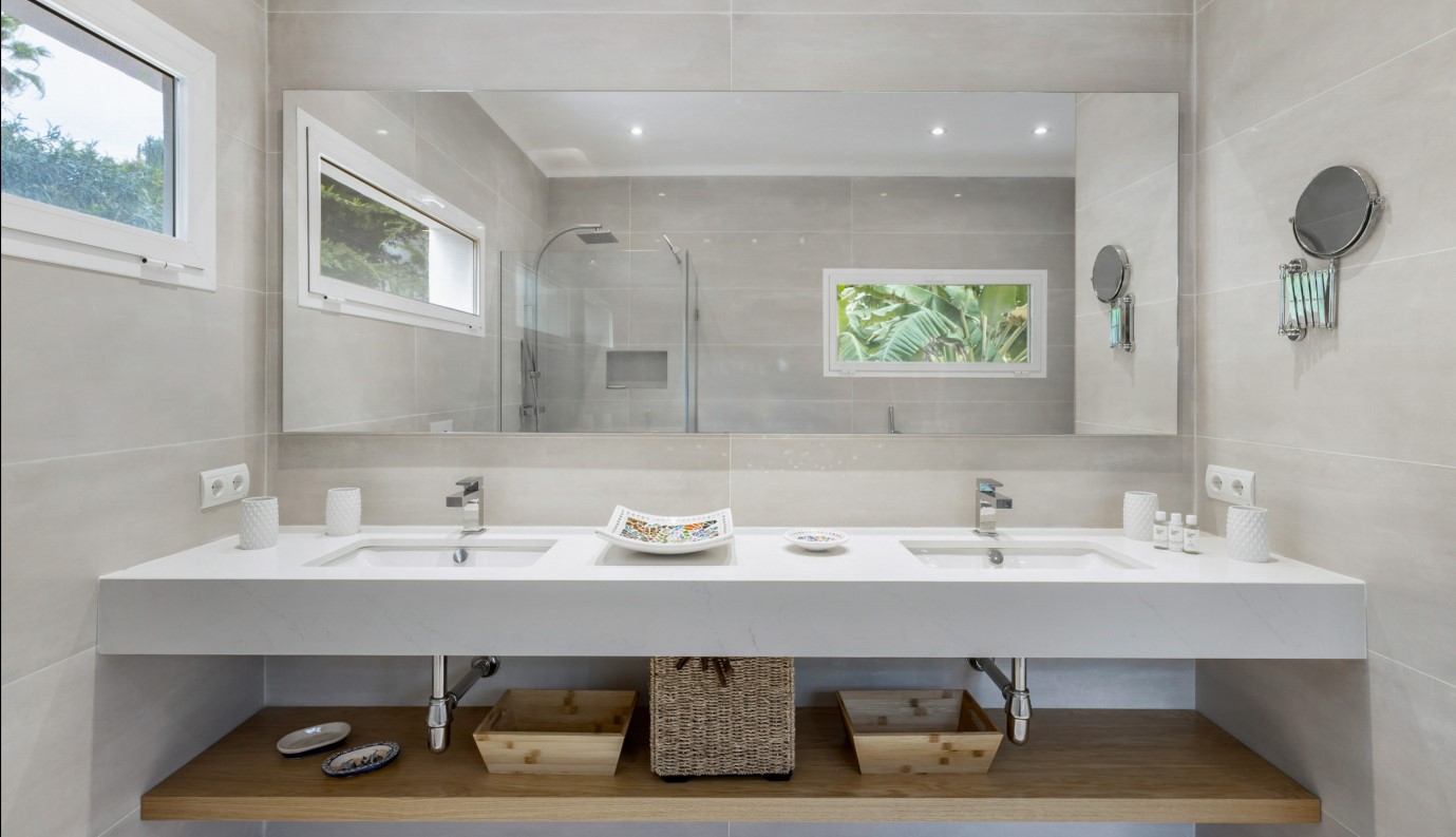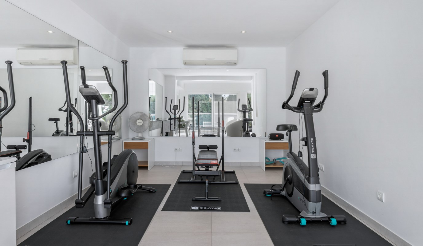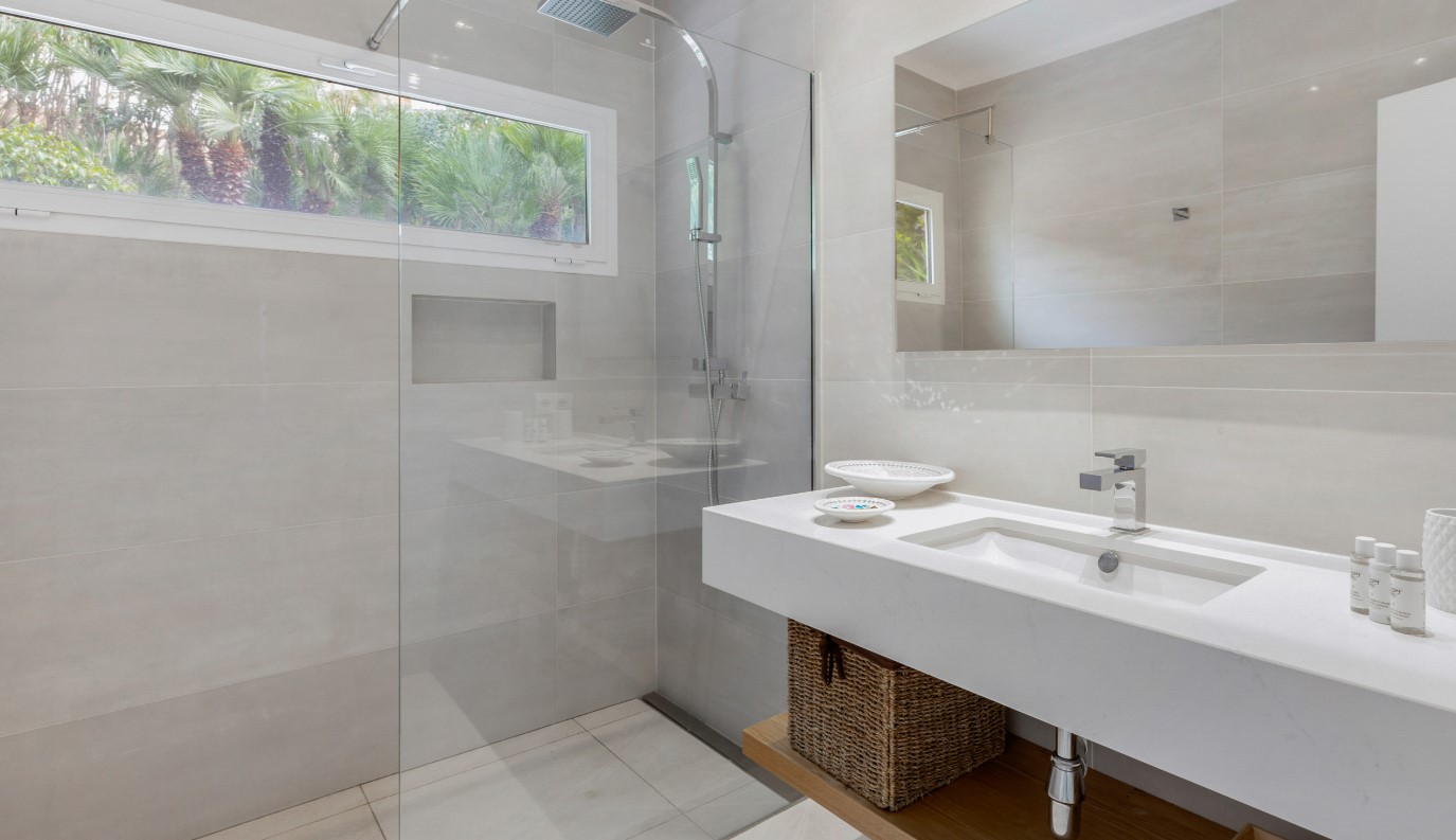 Going down some stairs, on the ground floor, there are 3 bedrooms. 2 of them with a double bed and an en-suite bathroom with a shower. And a third double bedroom and separate bathroom with shower located in the corridor. A small gym area, a small lounge and access to the pool area.