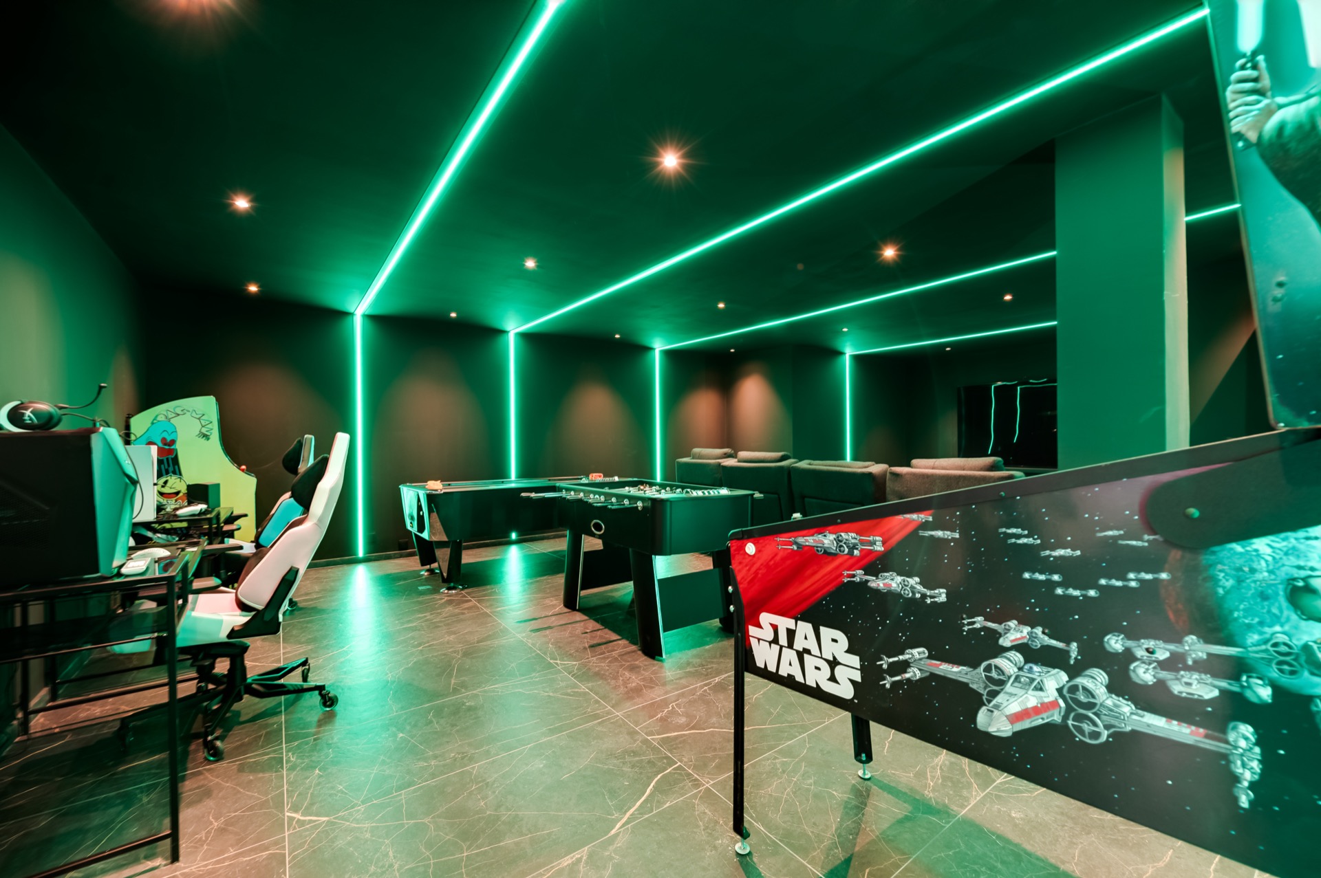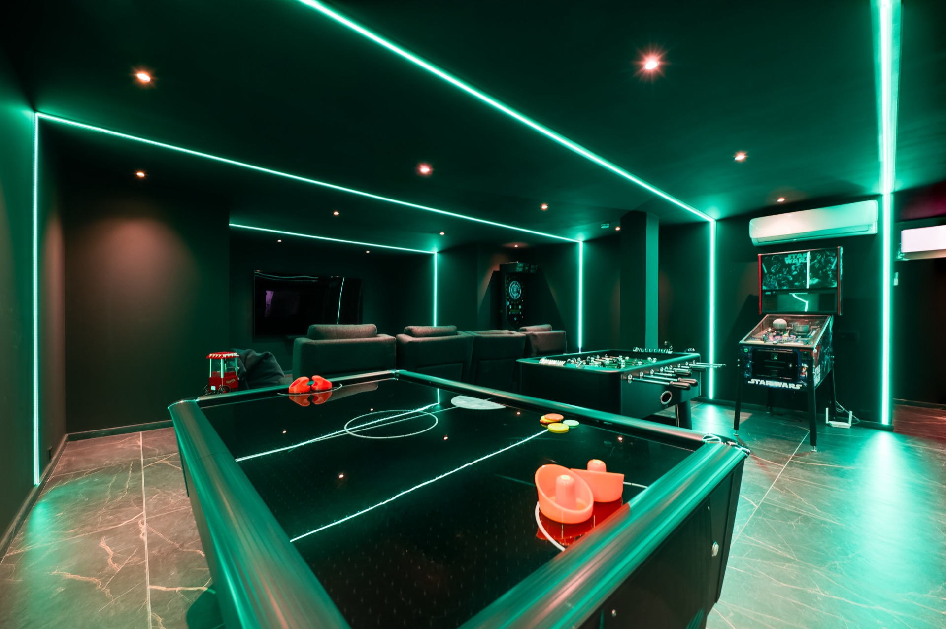 The lower level unveils a full cinema & games lounge, complete with PlayStation 5, pinball, air hockey, and even a dedicated massage space and sauna. It’s a hidden world of entertainment for guests of every age—your personal retreat within a retreat.