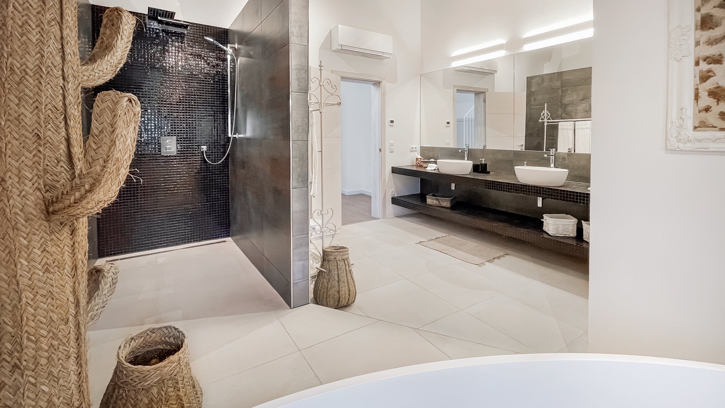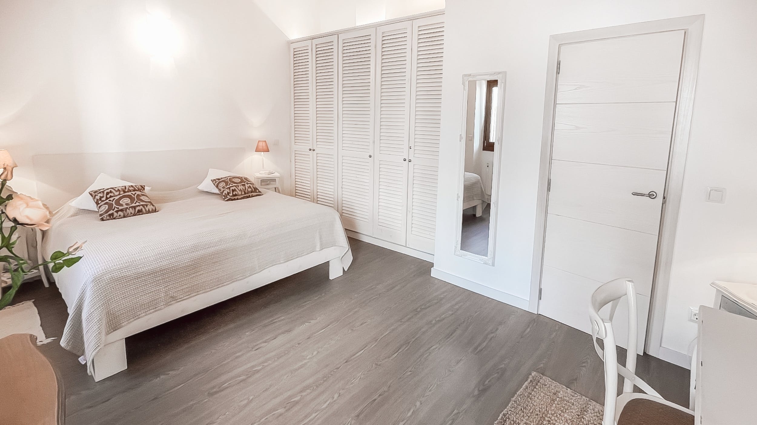 King size bed (160 x 200), walk-in wardrobe, private bathroom with walk-in-shower, two sinks, radiant floor heating.