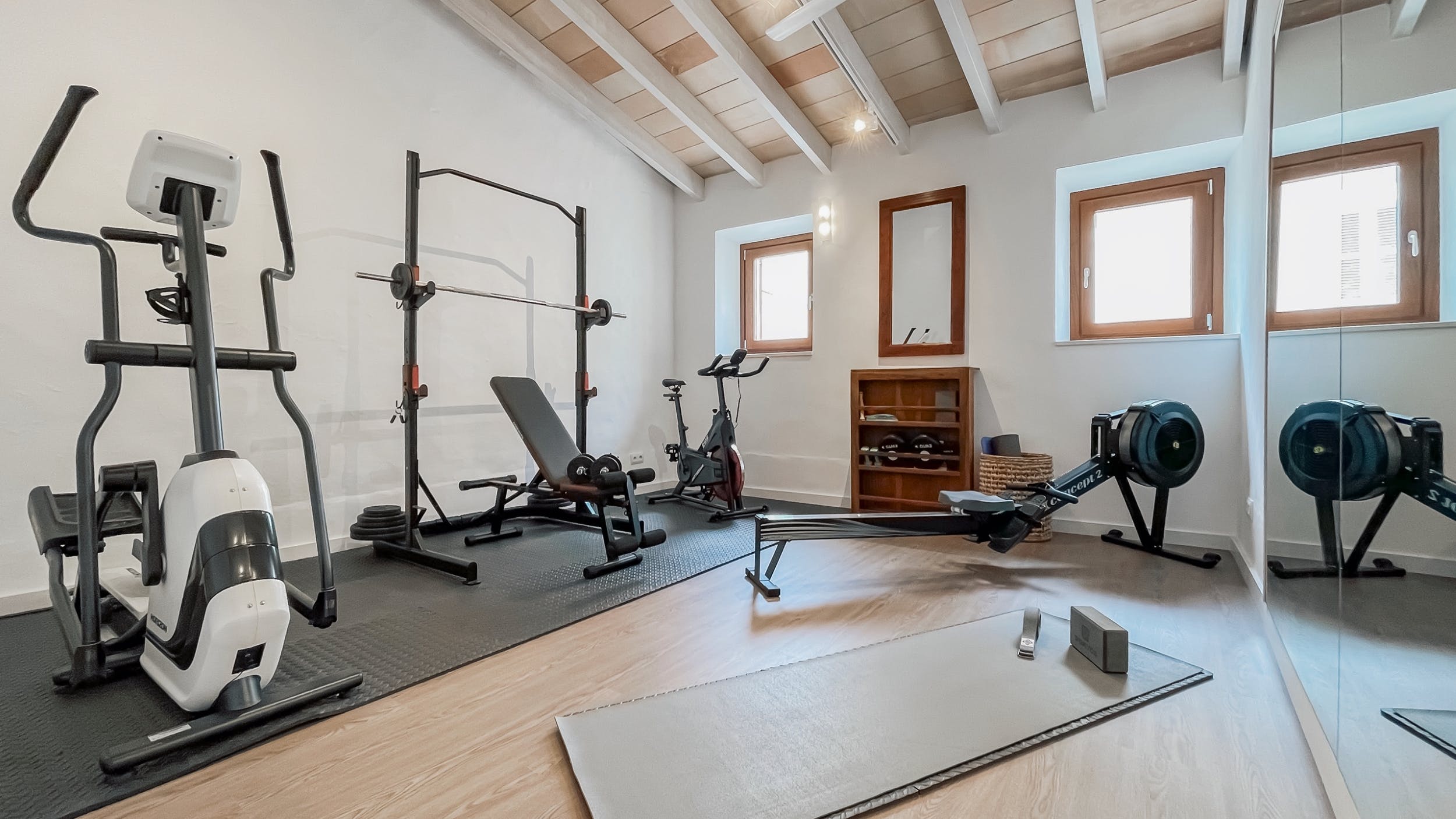 In the townhouse Hestia Tiziano, you will find everything you need for a relaxing holiday. The townhouse offers the utmost in comfort and convenience: well-equipped rooms, large garage with electric vehicle charging box (high voltage current), own gym (with cross-trainer, spinning cycle, barbells, dumbbells, rower, yoga), several terraces with sun loungers, a huge open 60 sqm patio with barbecue (Weber gas grill), and a roof-top whirlpool with a panoramic view of the mountains. Those with an eye for design will love Casa Belisma’s exquisite interiors, which combine local art with high-quality materials.