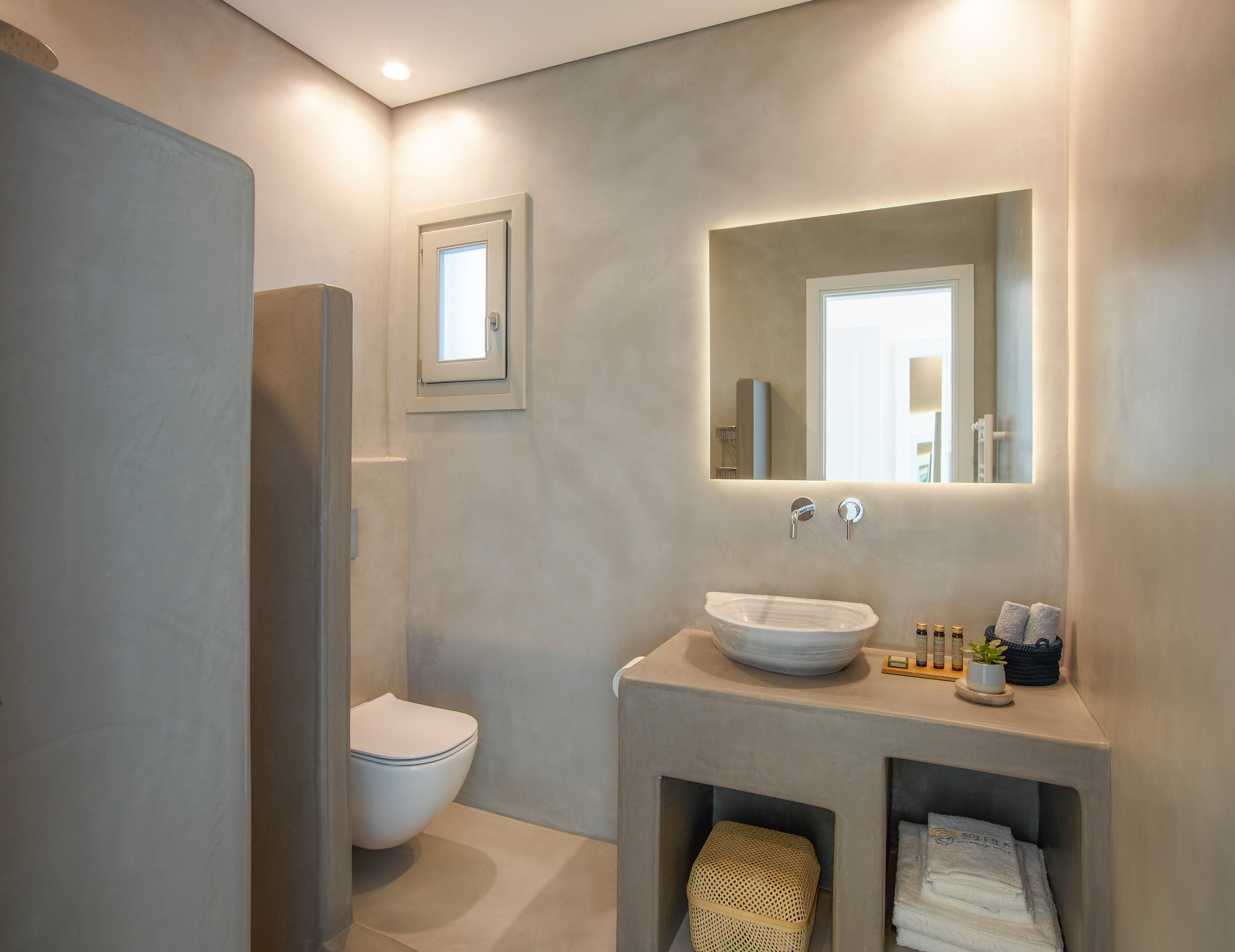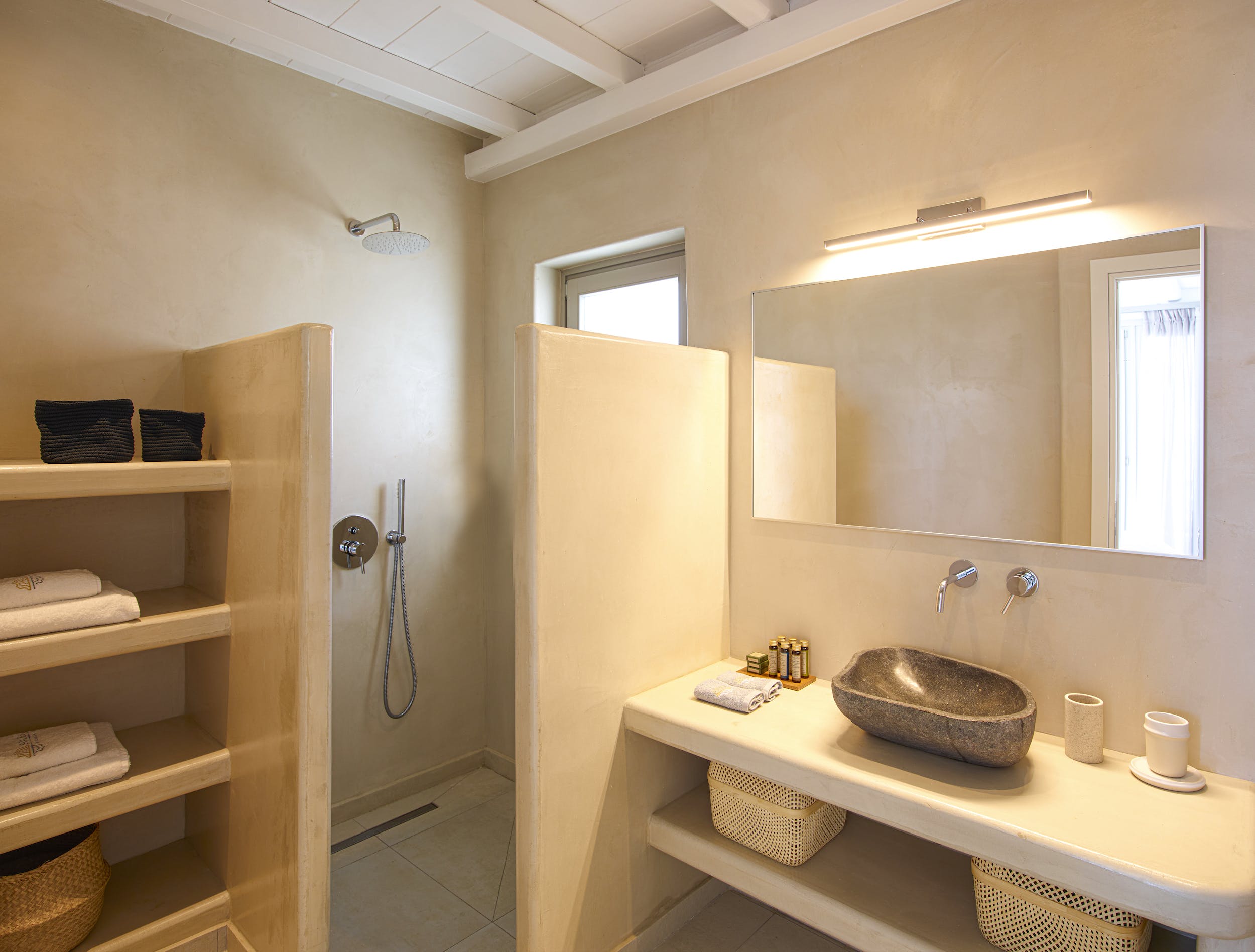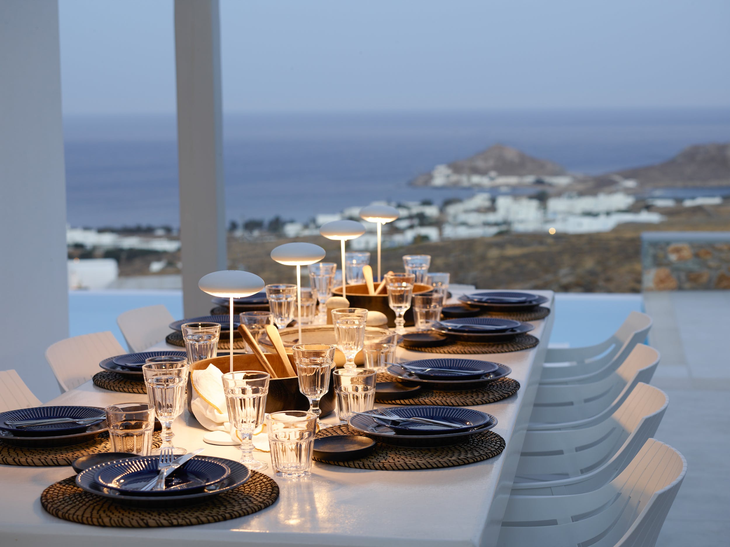 The outside of the villa is where you will spend your most treasurable summer moments. Enjoy relaxing by the heated swimming pool, hot tub, outdoor fitness area, the pergolas, the outdoor dining areas and BBQ facing the magnificent blue of the Aegean Sea. An outdoor shower is also conveniently located next to the swimming pool.