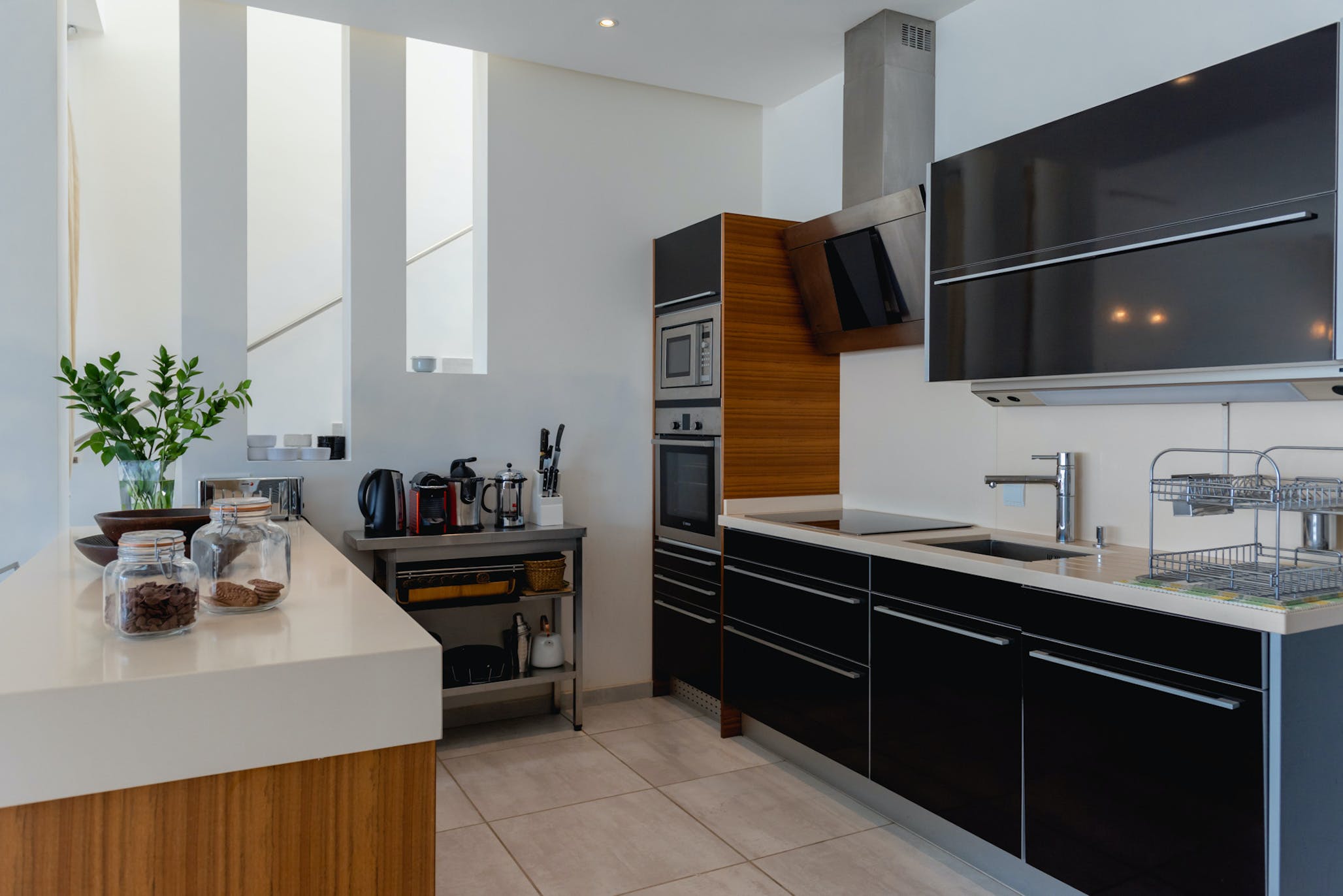 Guest bathroom, large living / dining room with direct access to the terrace. The living room is equipped with a fixed Bose sound system and a portable Bowers & Wilkins sound system with Bluetooth connection, TV, fireplace, fully equipped kitchenette and laundry room.