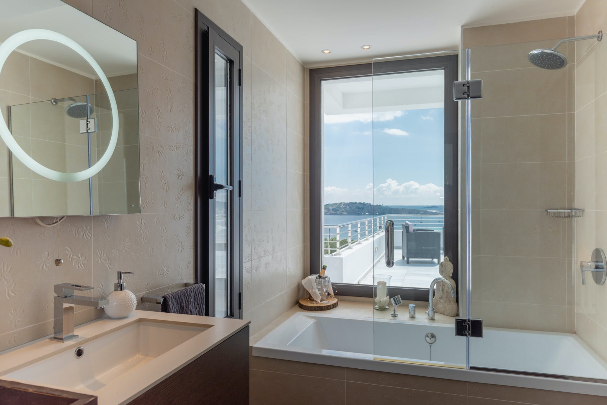 The entire floor is occupied by the Master Suite, which features a large private terrace with outdoor lounge and an amazing sea view, queen size bed, safe, TV, air conditioning and bathroom with bathtub and shower.