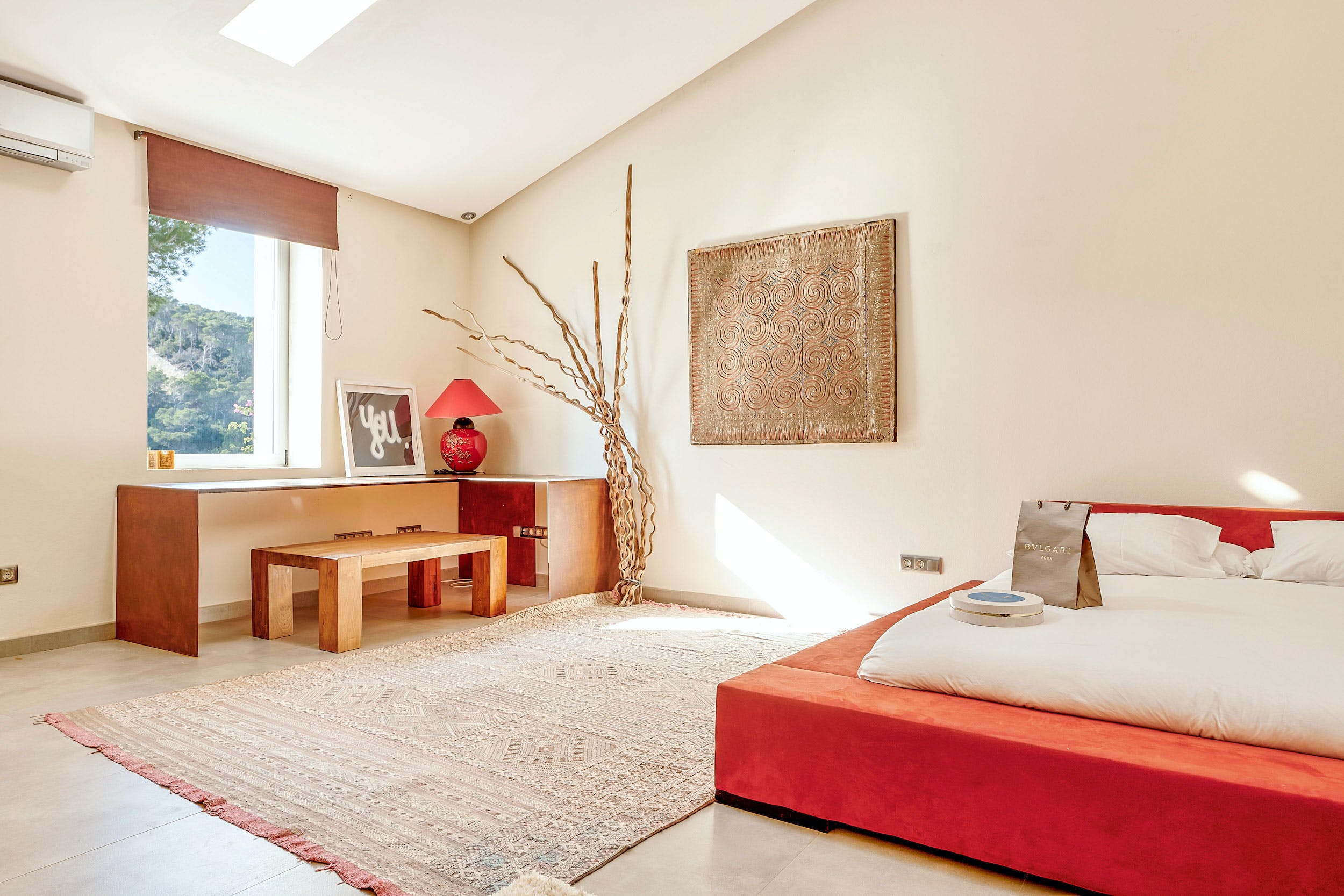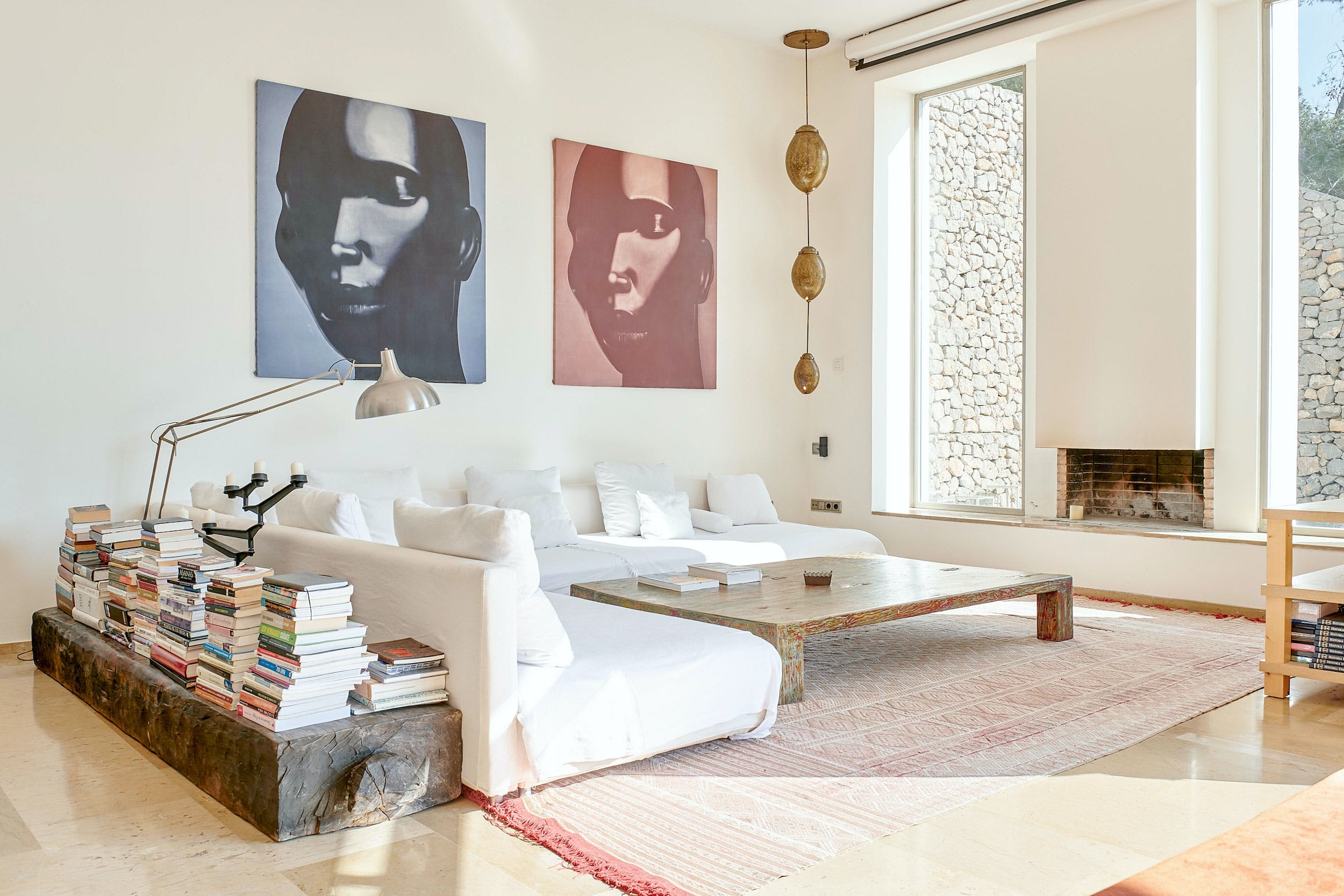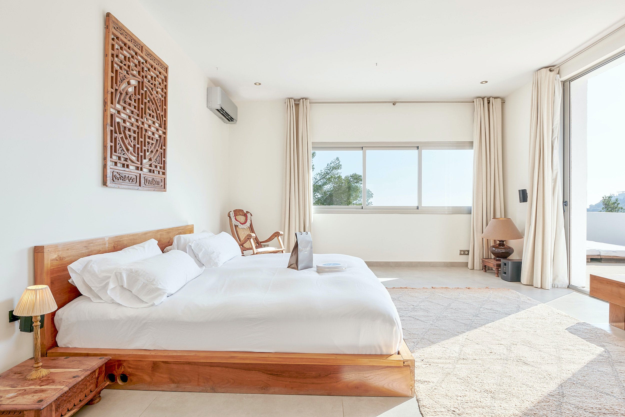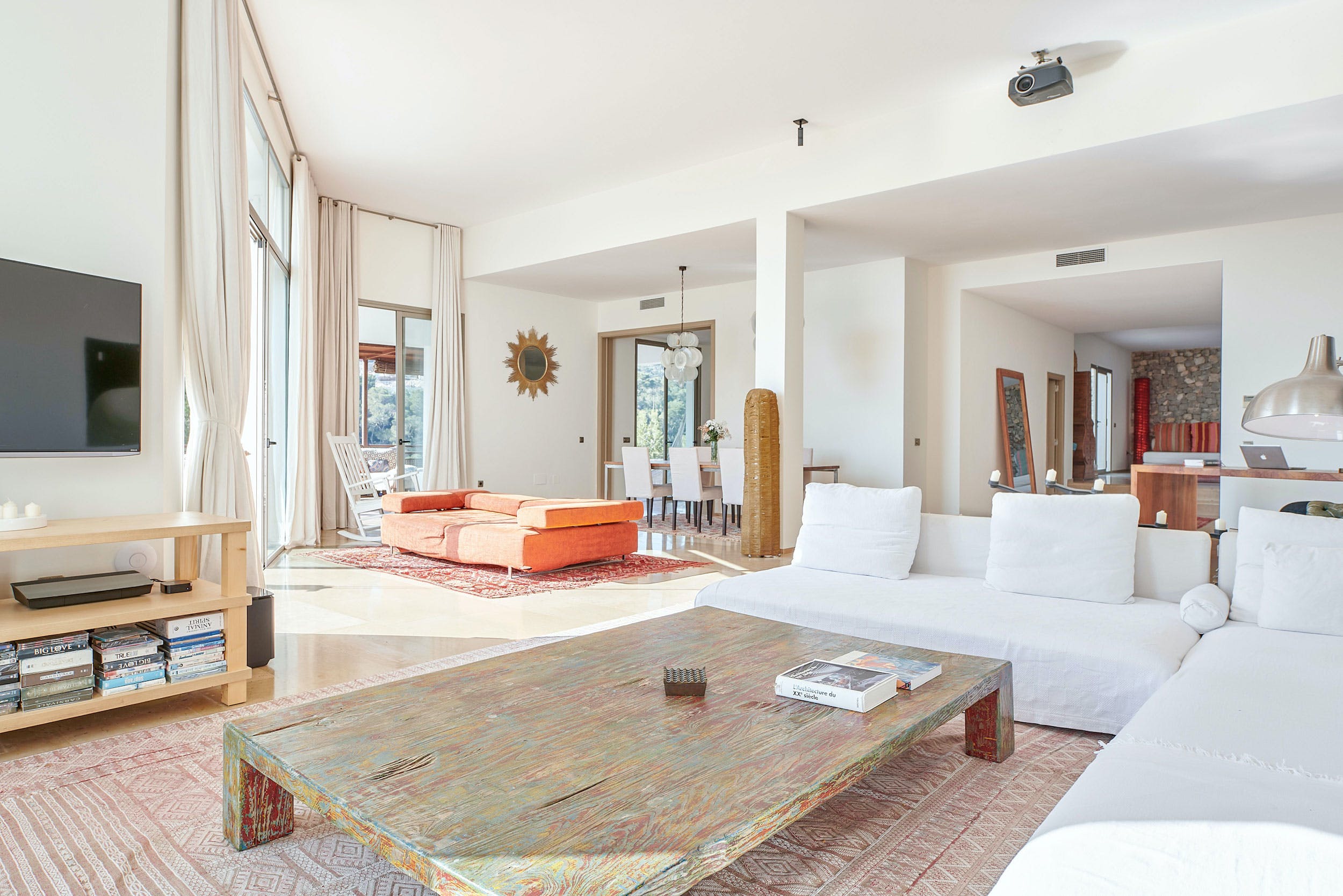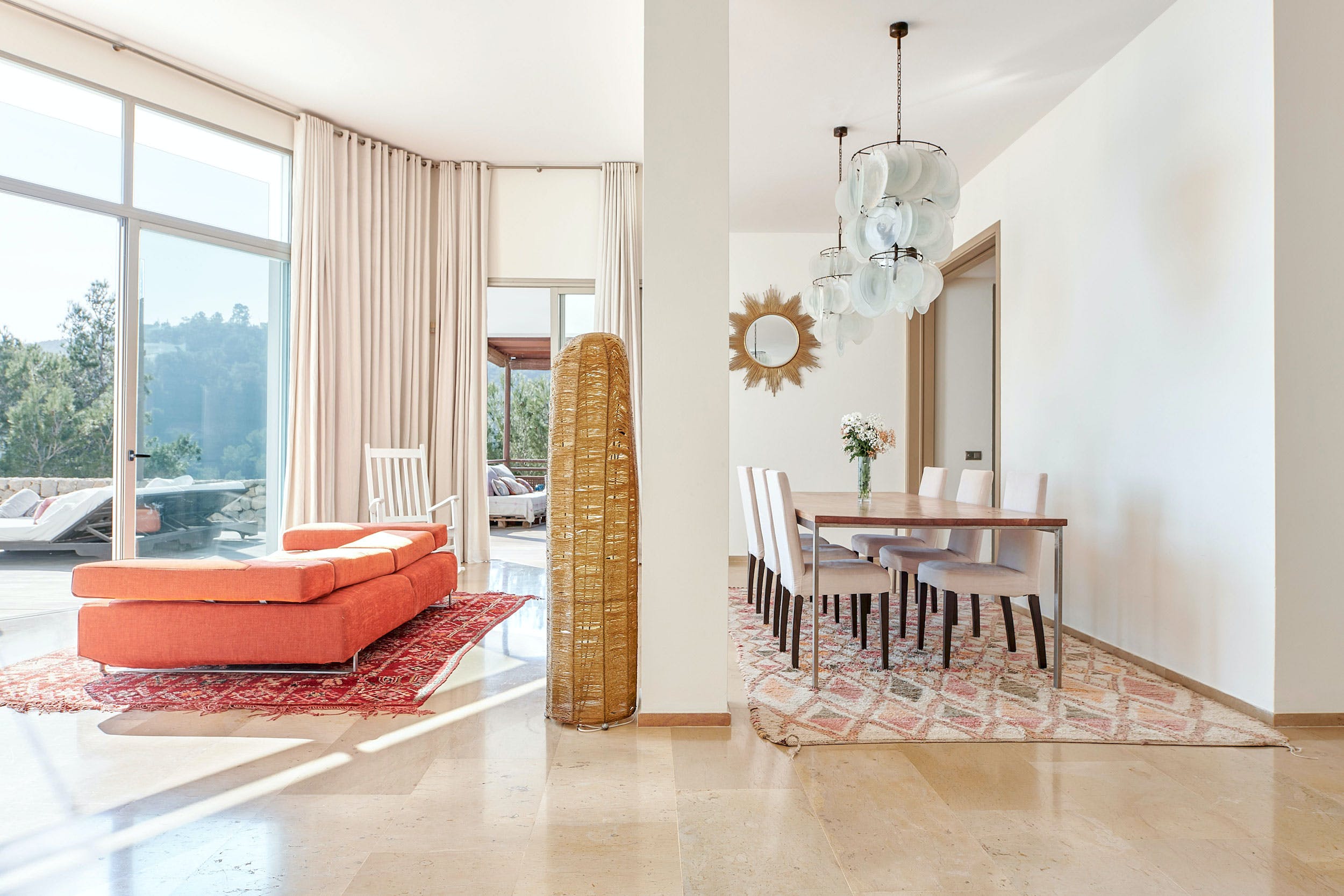 The first floor consists of a large open plan social area, which enjoys large windows overlooking the pool, the coast and the island of Formentera. This space has a very high ceiling and is tastefully decorated with neutral tones and beautiful furnishings from around the world, constantly updated with new inspirations from the owners many travels creating a stunning modern and luxurious home.
