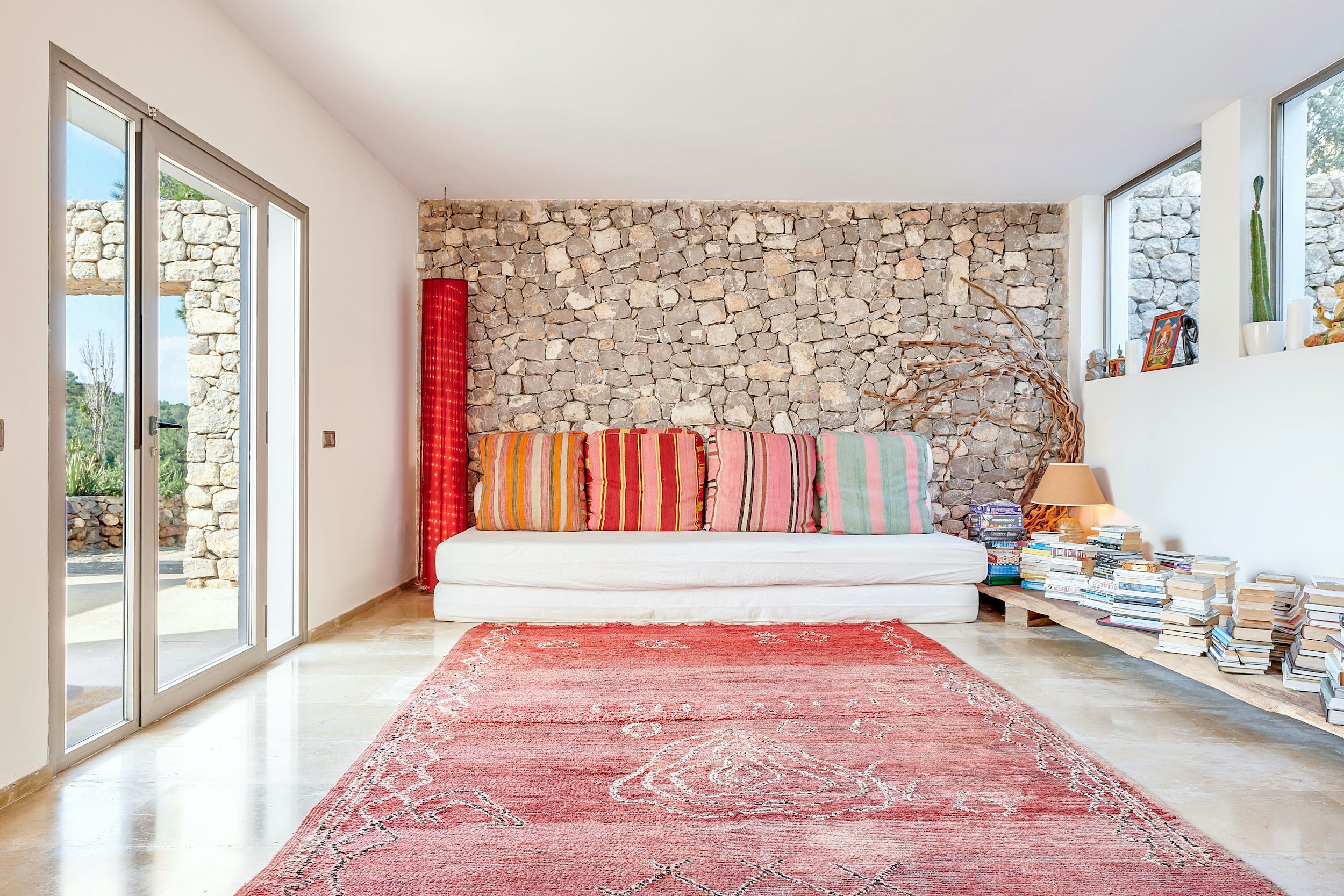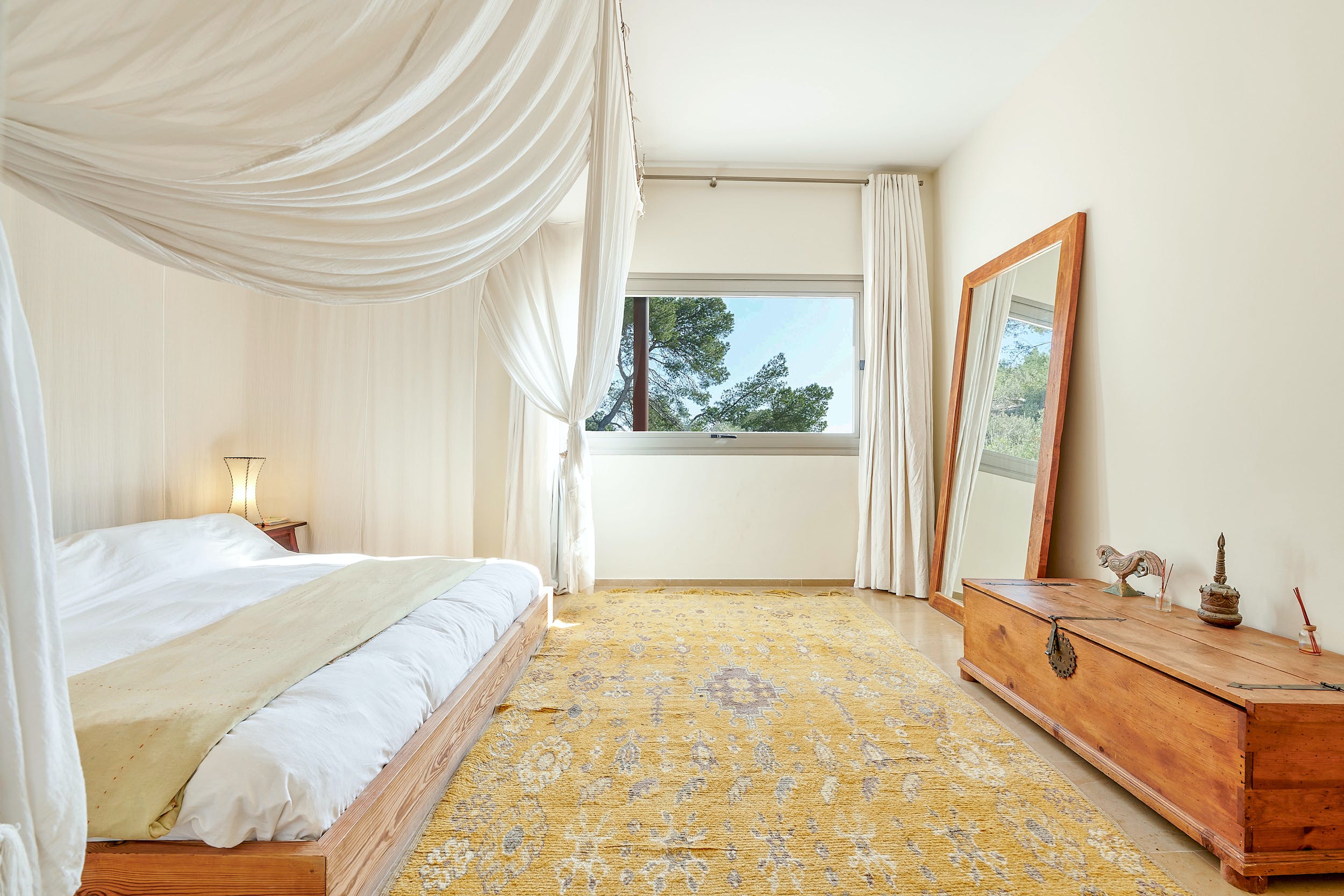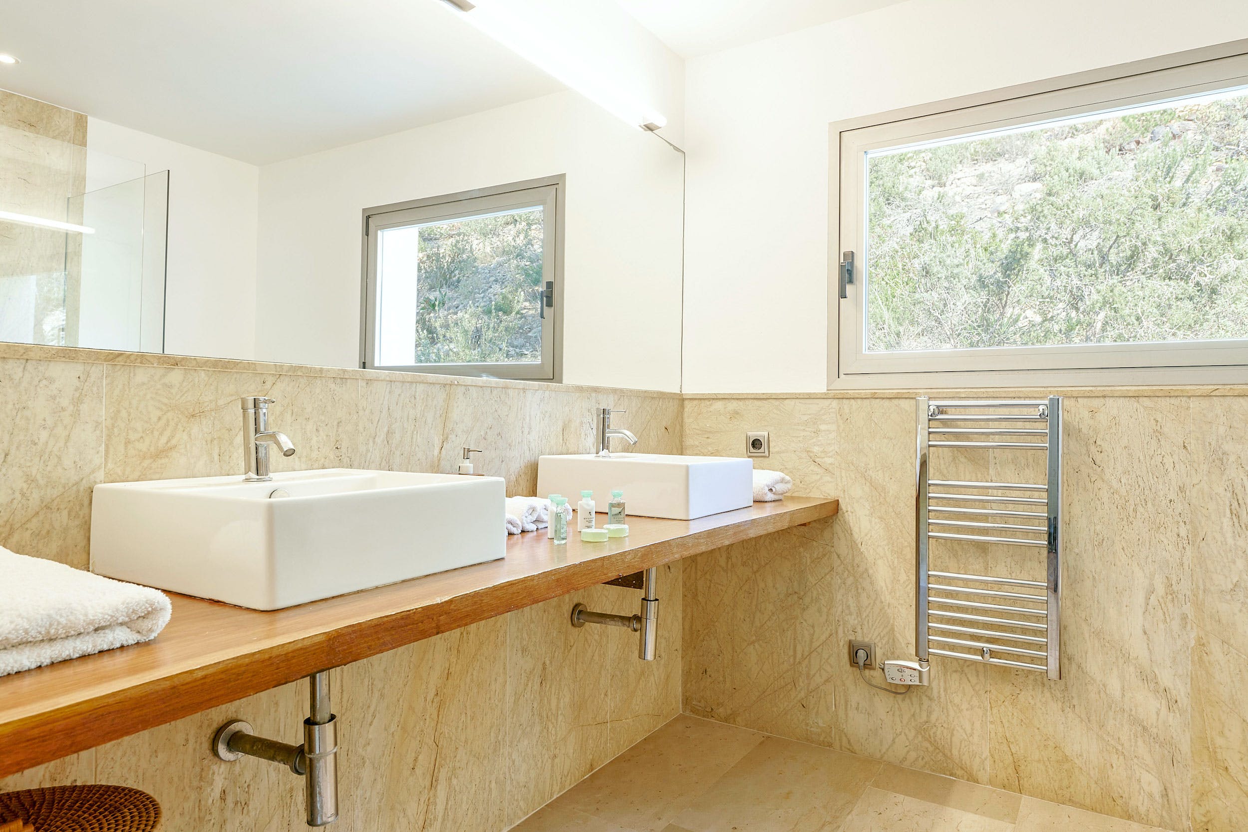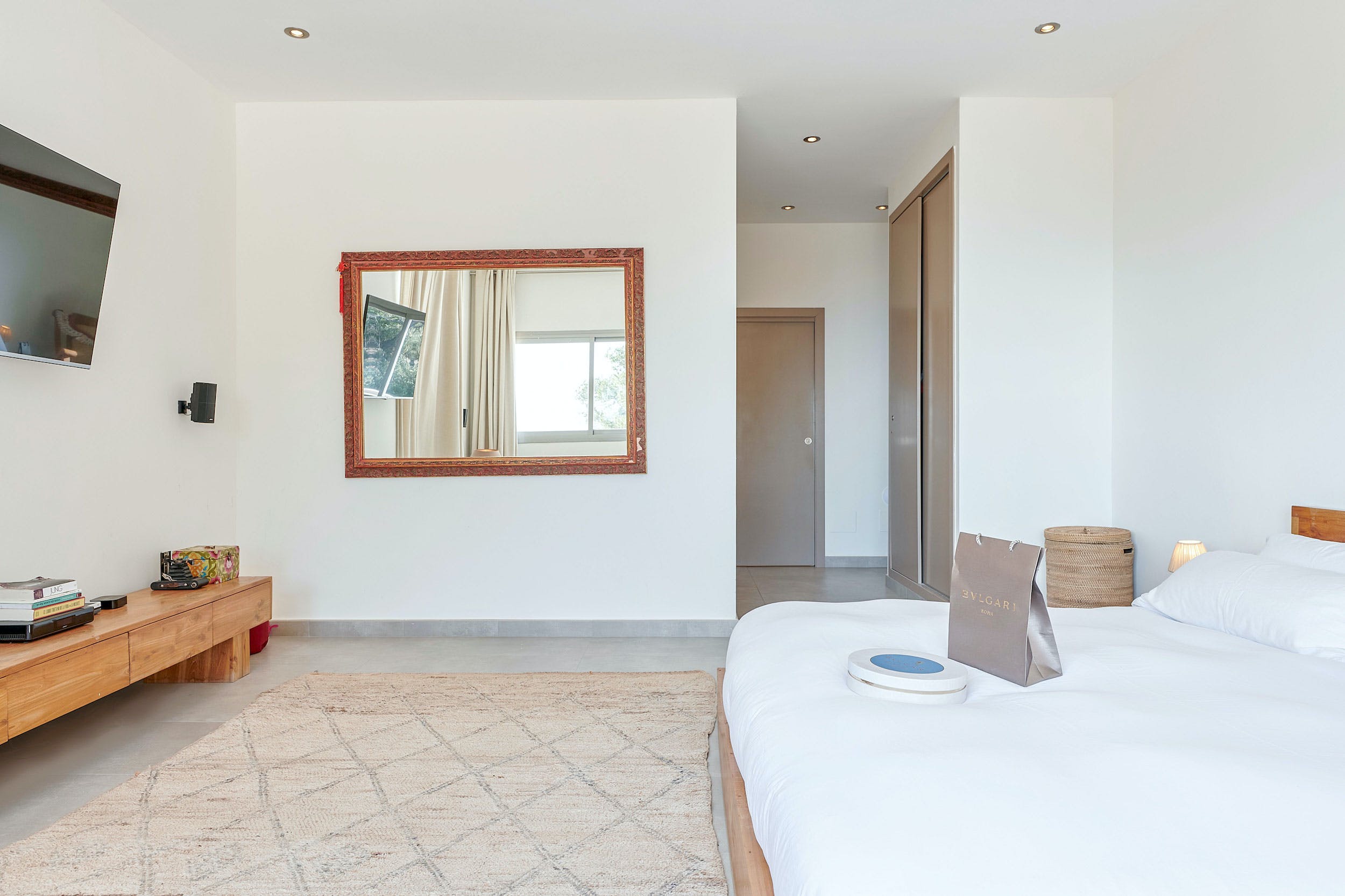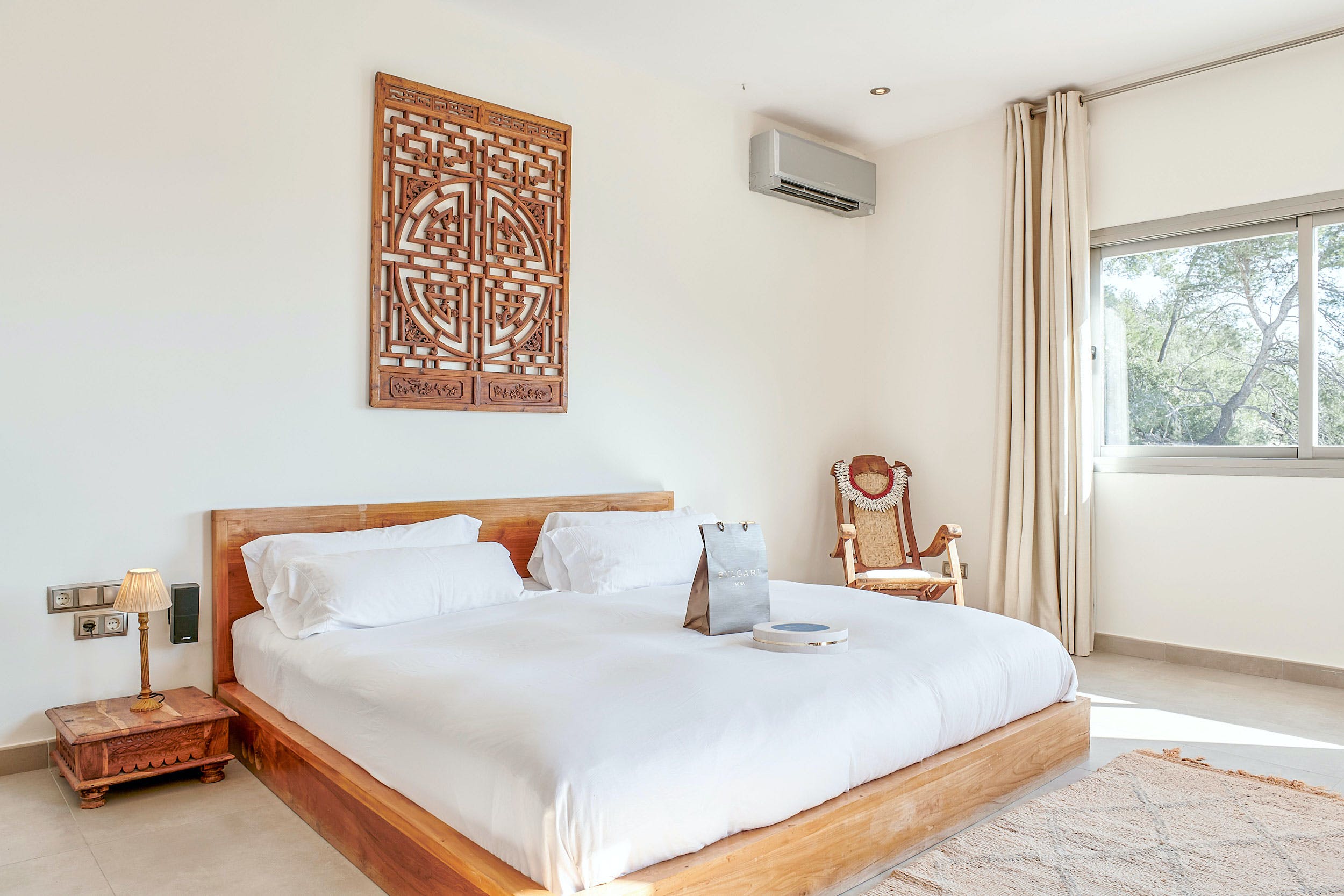 The first floor consists of a large open plan social area, which enjoys large windows overlooking the pool, the coast and the island of Formentera. This space has a very high ceiling and is tastefully decorated with neutral tones and beautiful furnishings from around the world, constantly updated with new inspirations from the owners many travels creating a stunning modern and luxurious home.