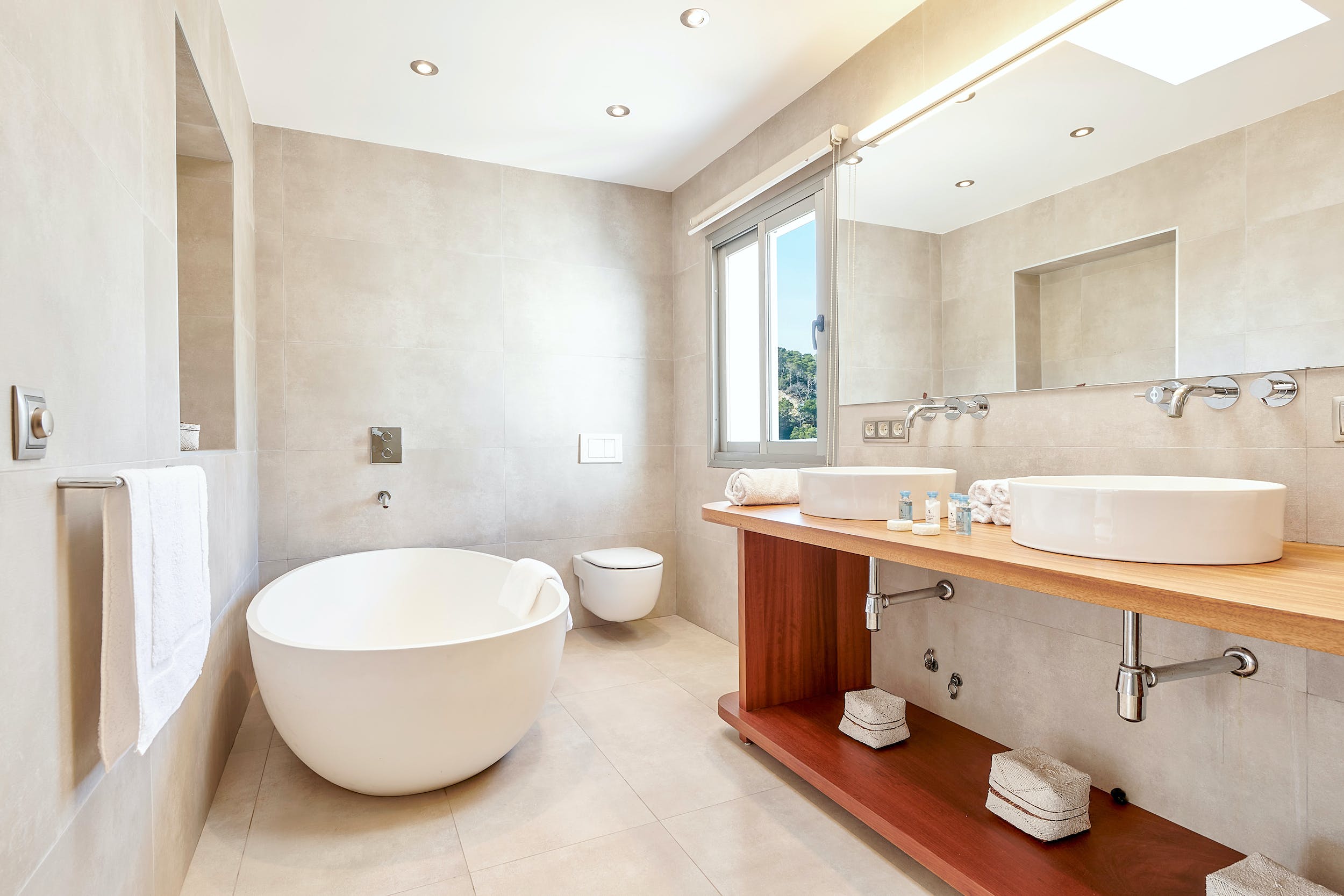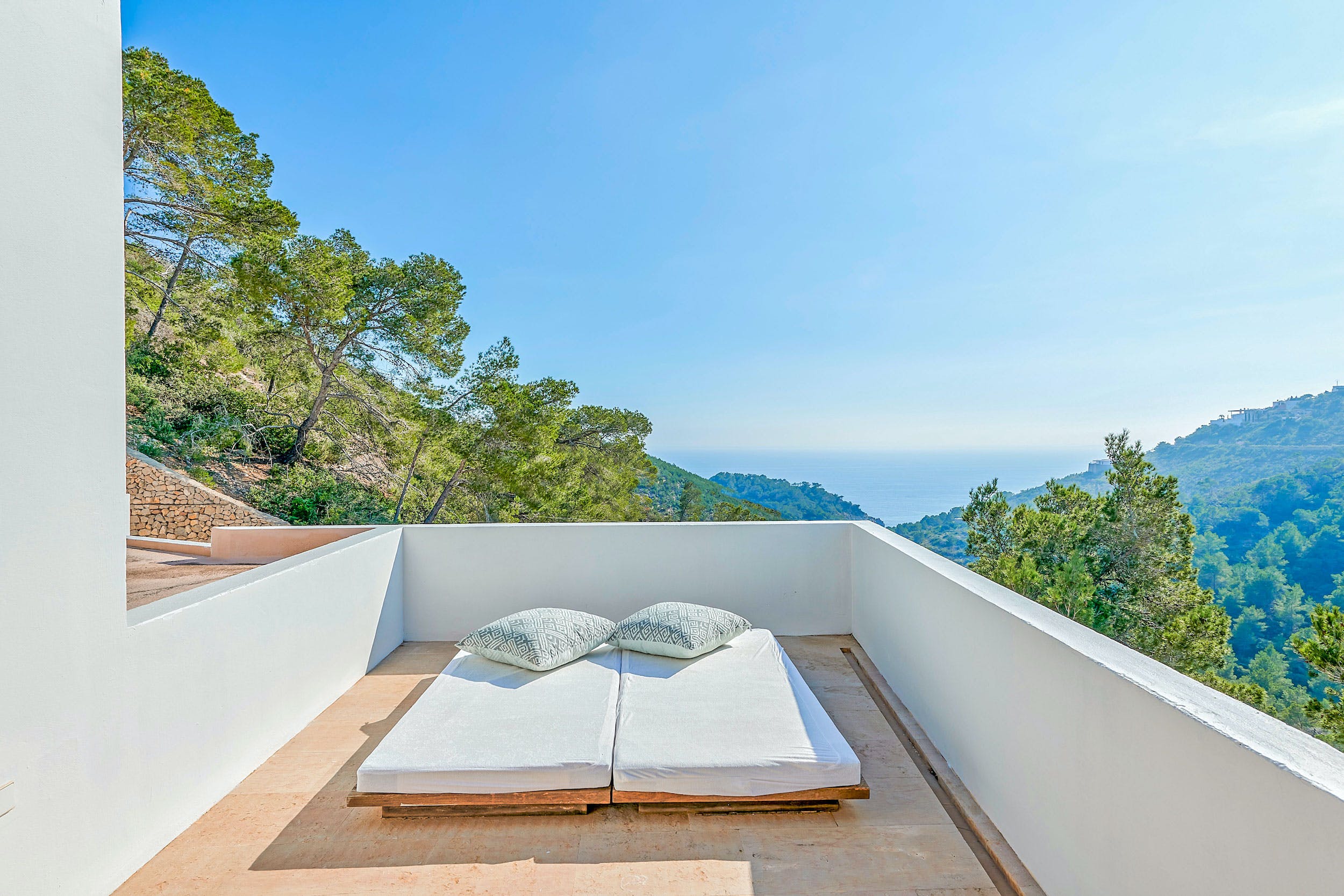 From the living room there is access to the panoramic sun terrace, with a beautiful moon-shaped pool and chill-out loungers. There is also a large shaded chill out and dining area next to the pool, which also enjoys the stunning sea views.