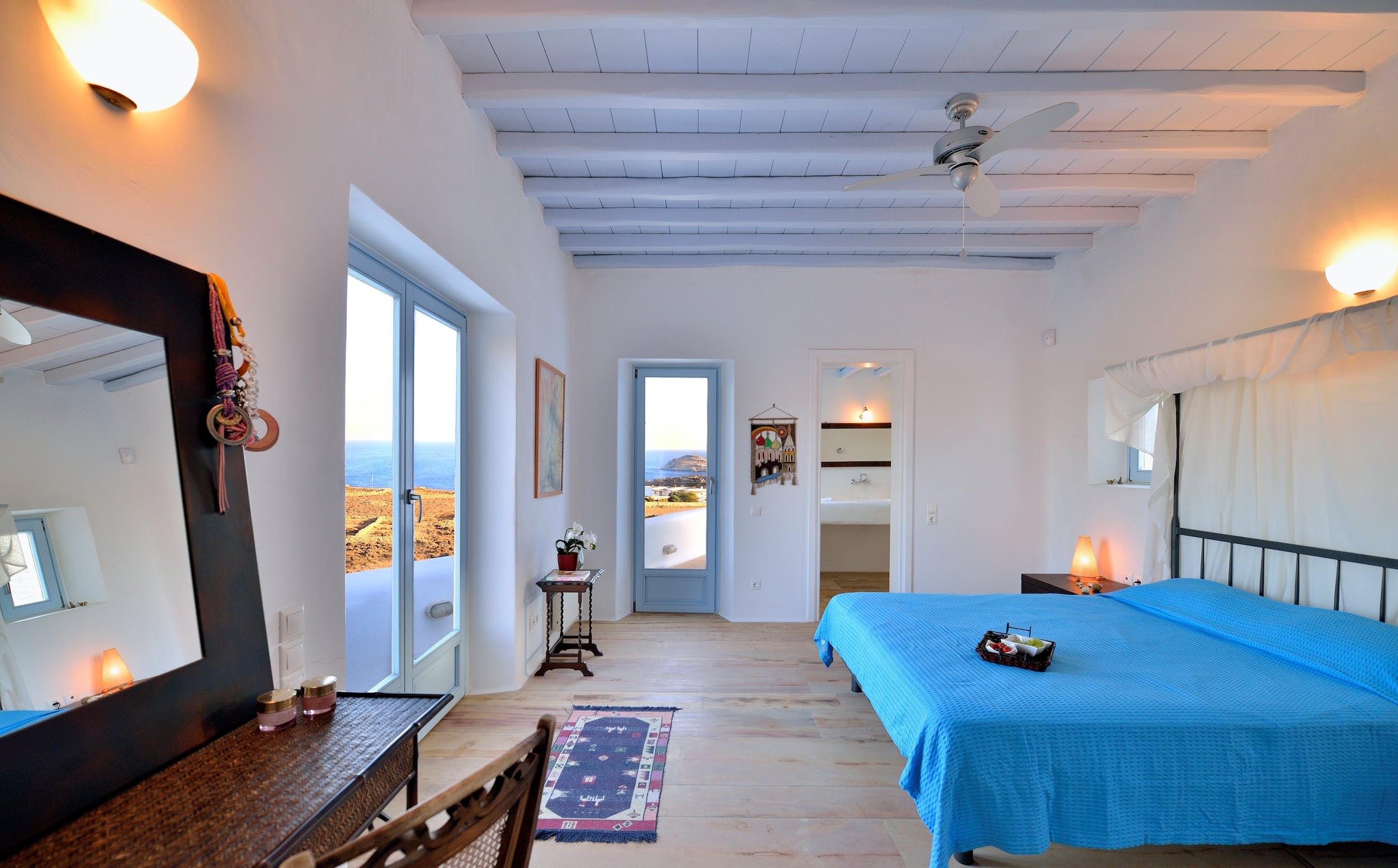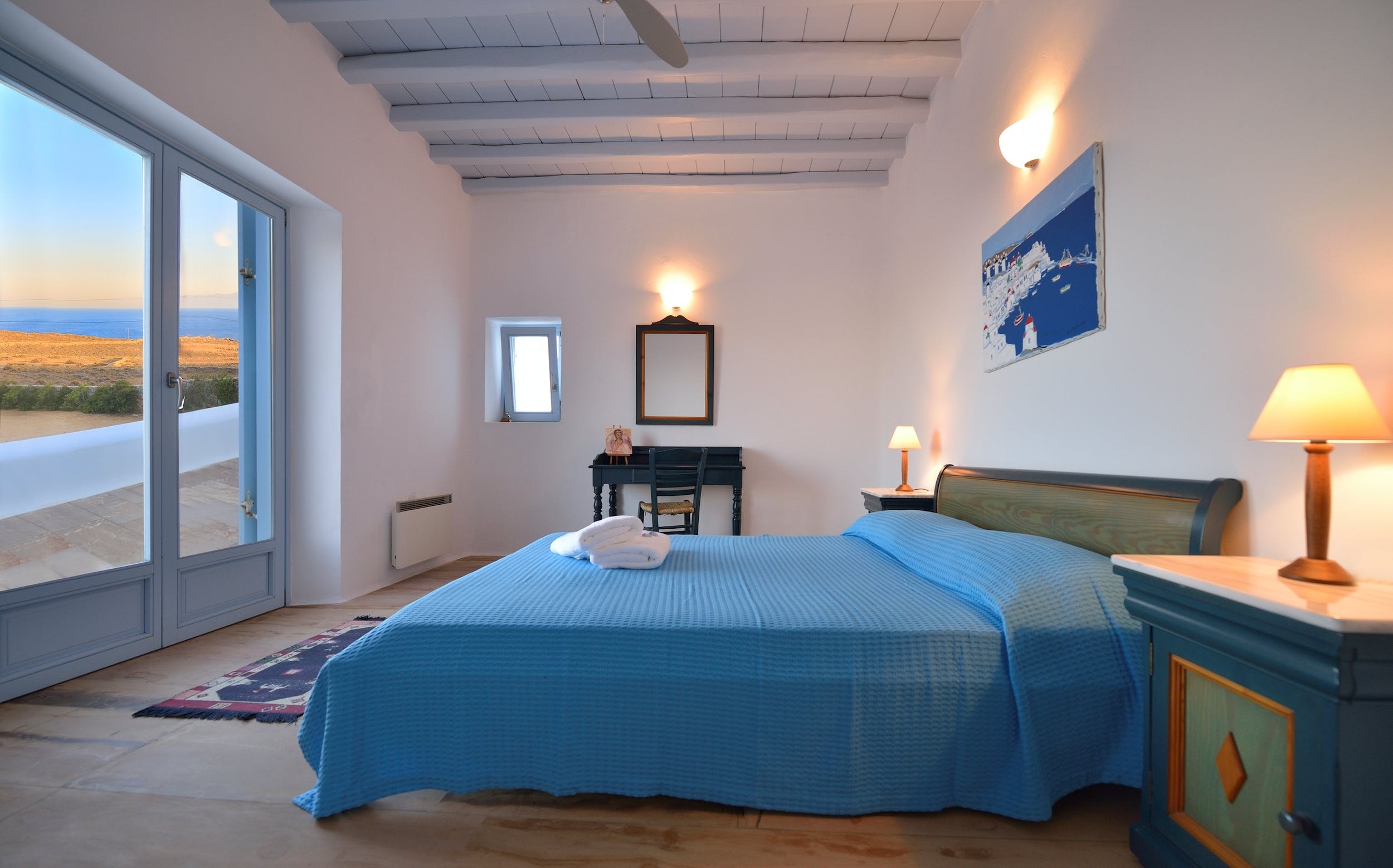 Ground Floor Main Villa – Spacious double room, air conditioning, ceiling fan, en-suite bathroom with shower, direct access to the front terrace with stunning sea and landscape views.