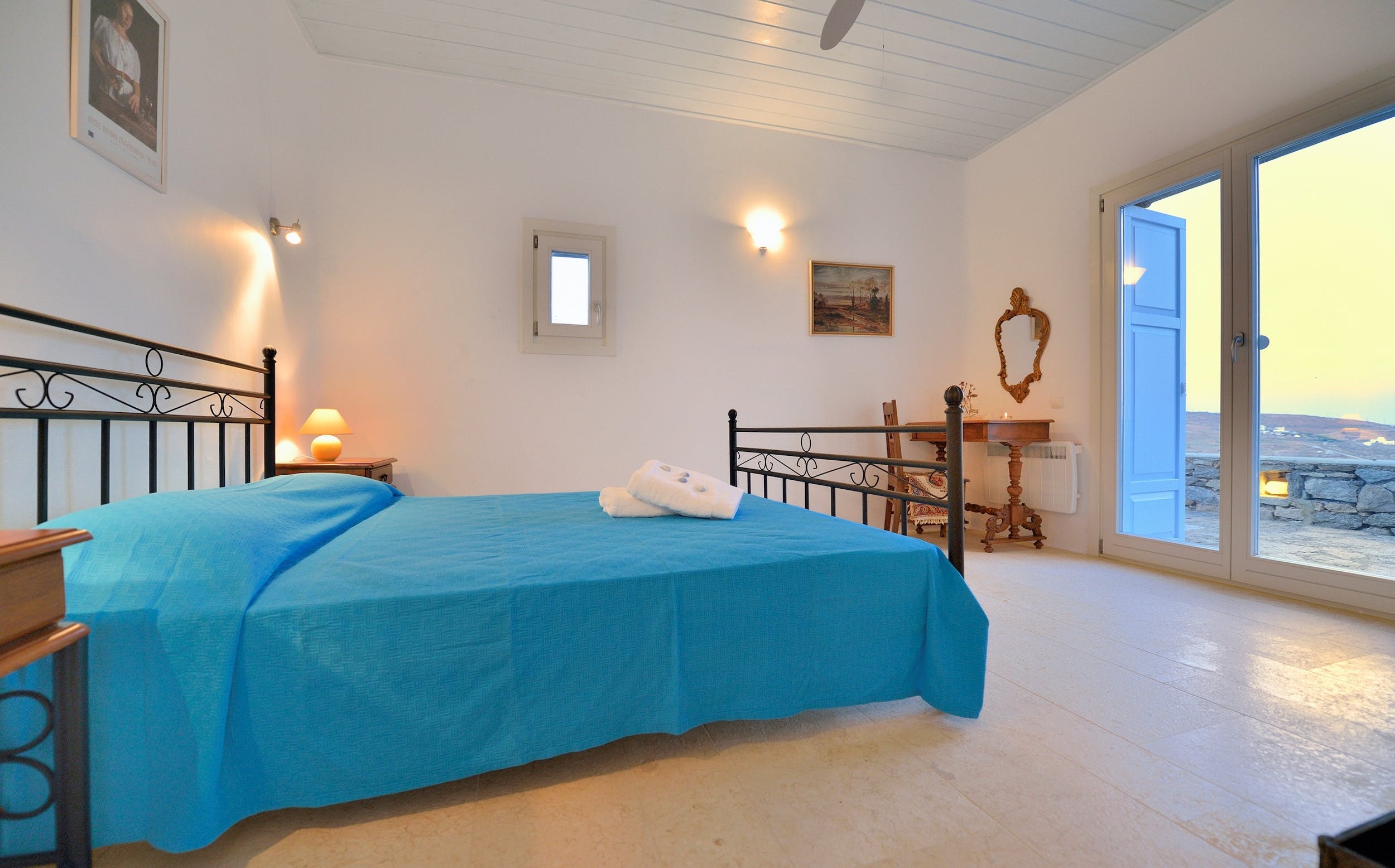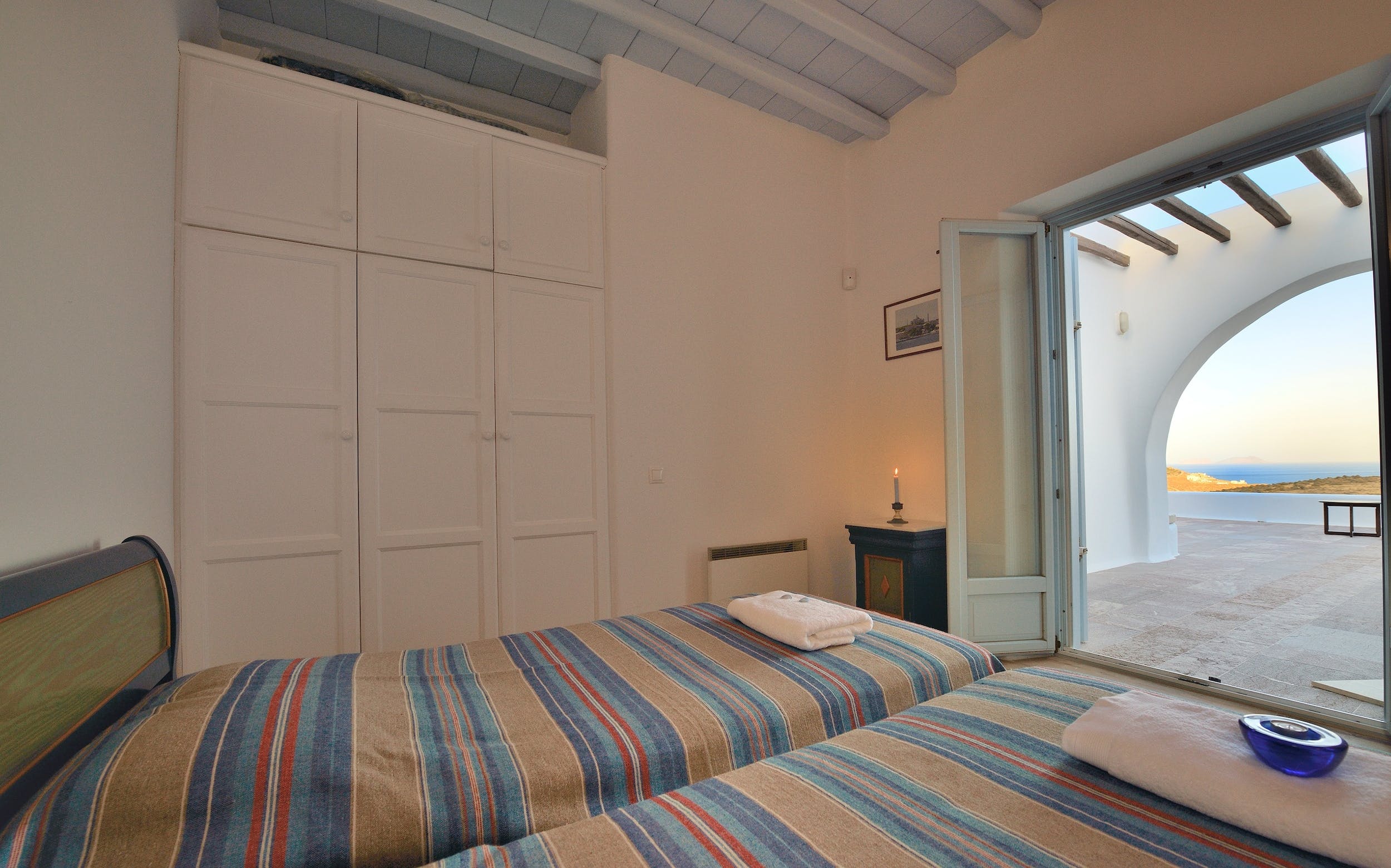 Ground Floor Main Villa – Spacious double room with twin beds, air conditioning, ceiling fan, en-suite bathroom with shower, direct access to the front terrace with stunning sea and landscape views.