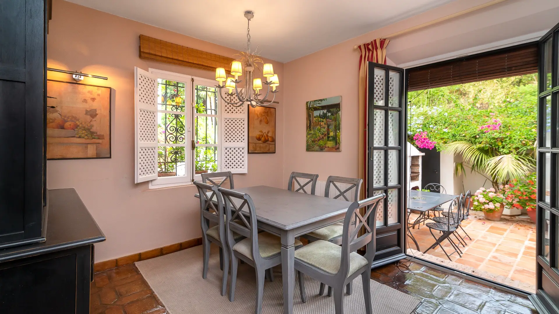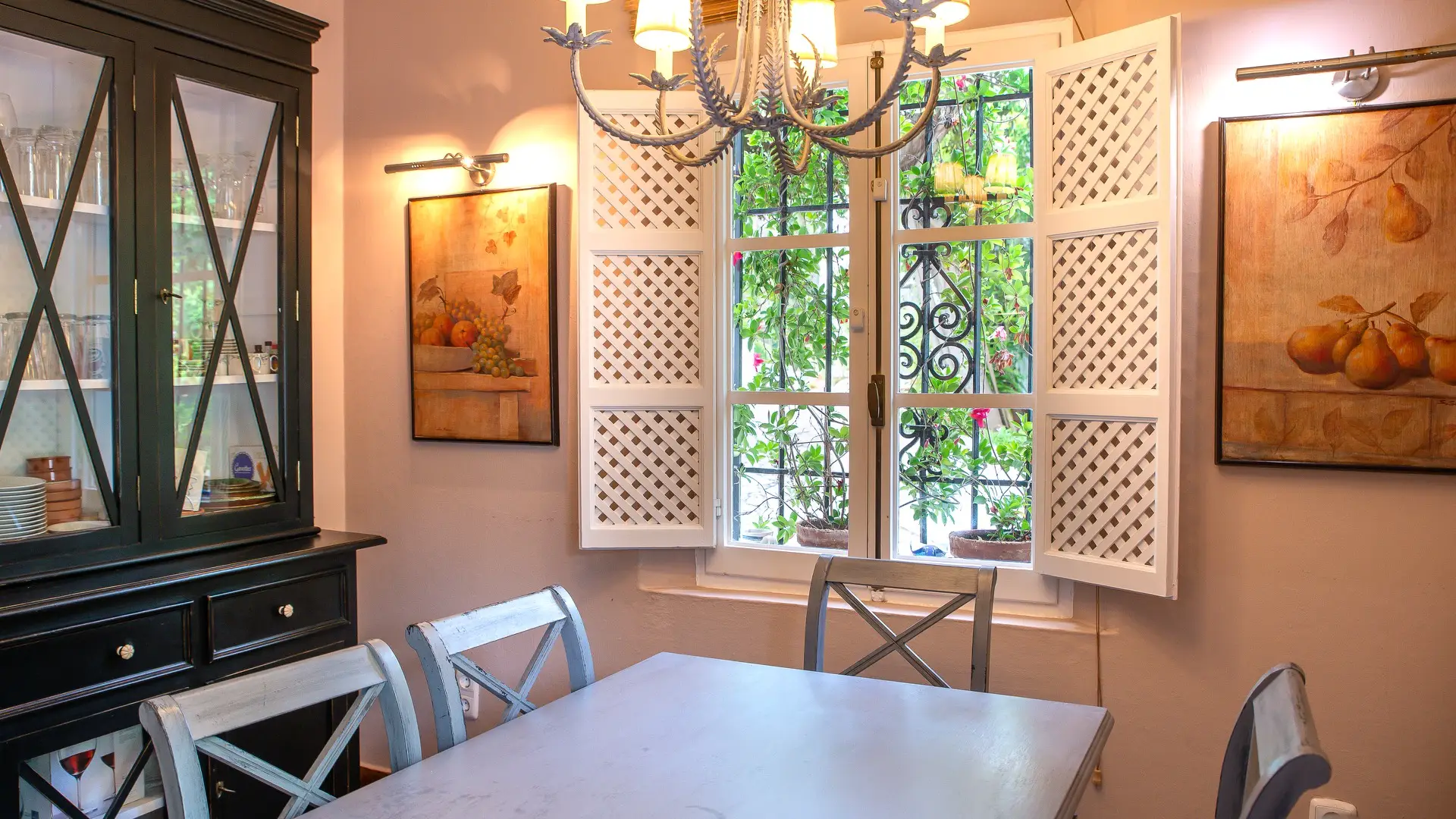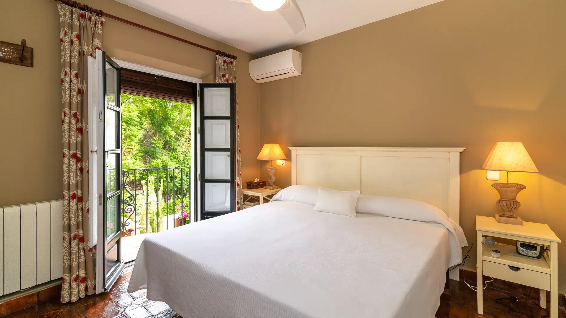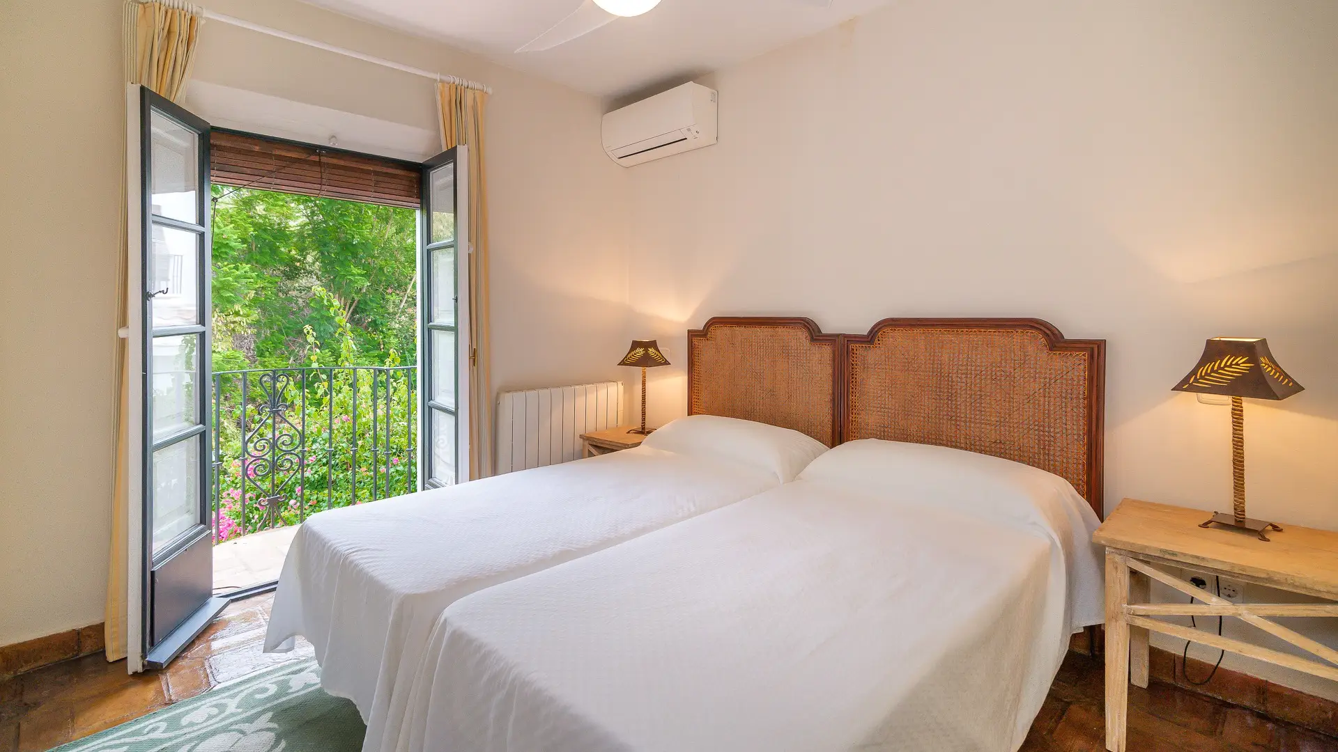 Upstairs, two cozy bedroom suites await, each with its own en-suite bathroom, generous wardrobes, and independent air conditioning. French doors open to intimate balconies, offering romantic glimpses over the patio and a whisper of Mediterranean breeze.