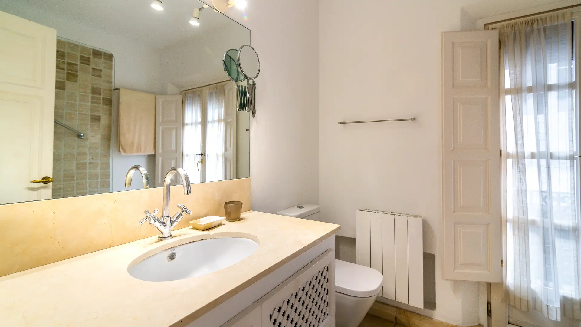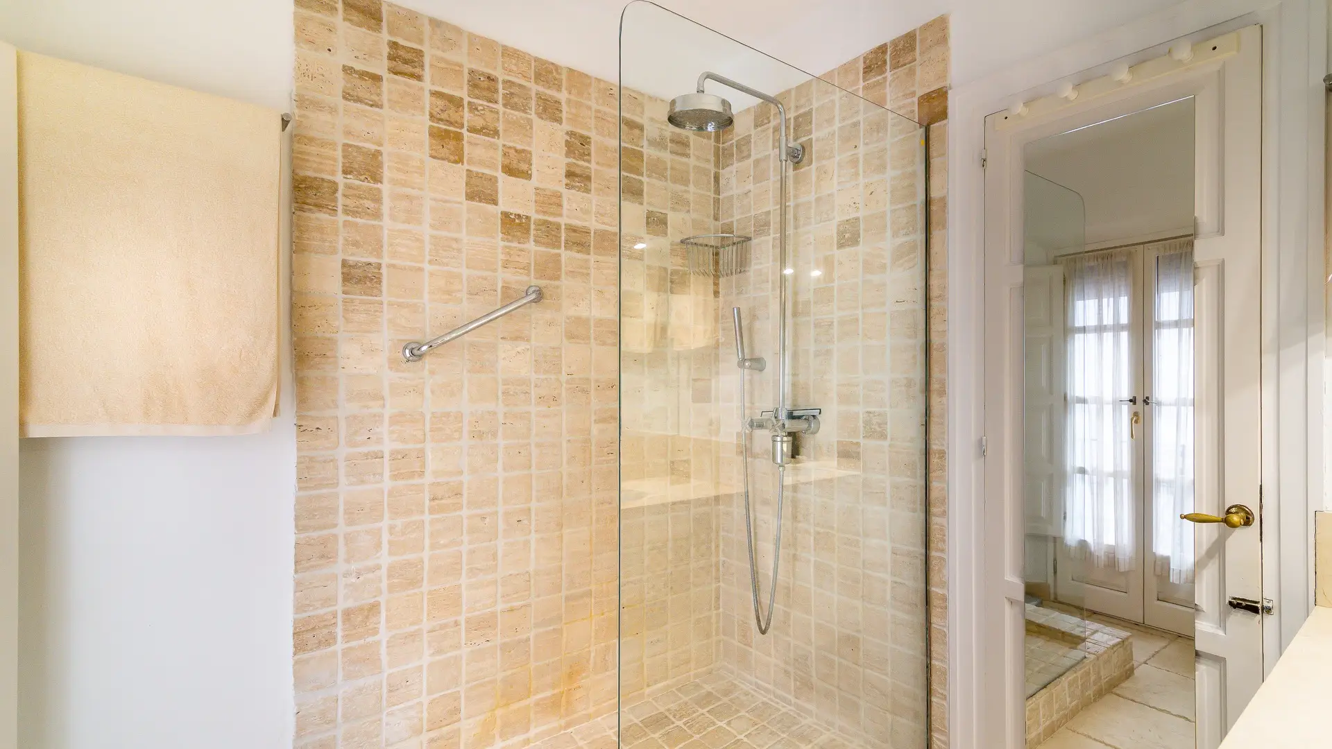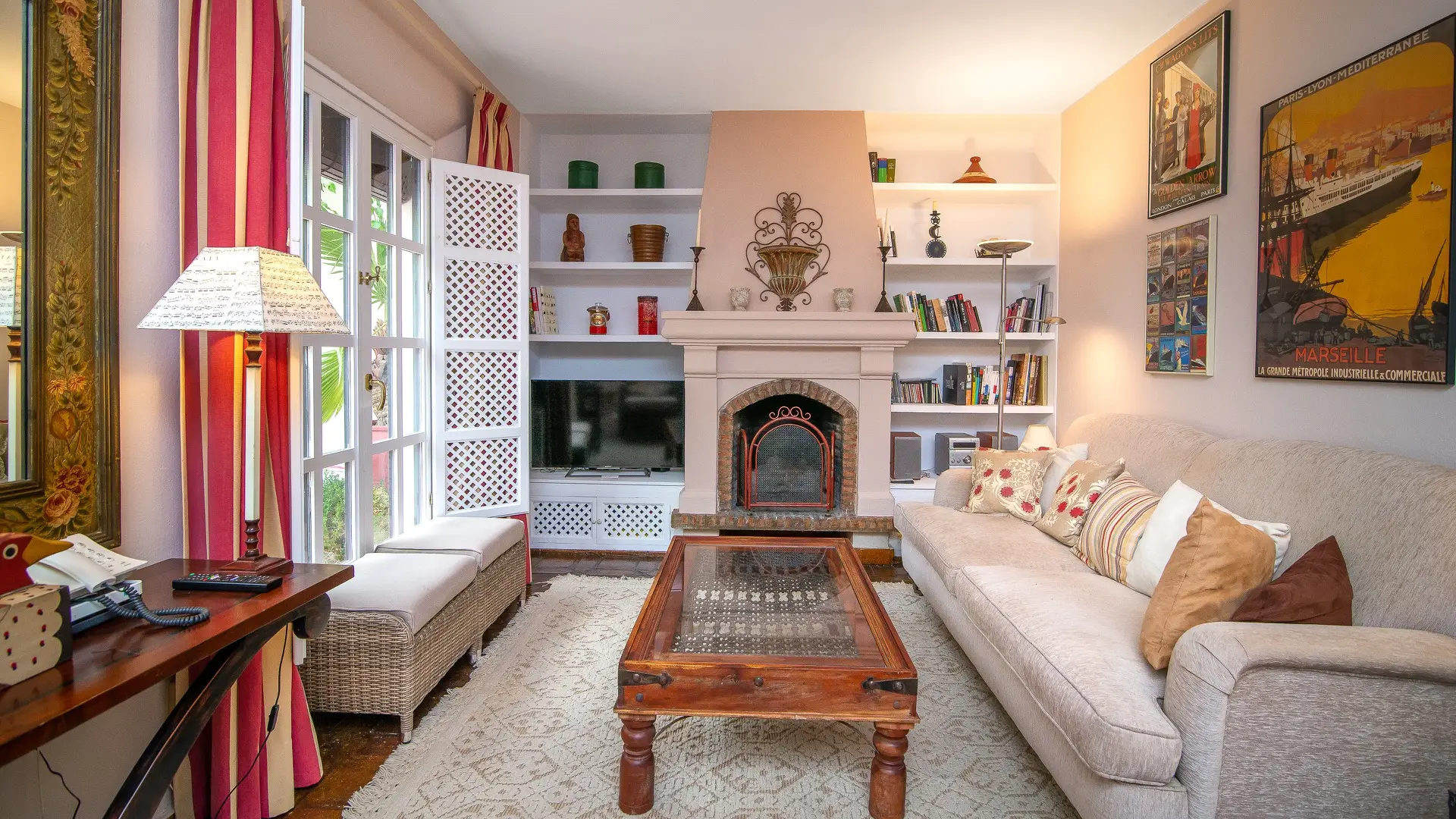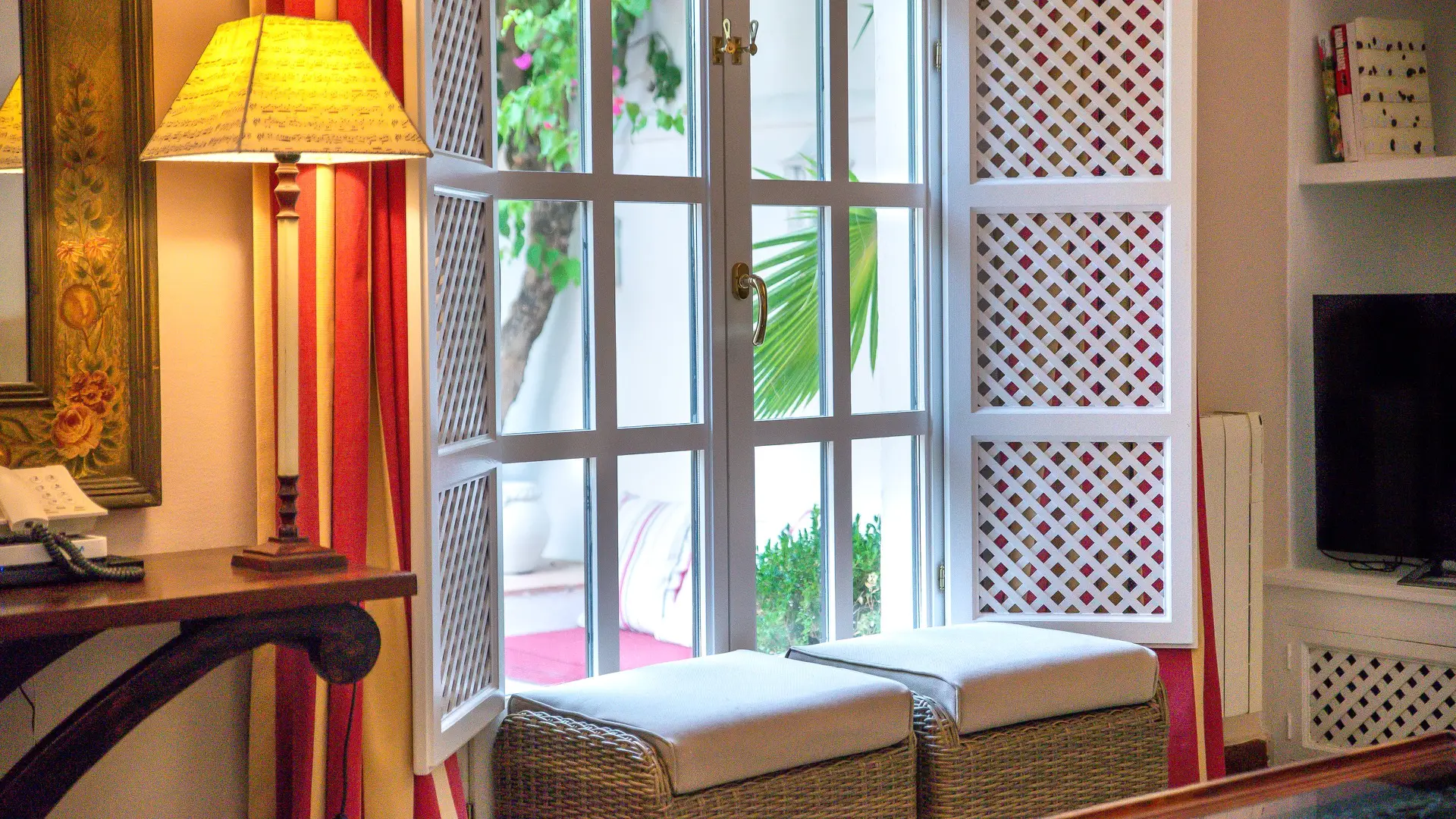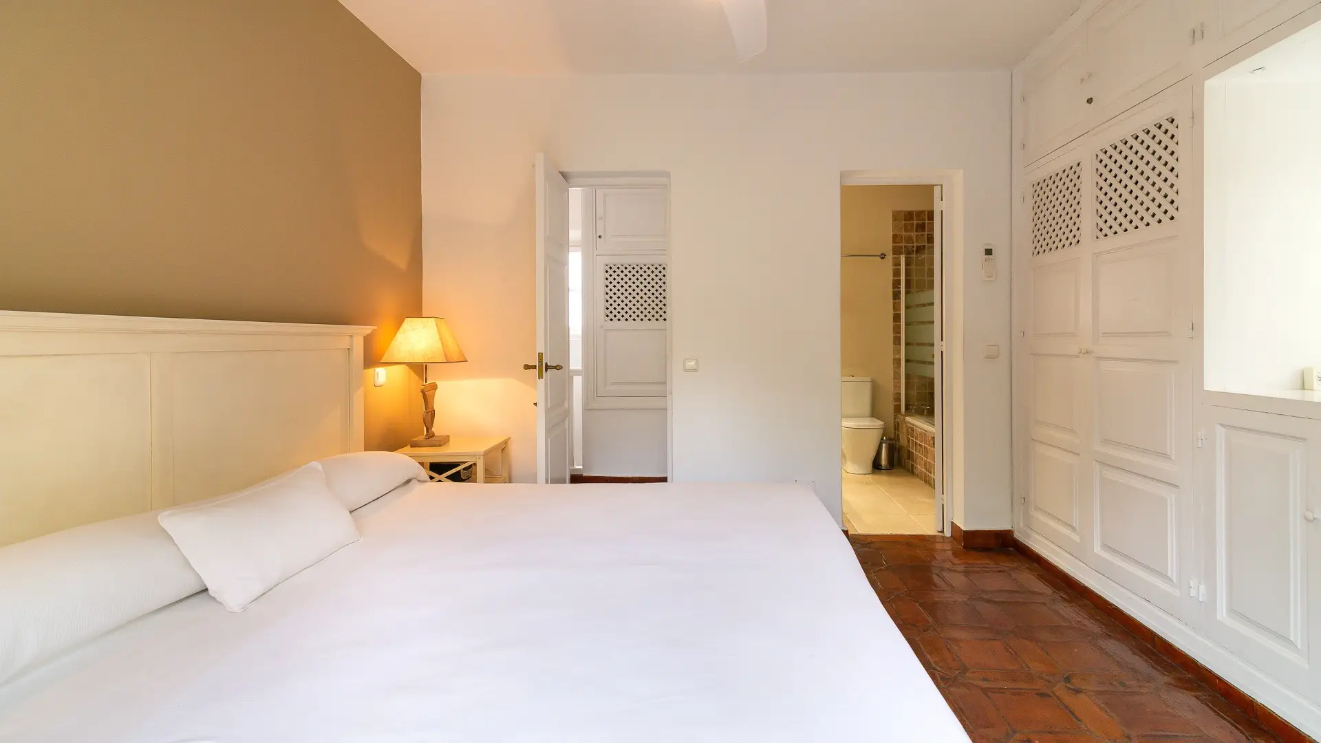 Upstairs, two cozy bedroom suites await, each with its own en-suite bathroom, generous wardrobes, and independent air conditioning. French doors open to intimate balconies, offering romantic glimpses over the patio and a whisper of Mediterranean breeze.