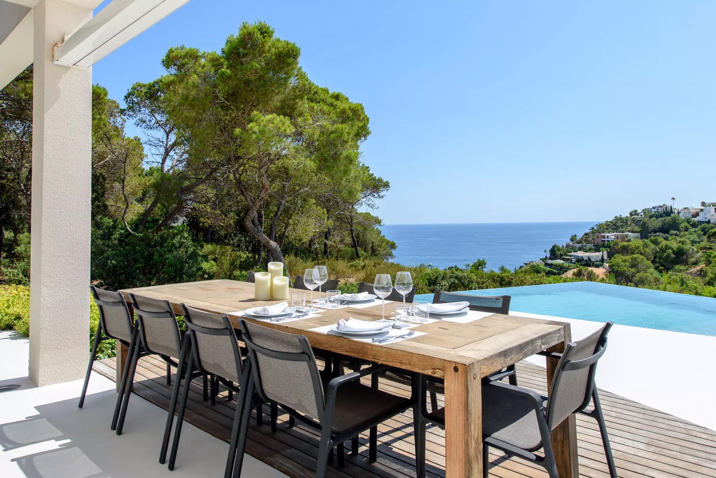 The sheltered lounge seating under a wooden-roofed pergola with al-fresco bar provides a shaded chill-out space perfect for enjoying the Ibizan sunsets.