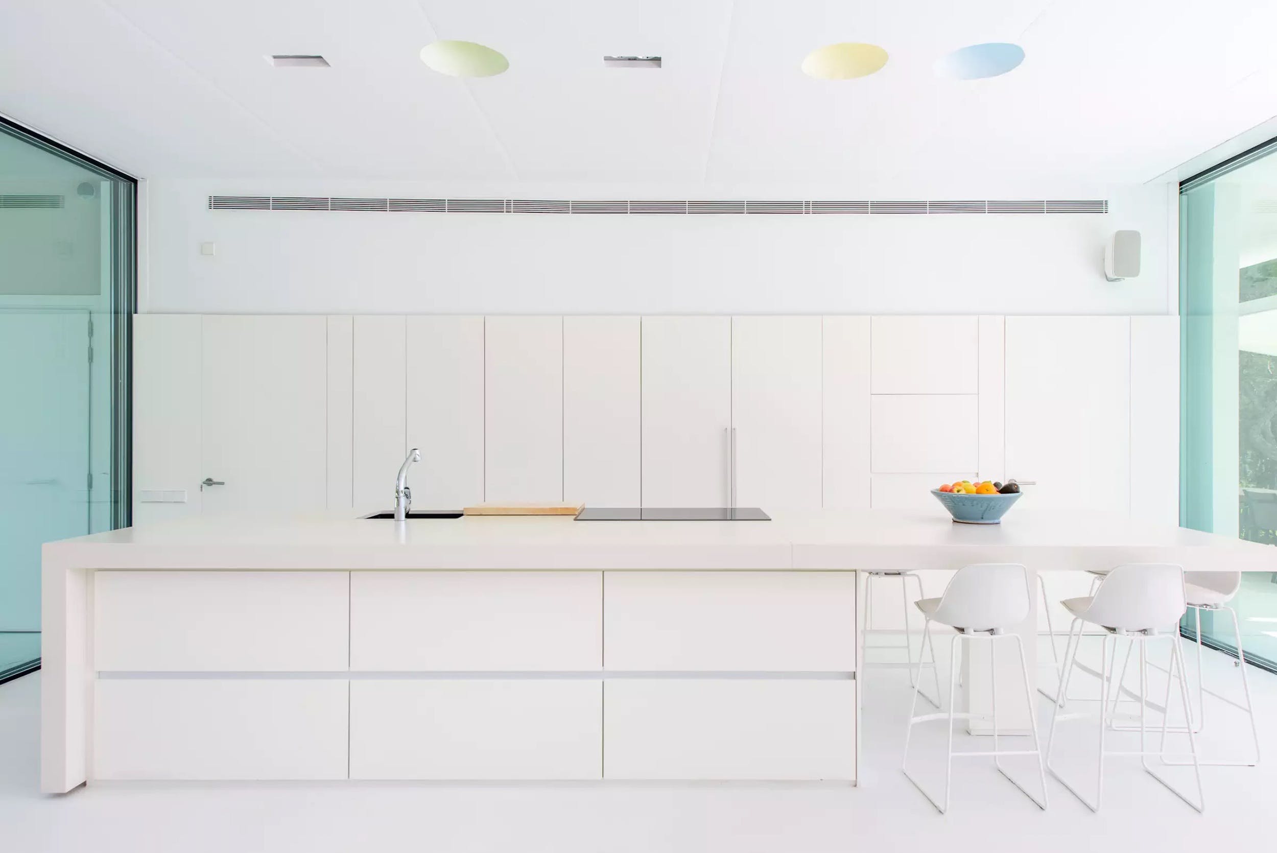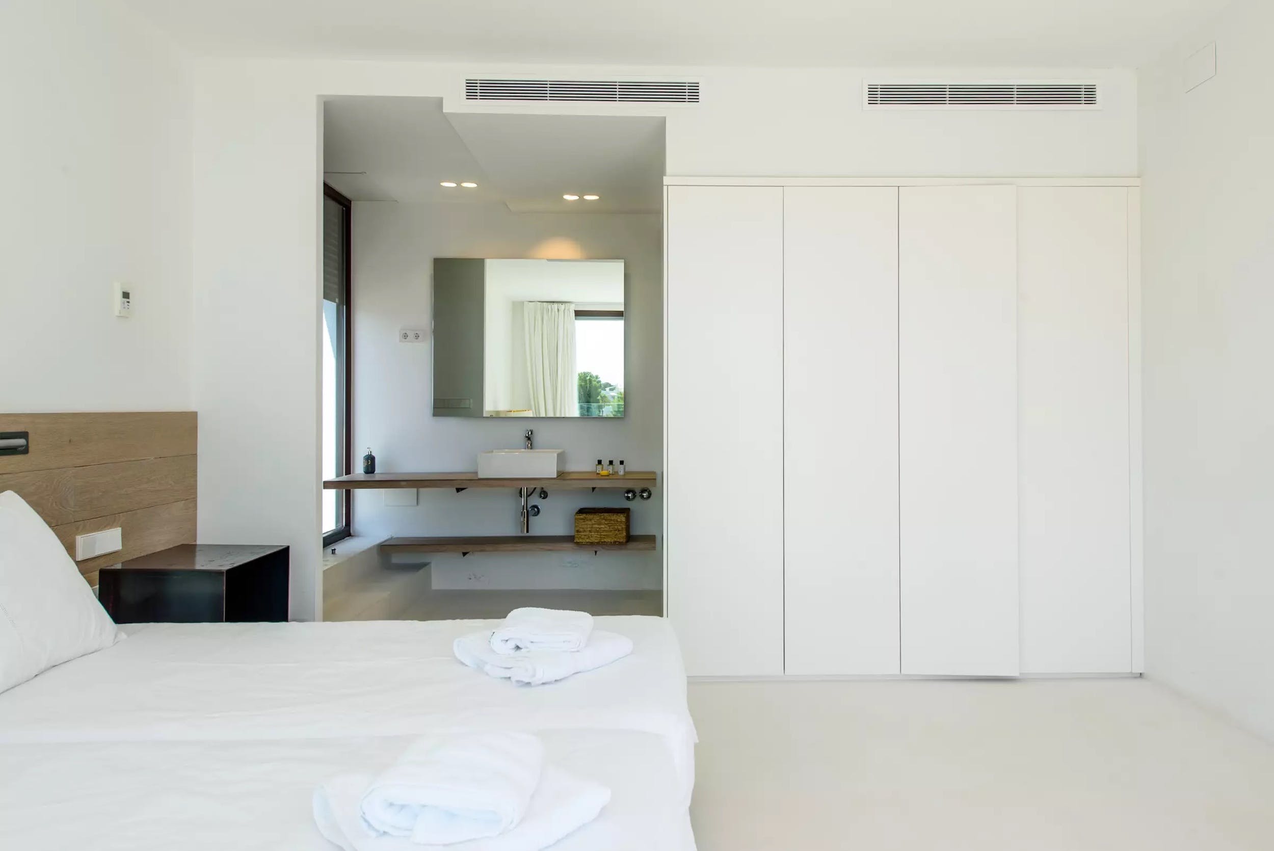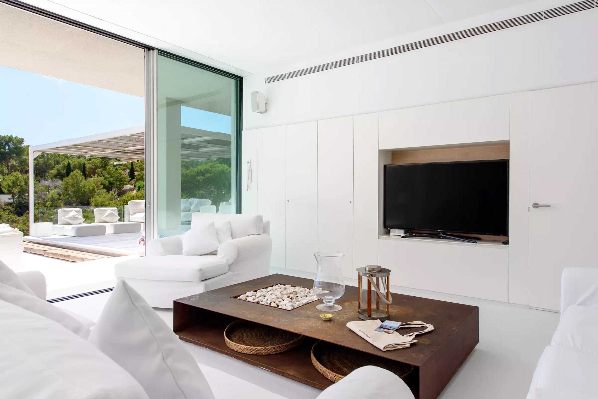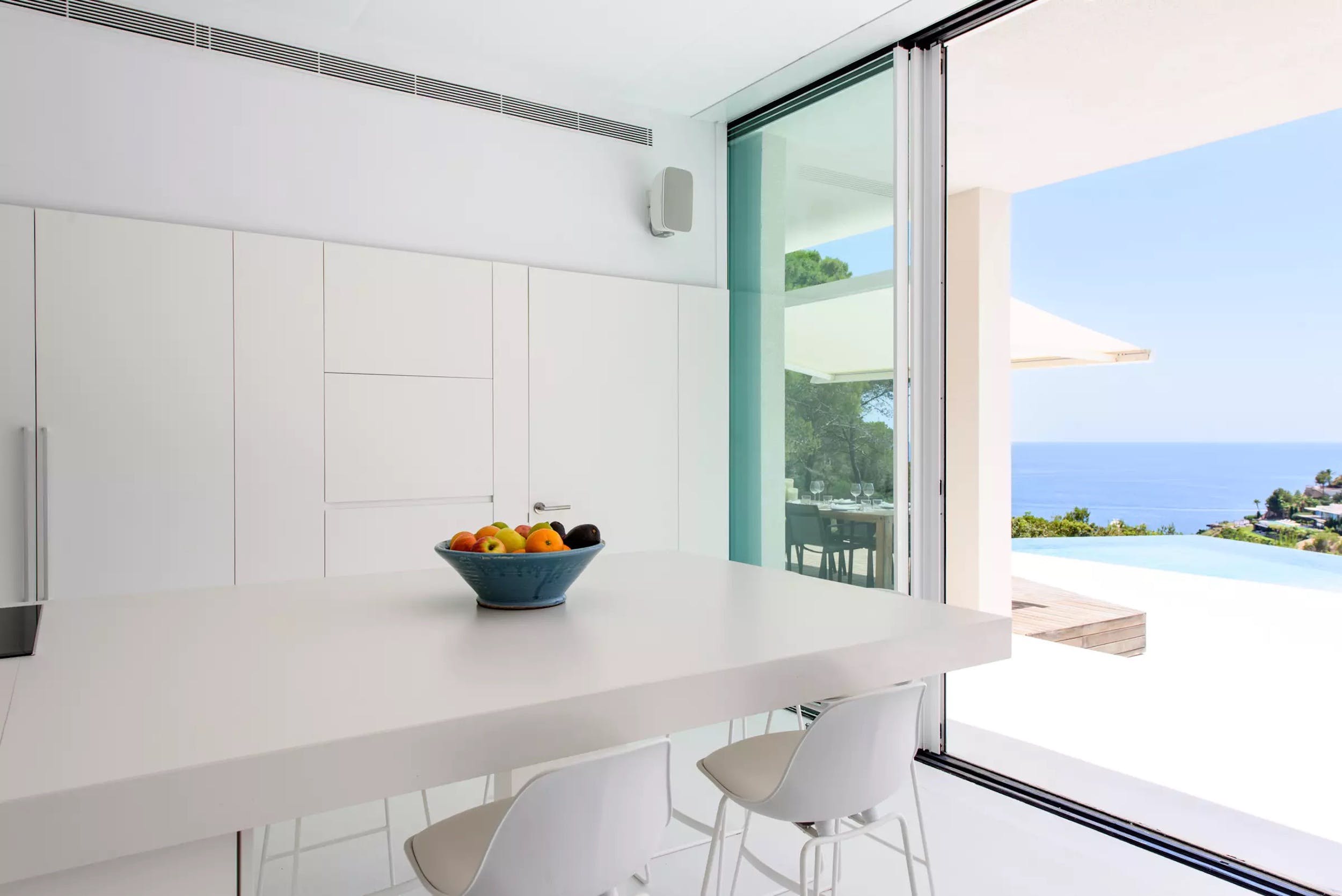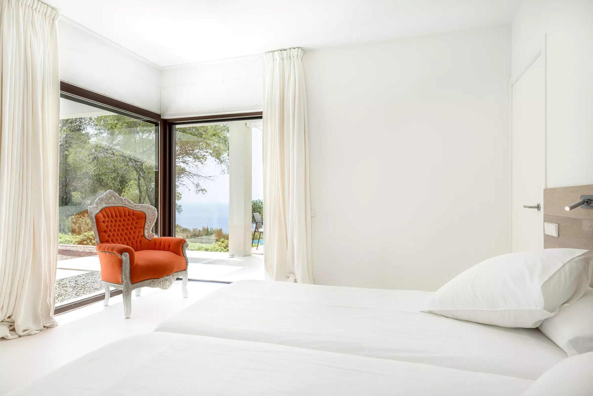 Inside, a single open-plan living space can be opened to the fresh Ibizan air on two sides, thanks to the enormous sliding glass doors. The chic interiors are the last word on pure white minimalism with the focus on comfort.