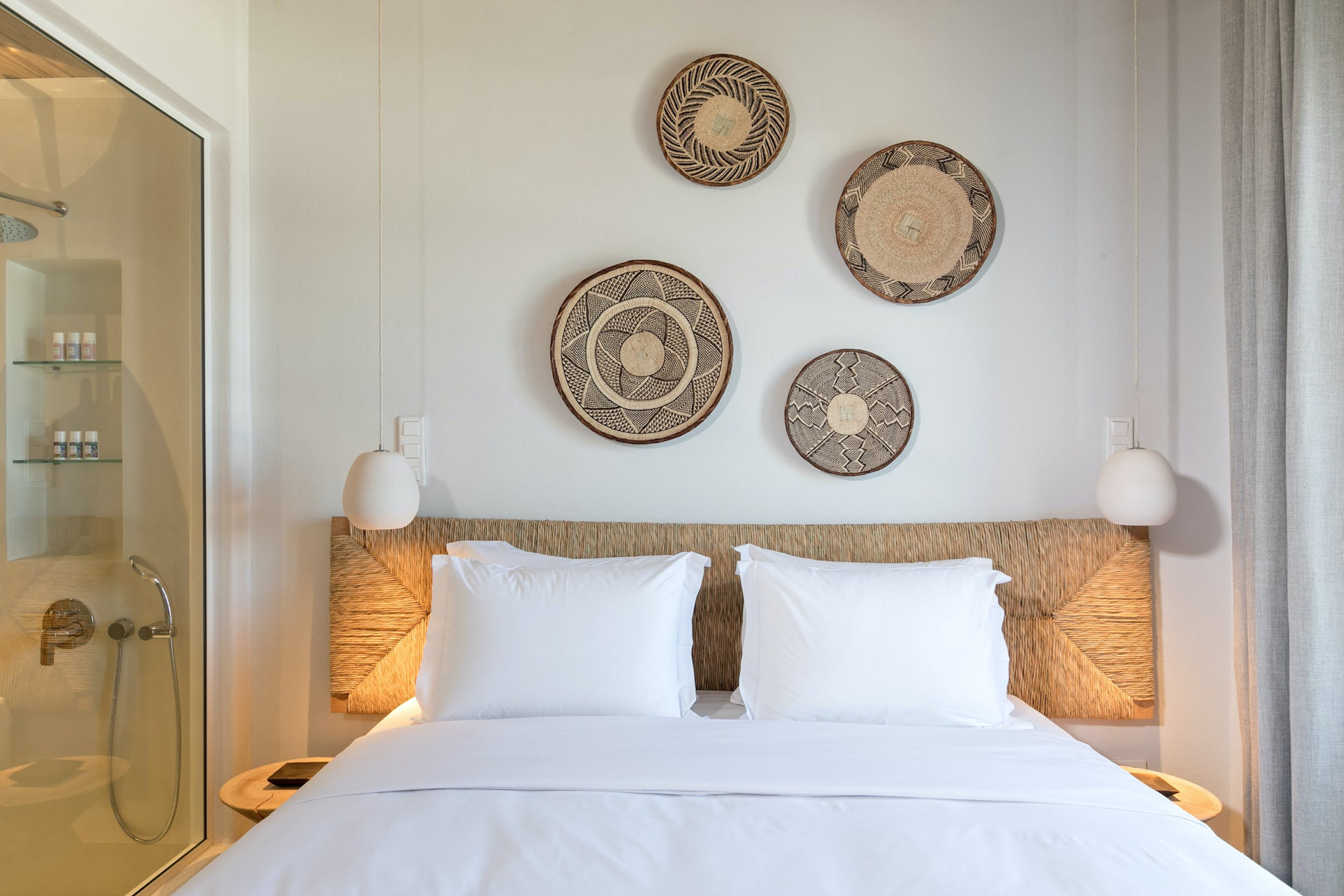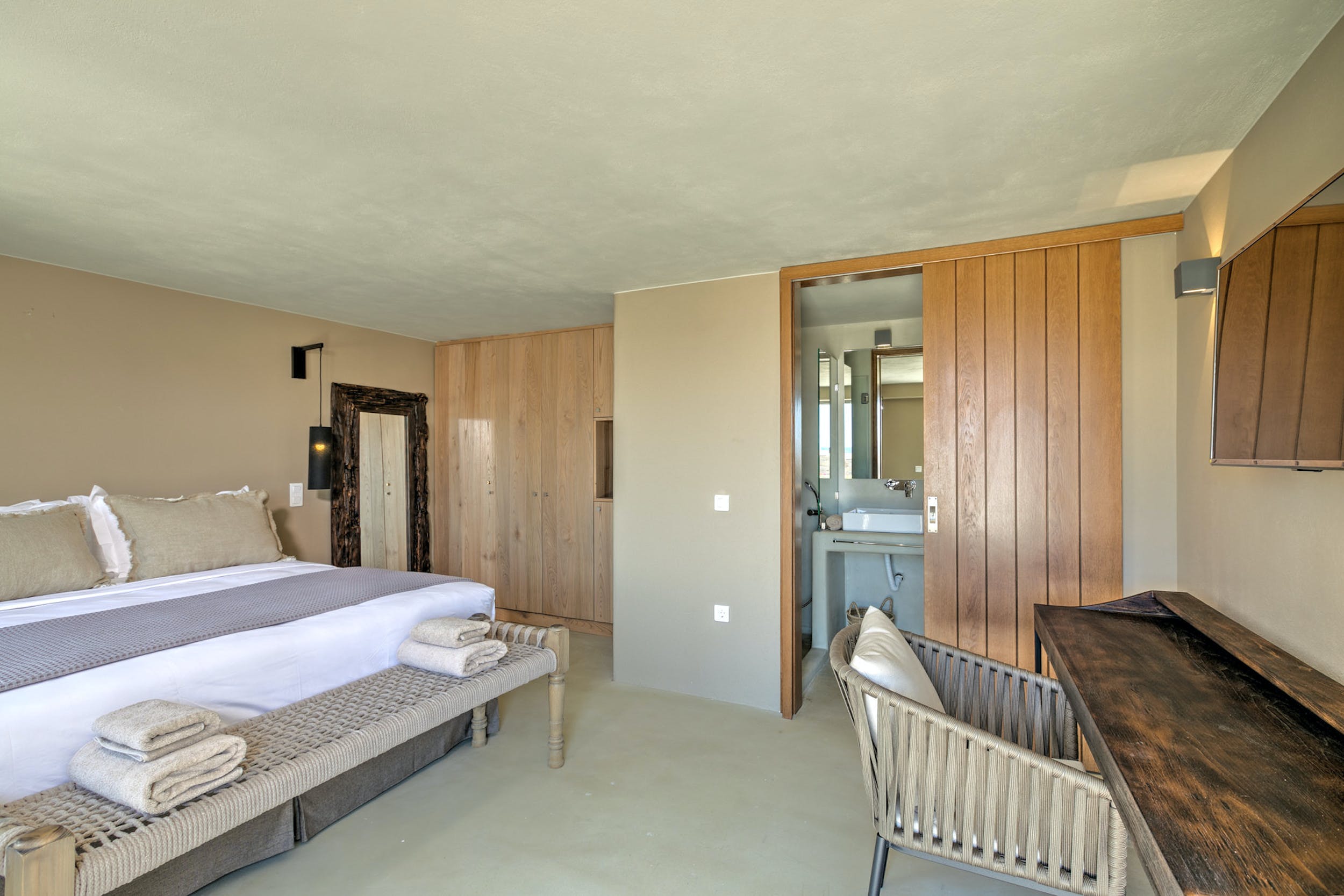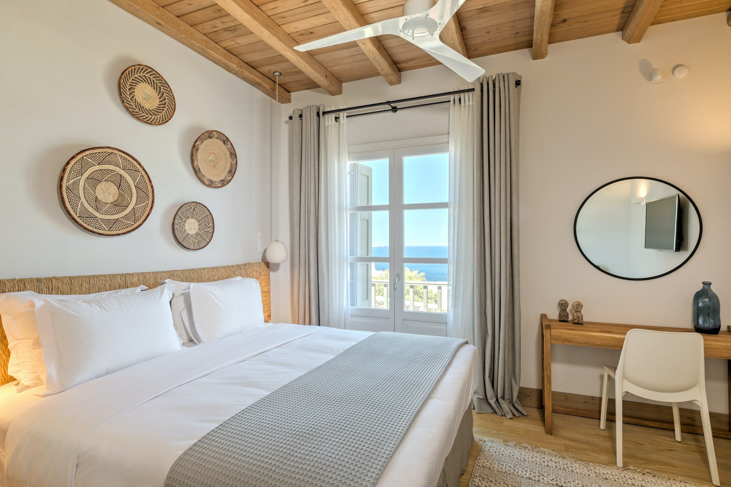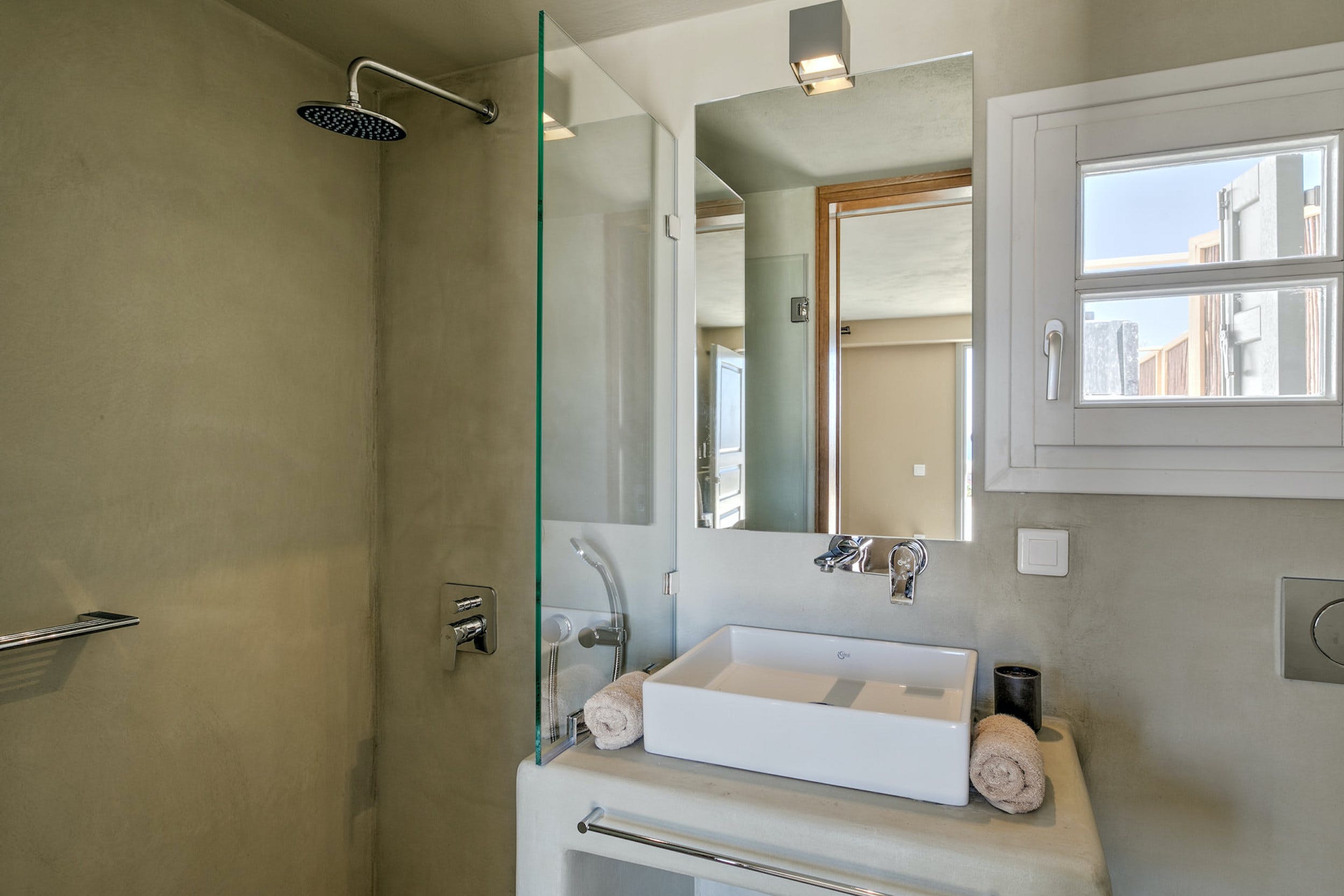Main House – Double bedroom, en-suite bathroom with shower, air conditioning, safe box, access to private balcony with direct sea views.