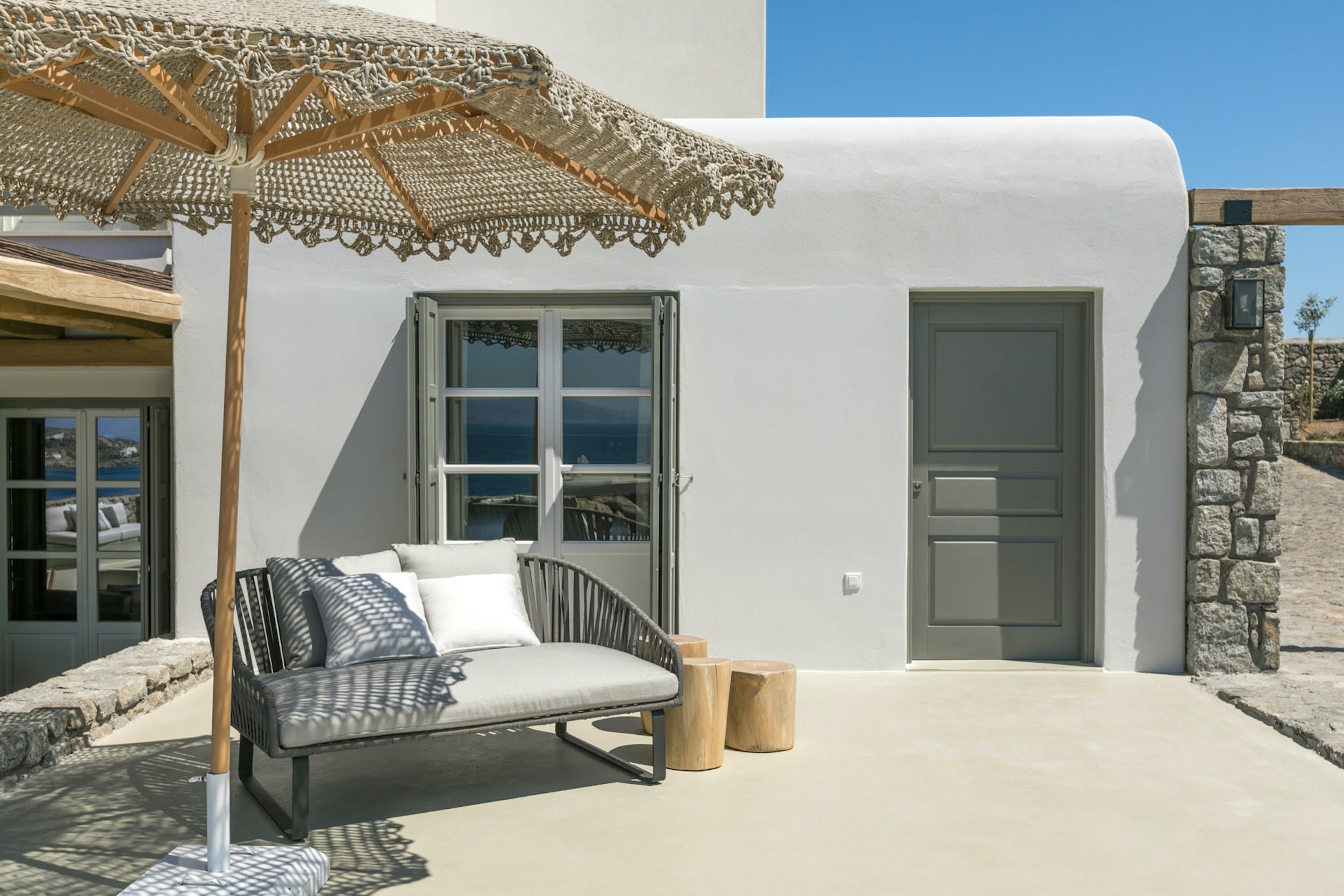 Main House – Double bedroom, air conditioning, en-suite bathroom with shower and bath, safe box, access to large private balcony with day beds and sea views.