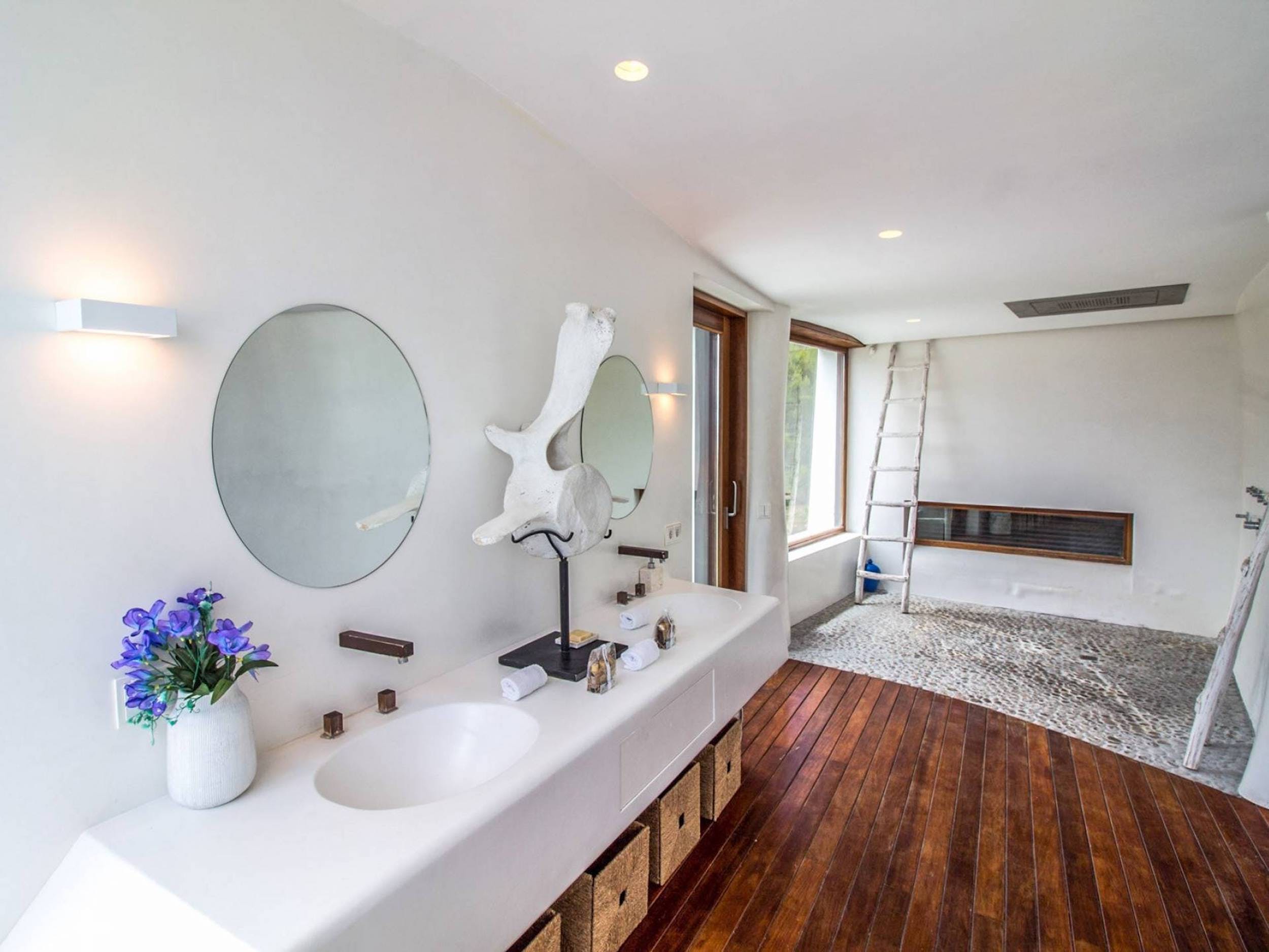 Here, a curvaceous bank of sofa seating opens onto a private terrace. The mezzanine level above is dominated by a feature oval king-size bed and a suspended feature fireplace at one end. Not to be outdone, the master en-suite features a huge oval bathtub with tropical garden views.