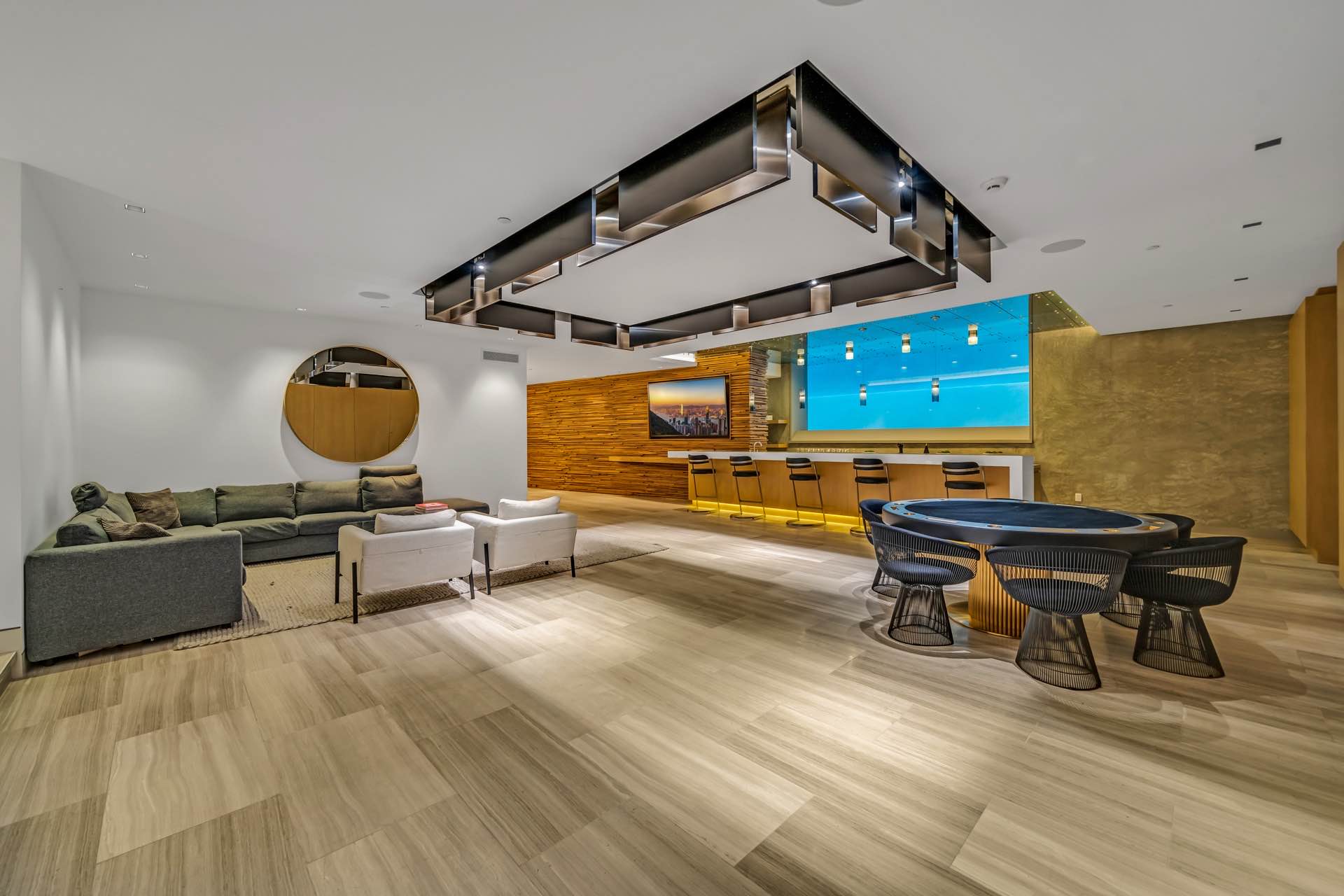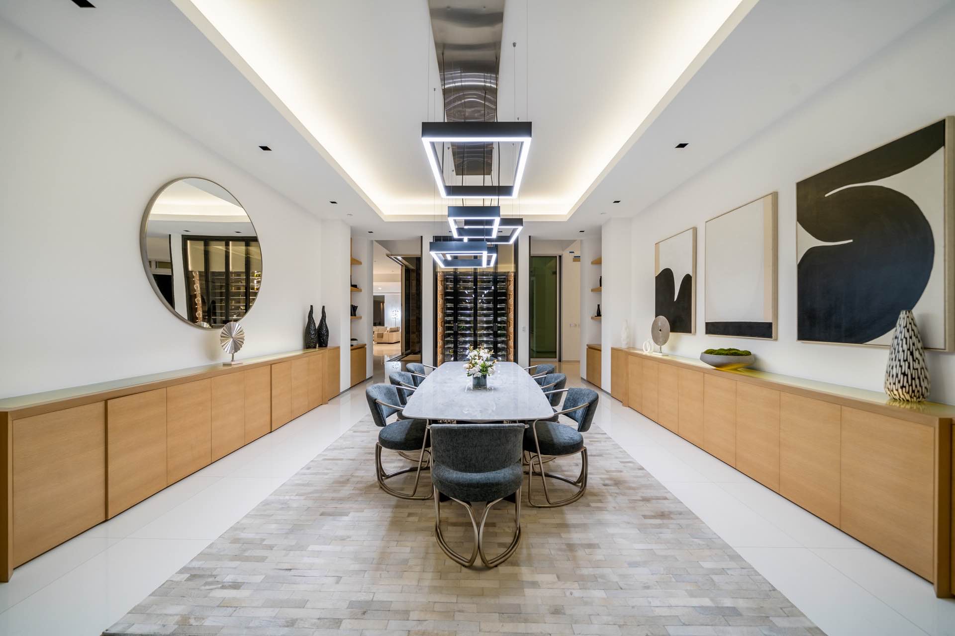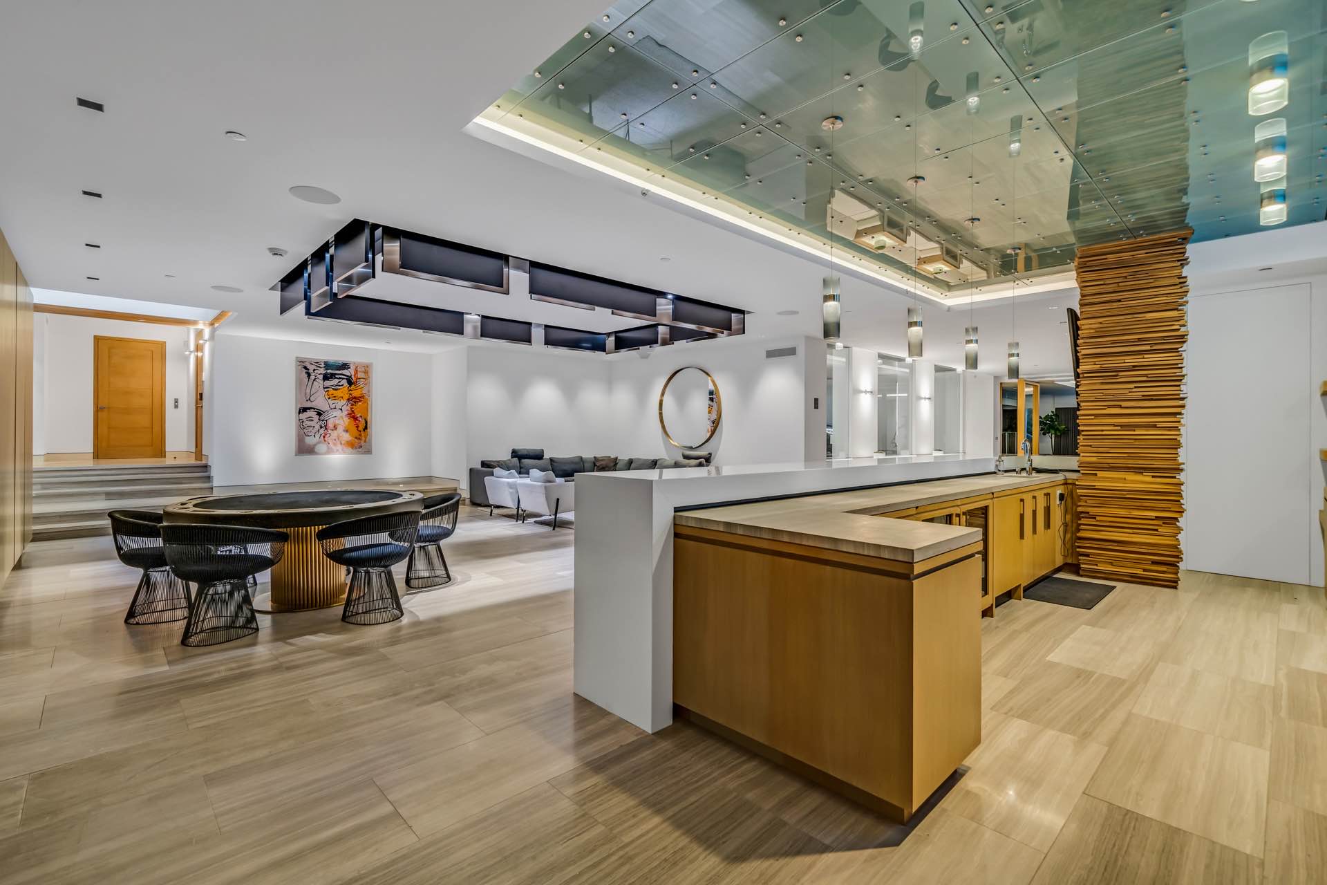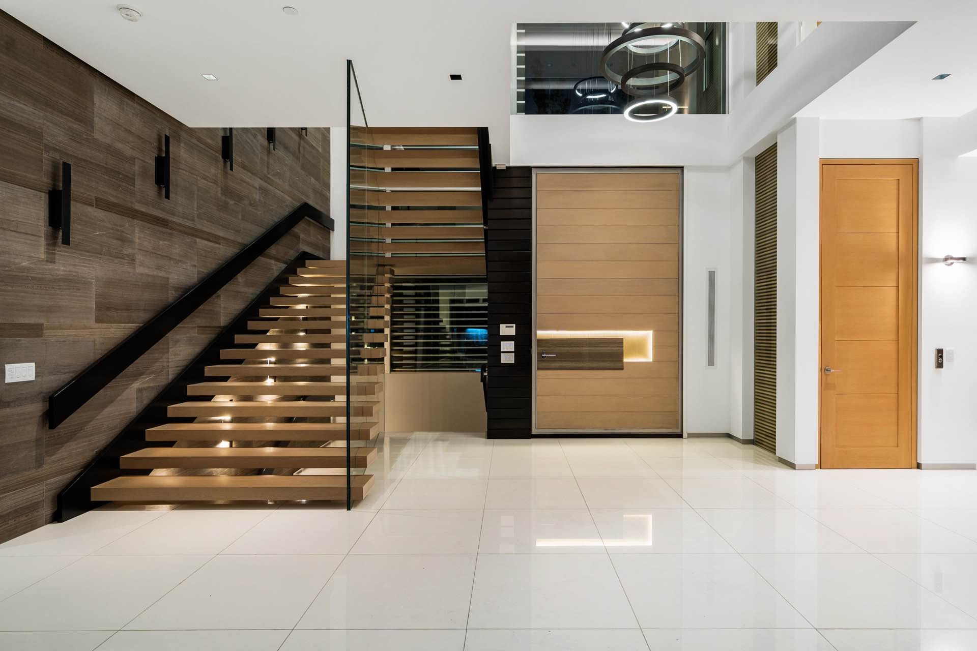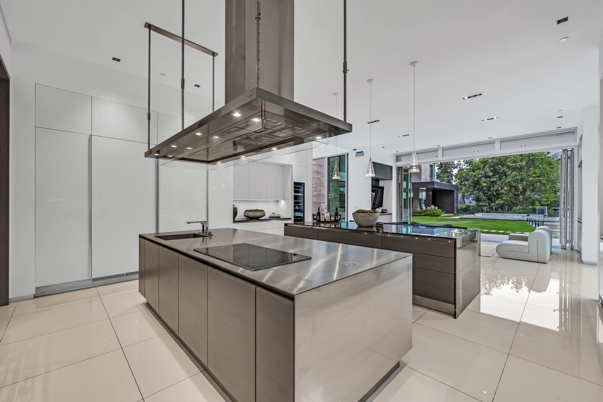 Beyond the home’s massive front pivot door, soaring ceilings and floating staircase is a setting both serene and powerful. A built-in smart entertainment system and concealed speakers are featured in the adjacent kitchen, living, and family areas on the main floor, lower and upper levels.