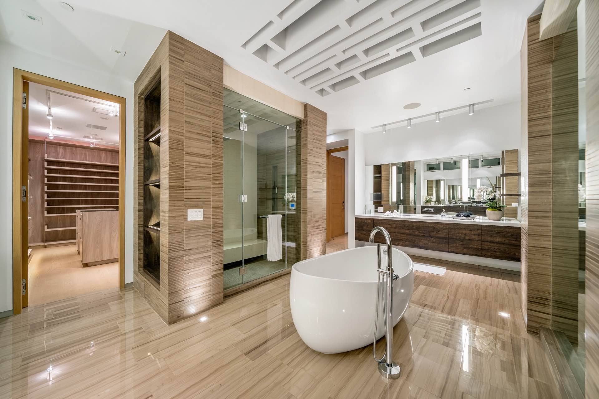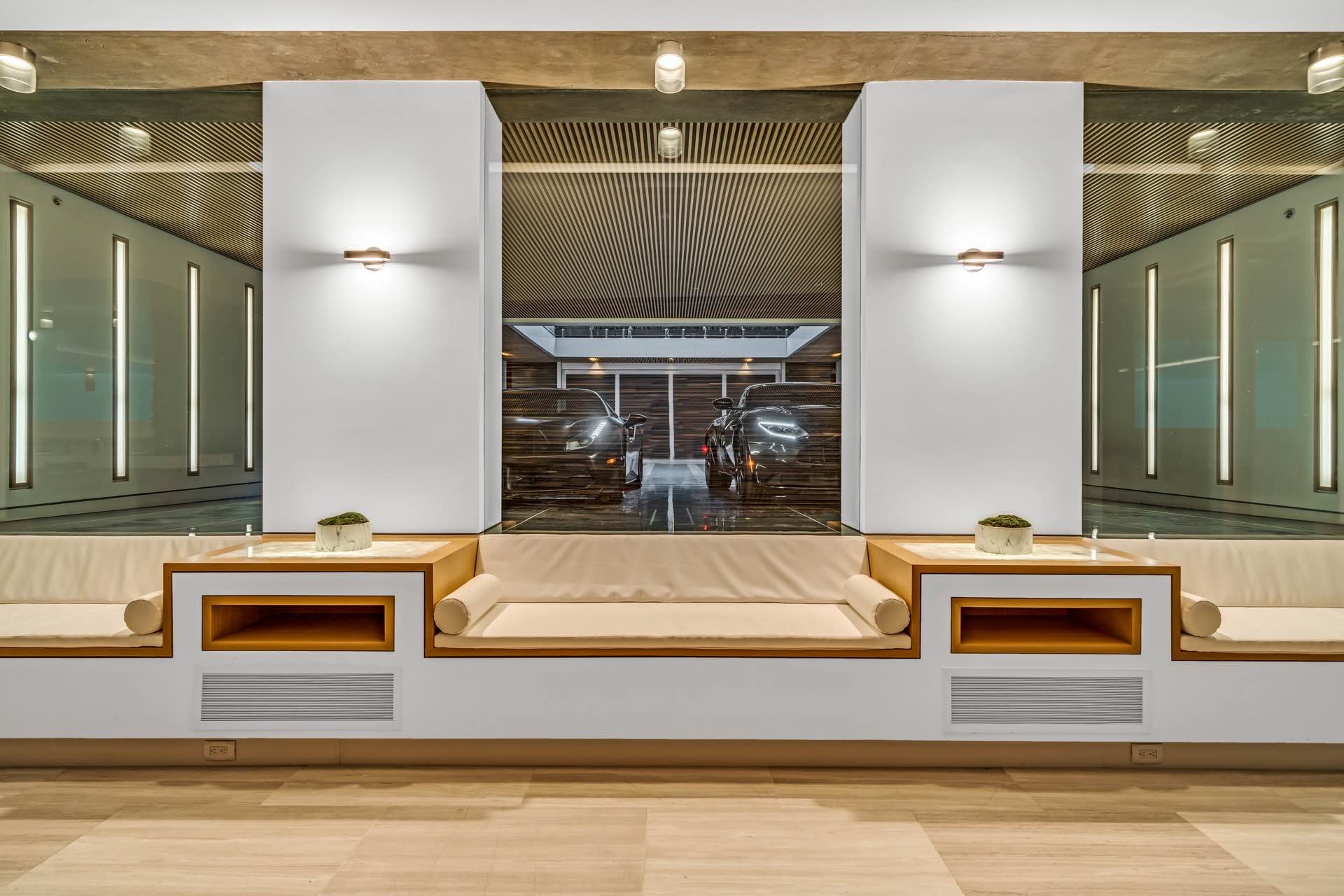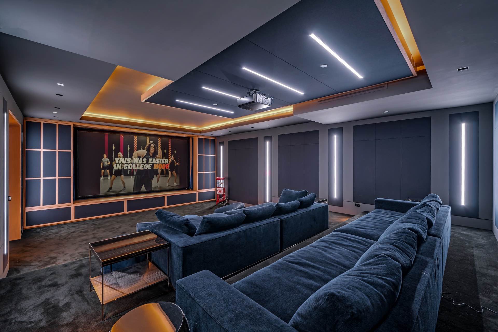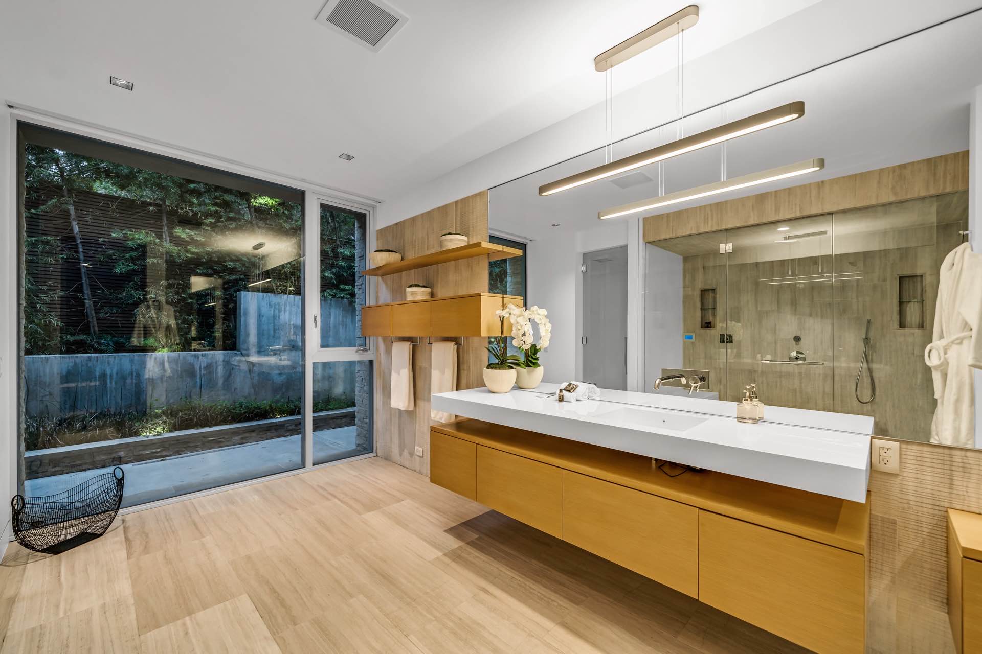 Beyond the home’s massive front pivot door, soaring ceilings and floating staircase is a setting both serene and powerful. A built-in smart entertainment system and concealed speakers are featured in the adjacent kitchen, living, and family areas on the main floor, lower and upper levels.