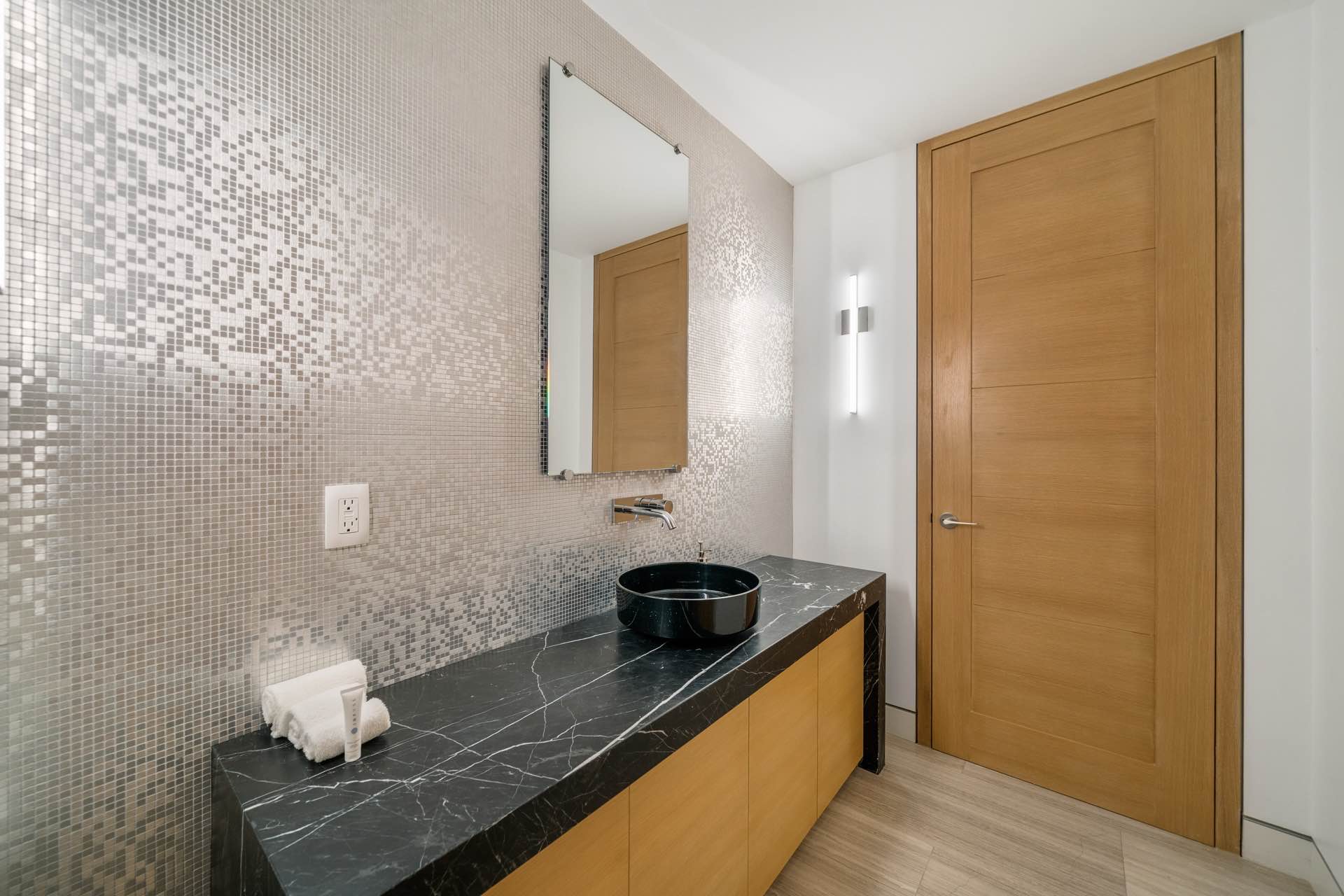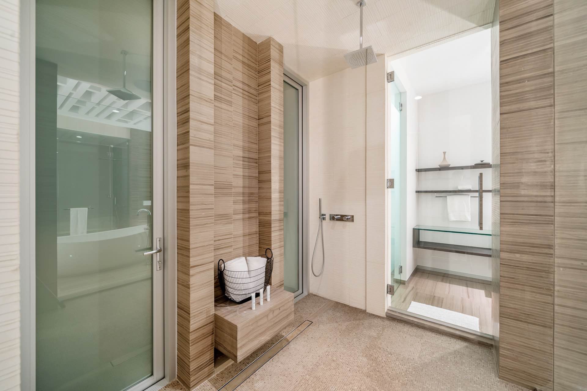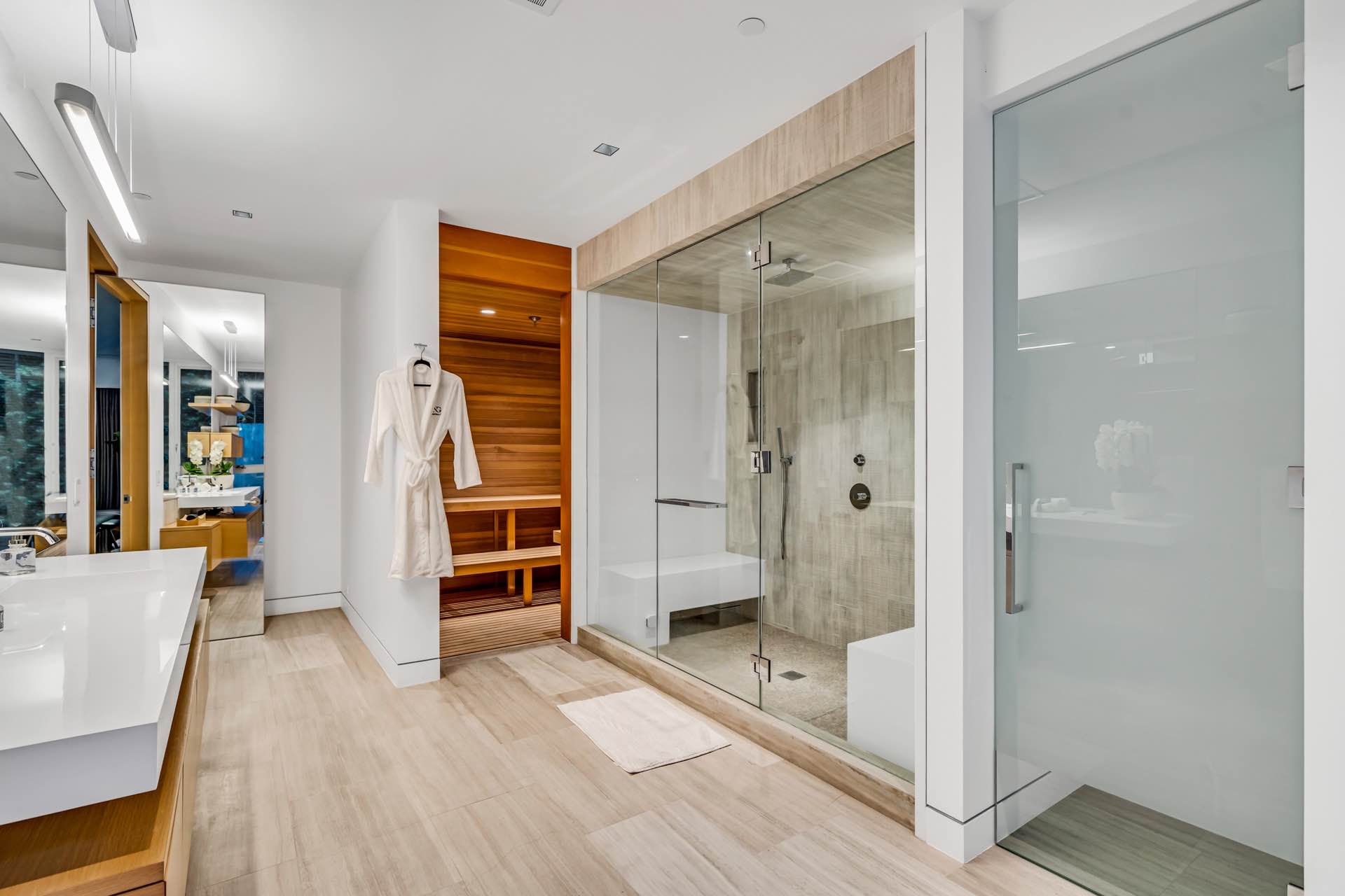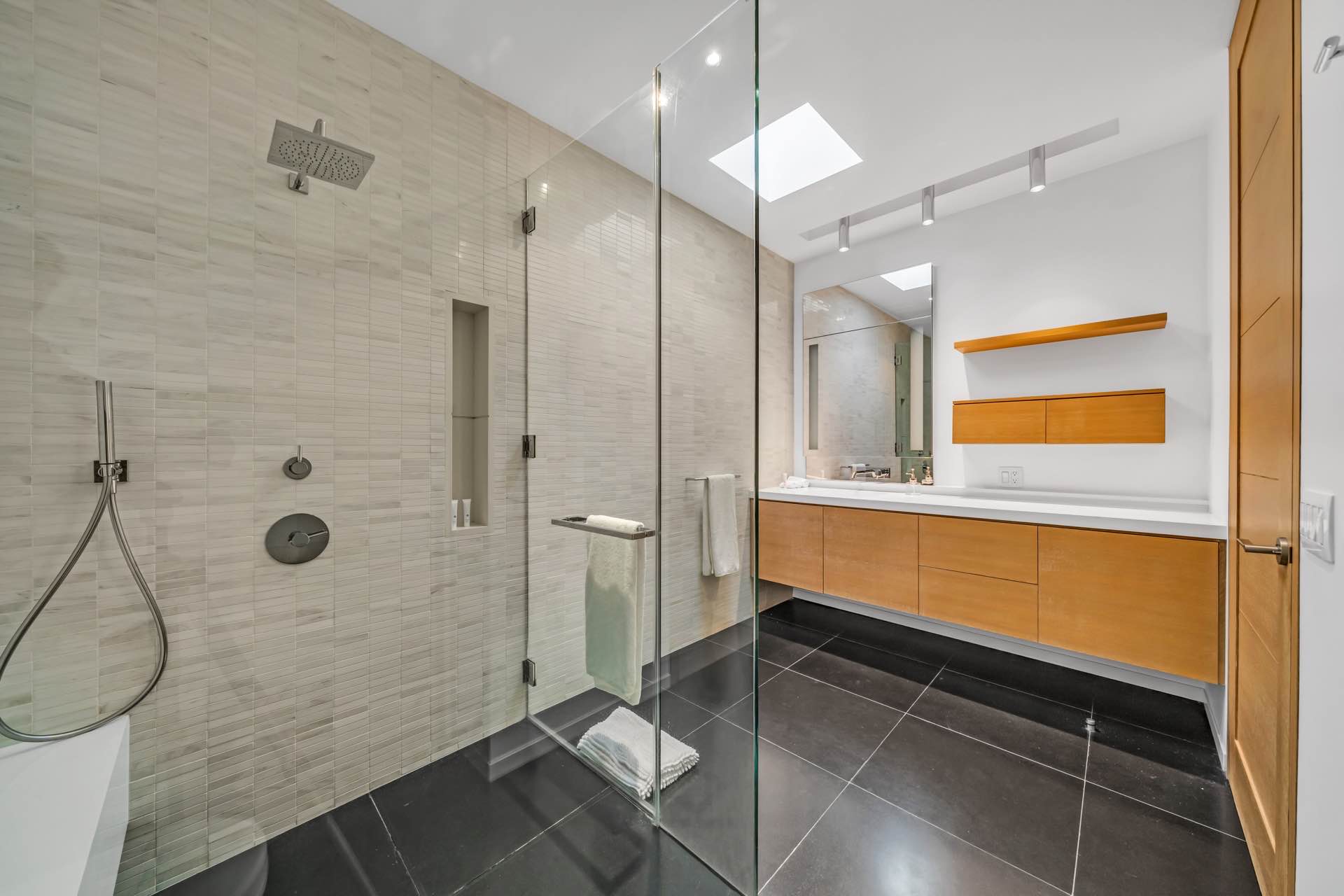 Continuing upwards to the second level reveals an intimate family room and 4 en-suite bedrooms with balconies, walk-in-closets, and white oak hardwood flooring. The master suite reveals a sleek bathroom boasting oversized showers, the latter leading to a luxurious outdoor shower on the balcony. The gorgeous dual vanities with stone finishes and custom designed skylight all center around a freestanding bath tub.
