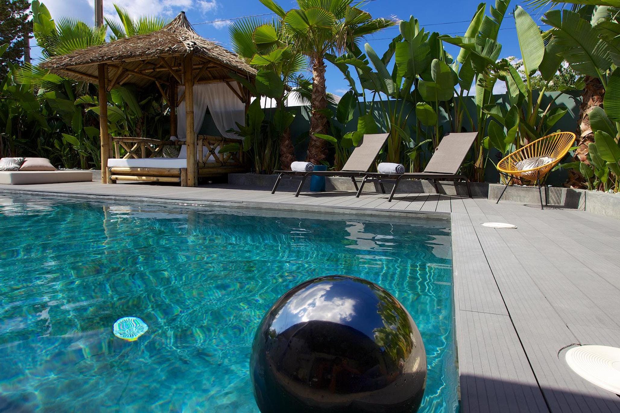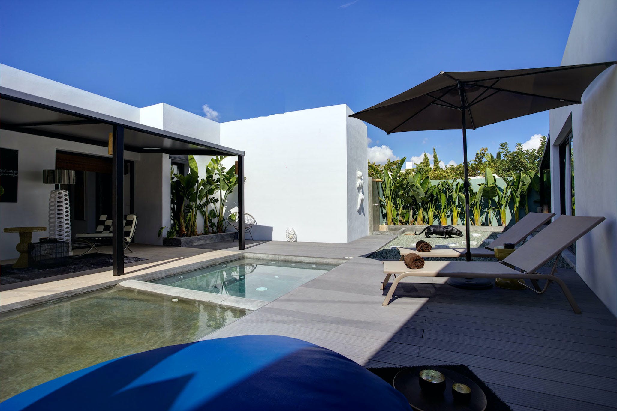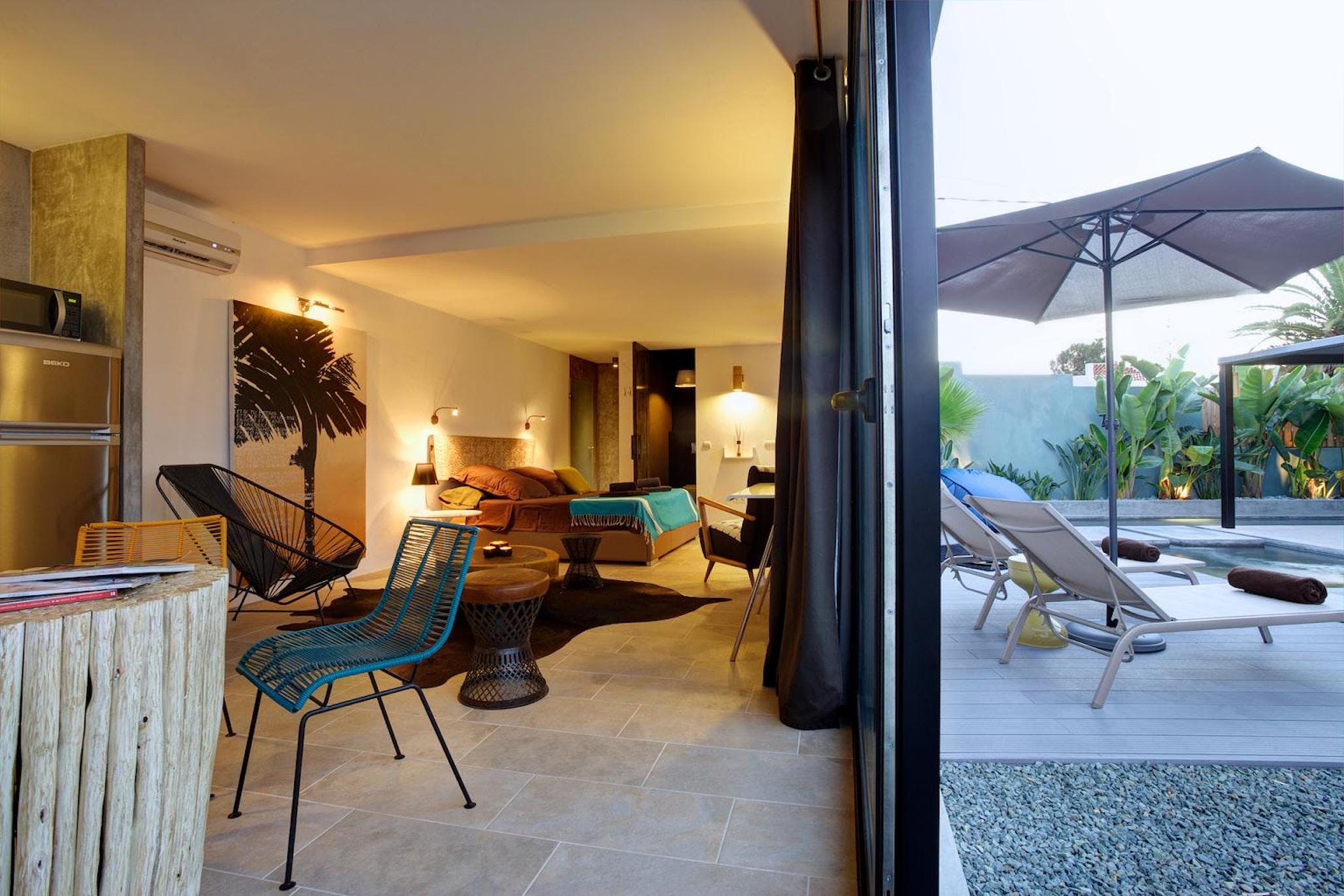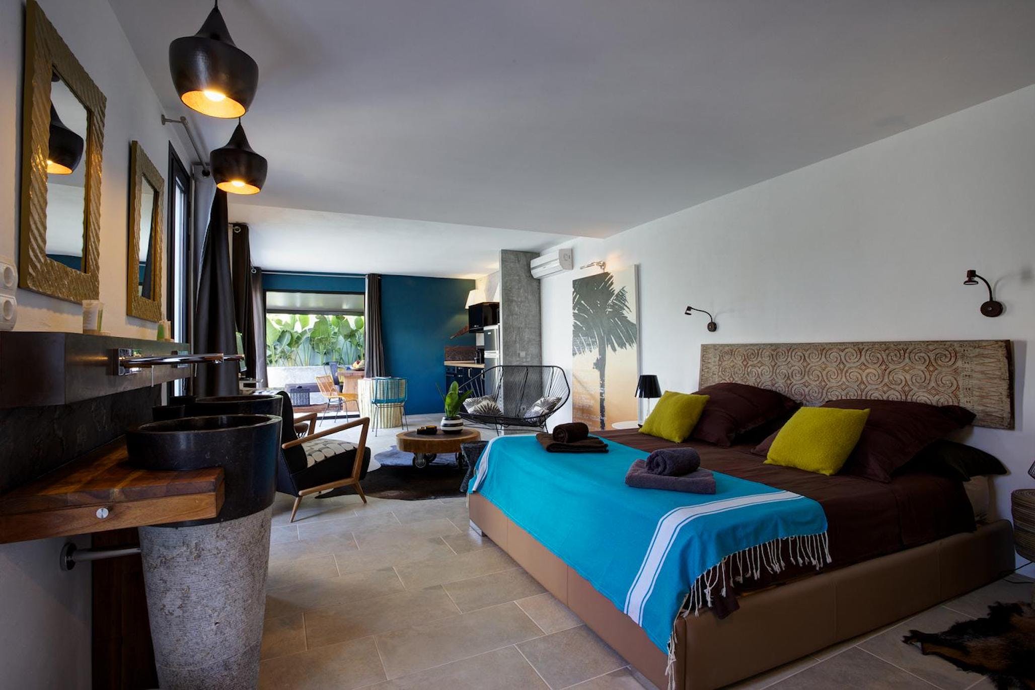 Main House – 40 sqm – King size bed, LED TV with satellite, French channel decoder, air conditioning, safe box. Private terrace / outdoor lounge area with a large circular sofa, Barcelona chair and Jacuzzi view. En-suite bathroom with bath and shower.