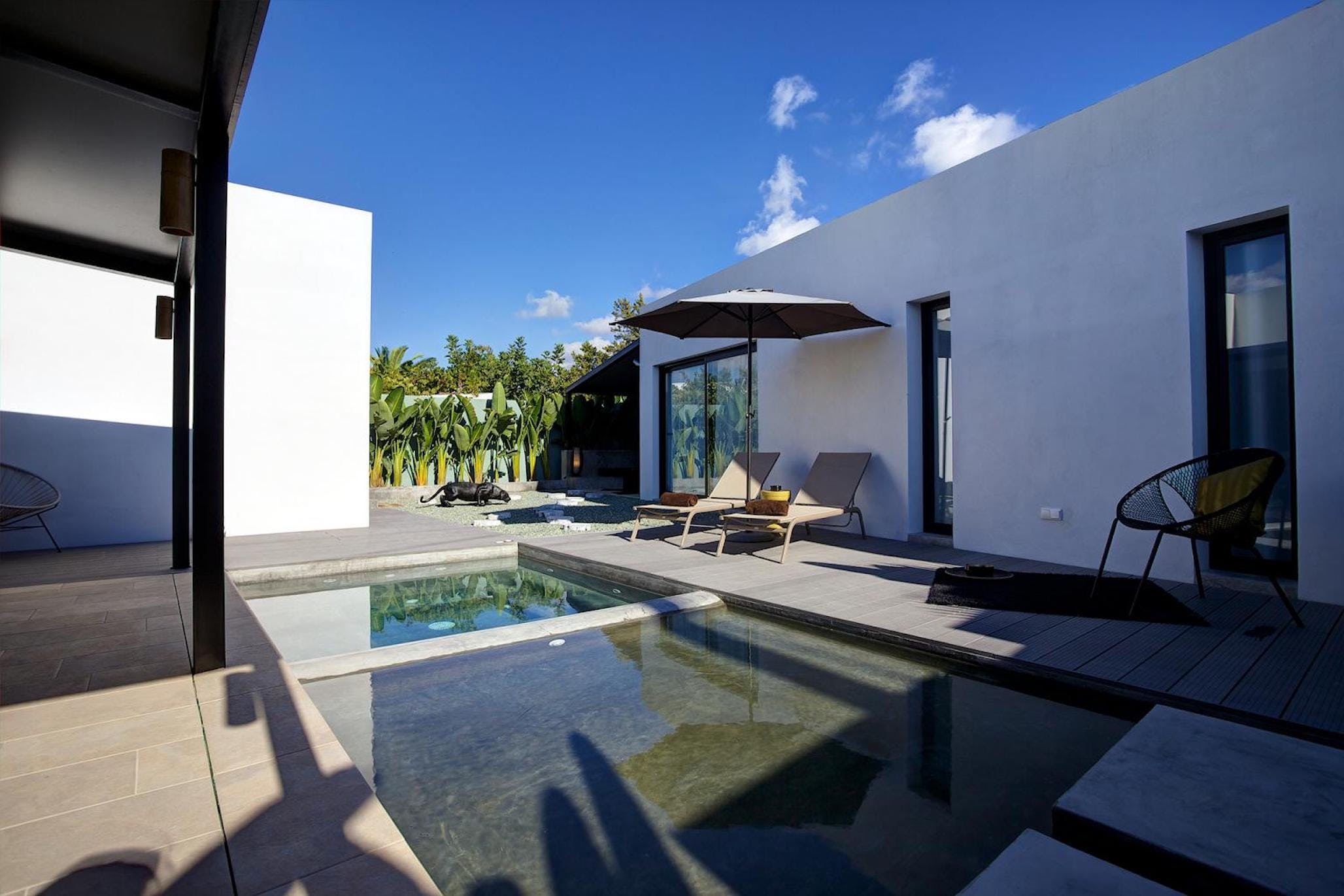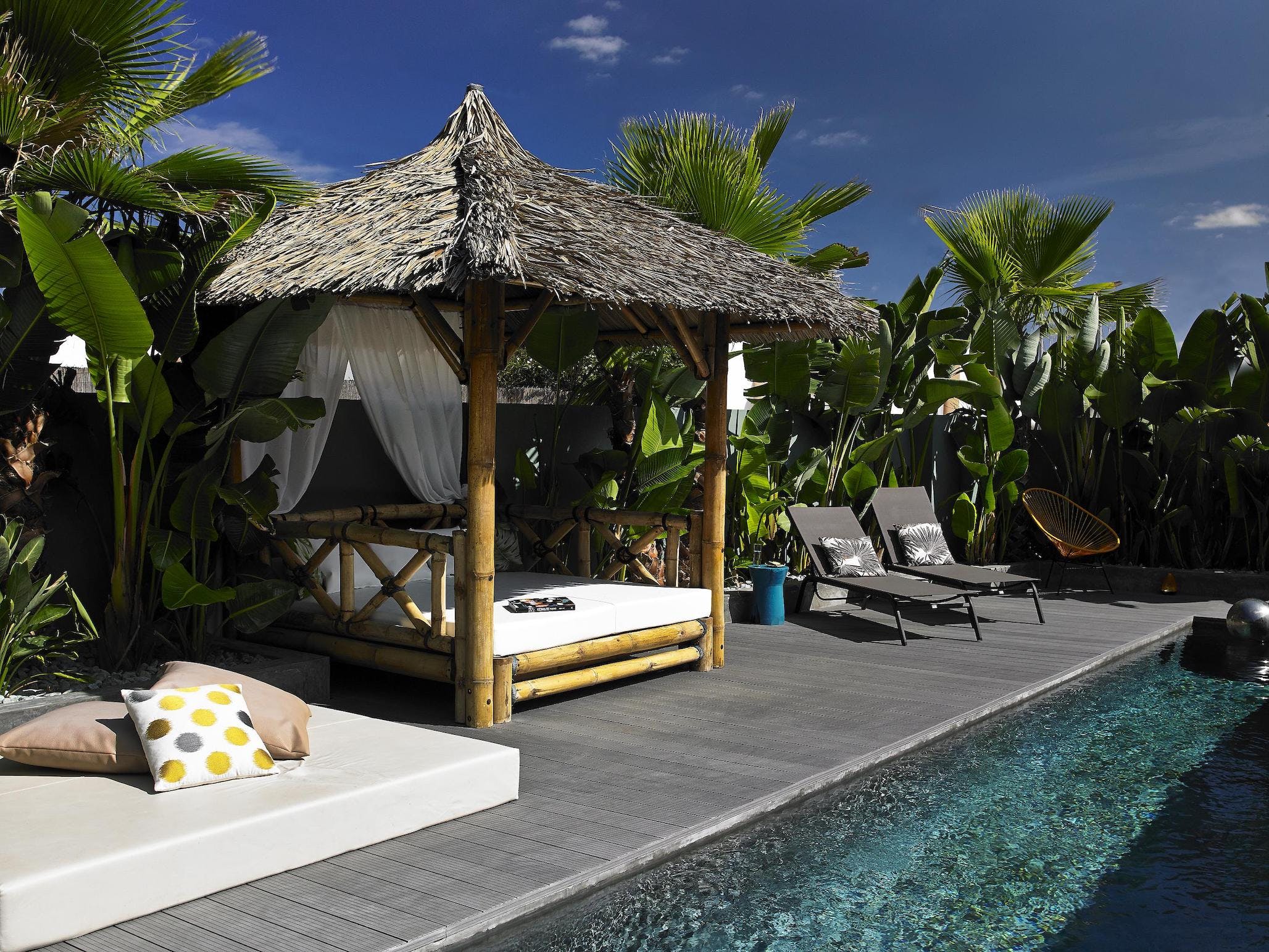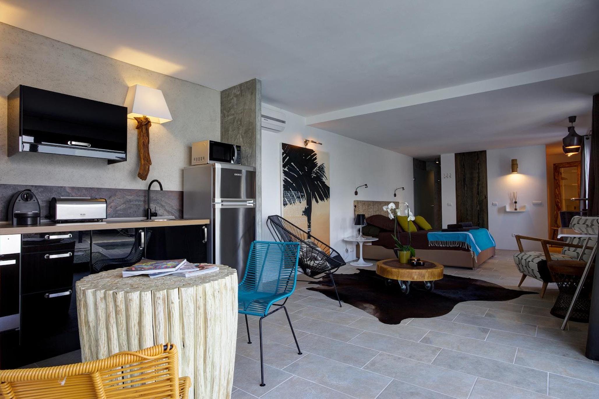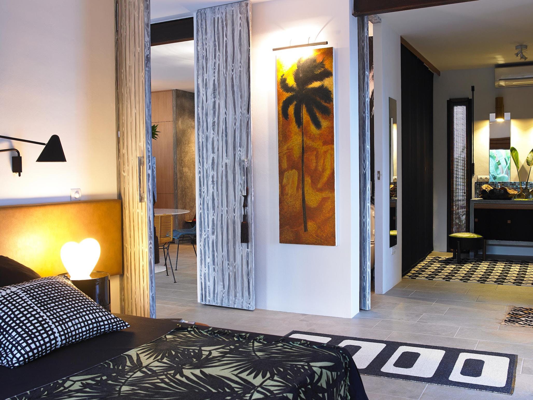 Main House – 40 sqm – King size bed, LED TV with satellite, French channel decoder, air conditioning, safe box. Private terrace / outdoor lounge area with a large circular sofa, Barcelona chair and Jacuzzi view. En-suite bathroom with bath and shower.