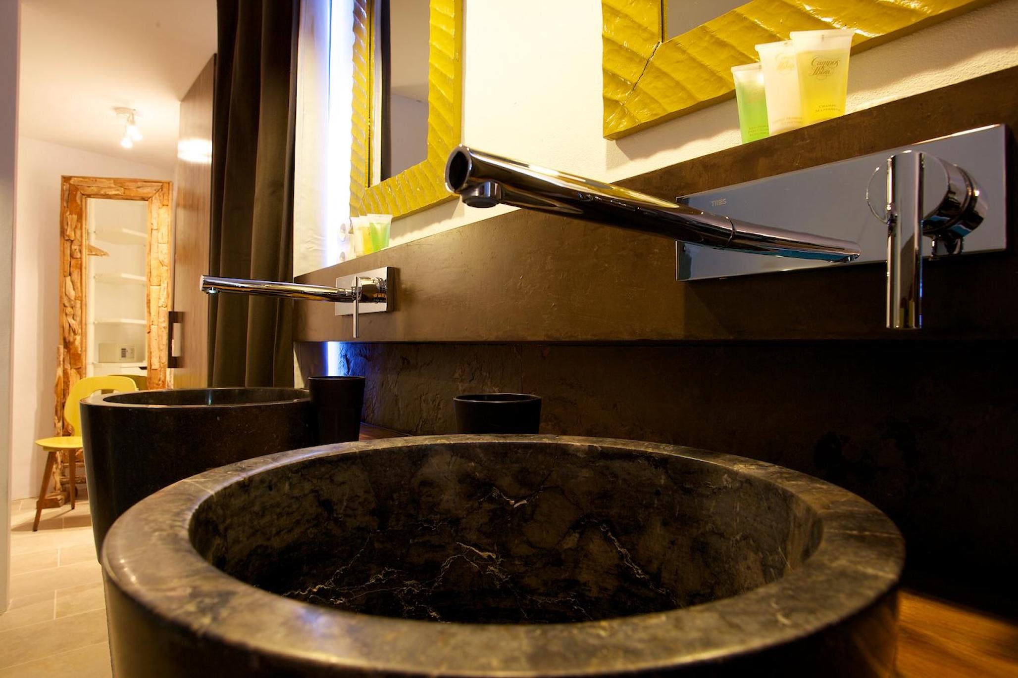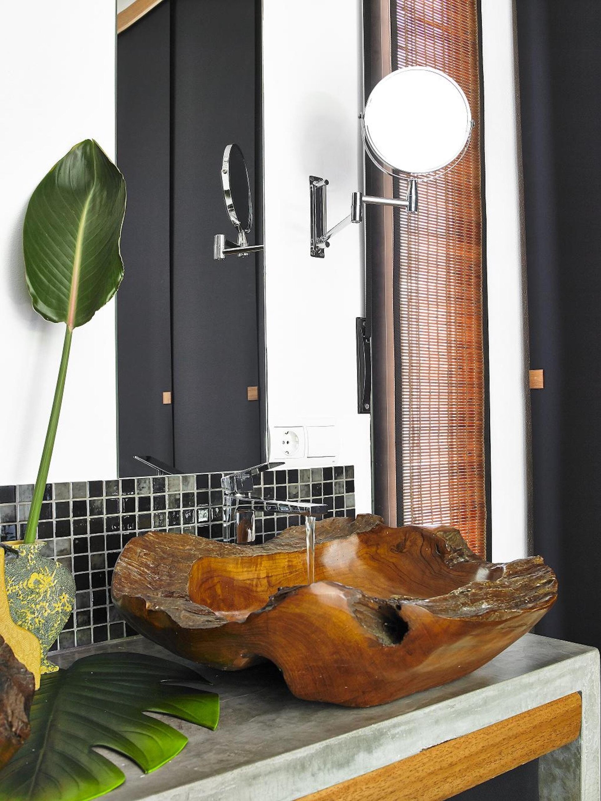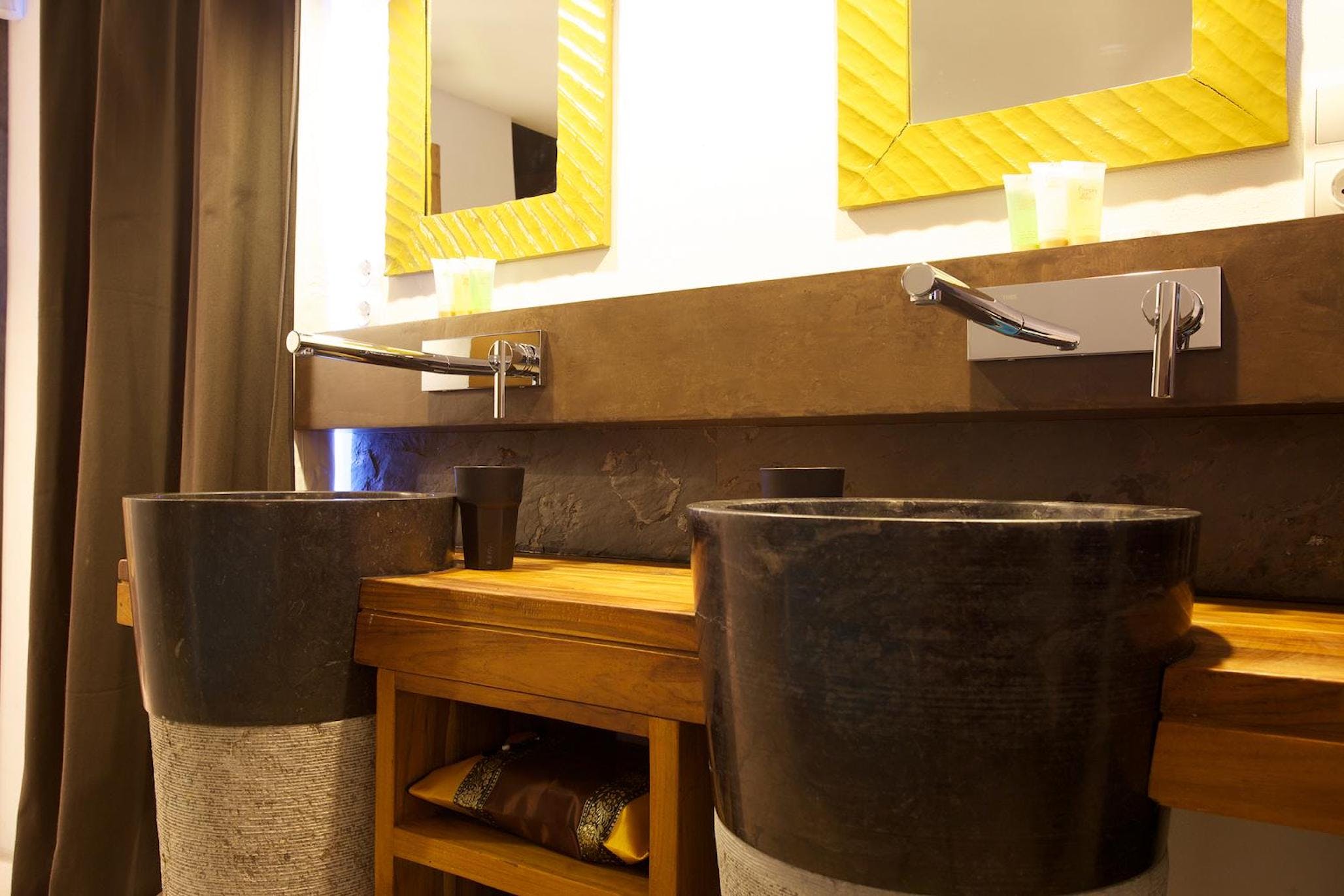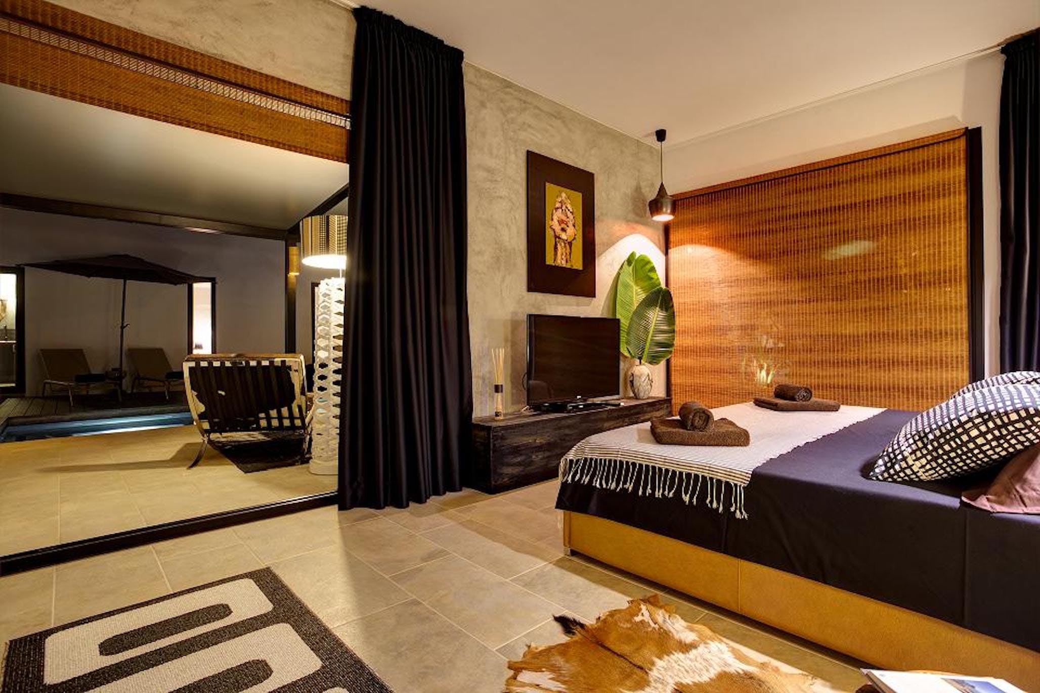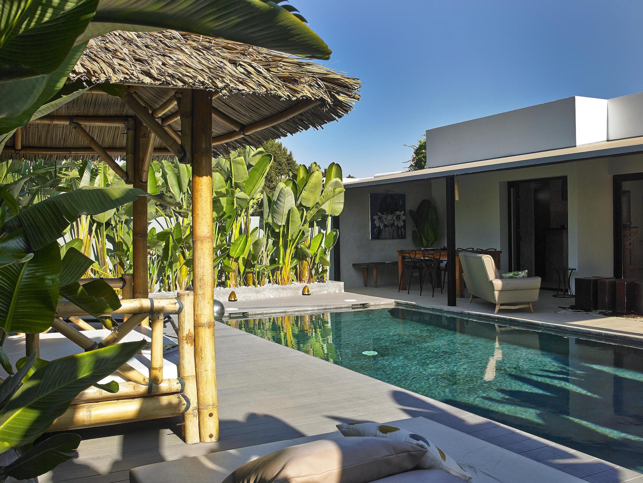 Main House – 40 sqm – King size bed, LED TV with satellite, French channel decoder, air conditioning, safe box. Private terrace / outdoor lounge area with a large circular sofa, Barcelona chair and Jacuzzi view. En-suite bathroom with bath and shower.