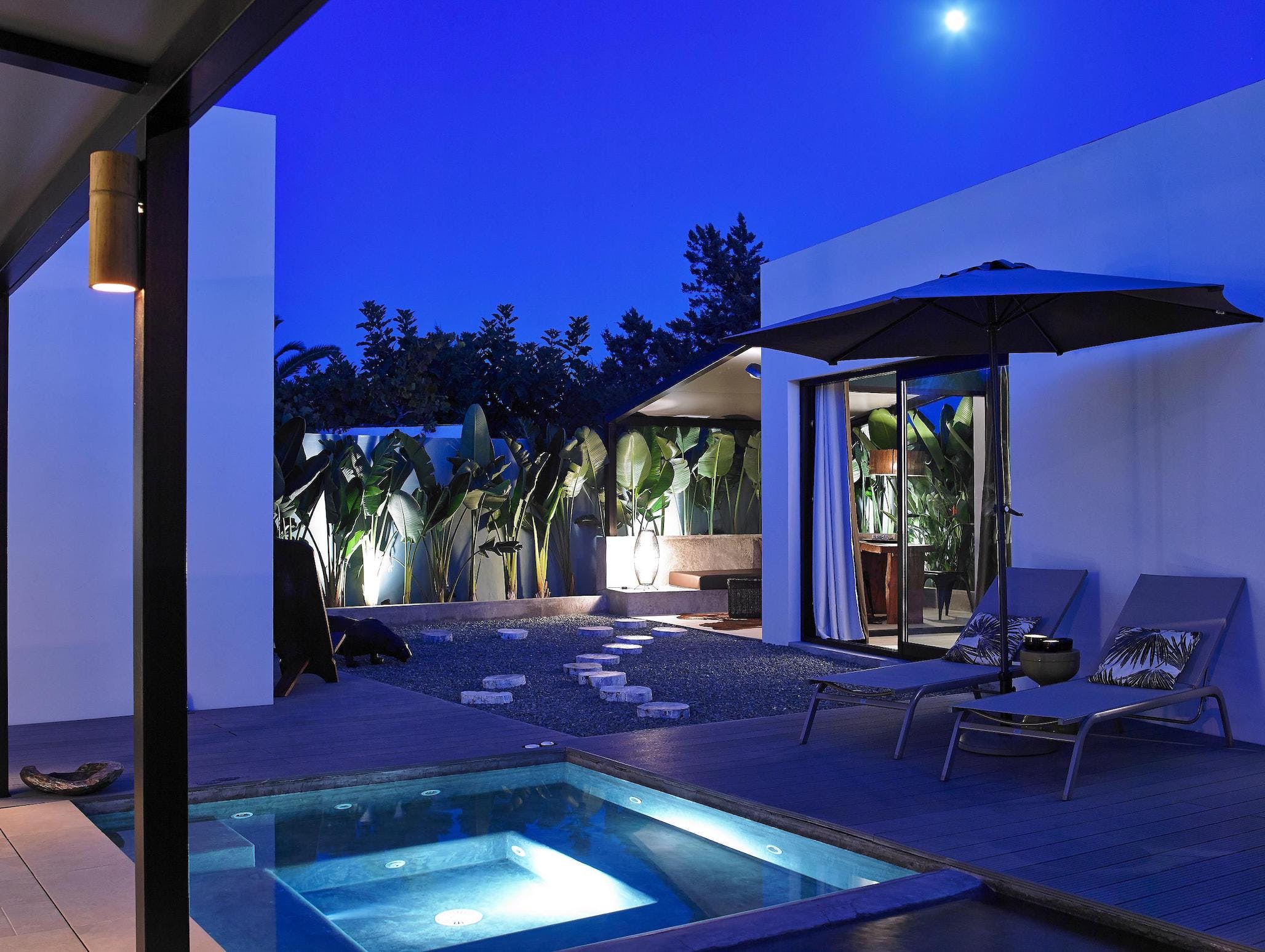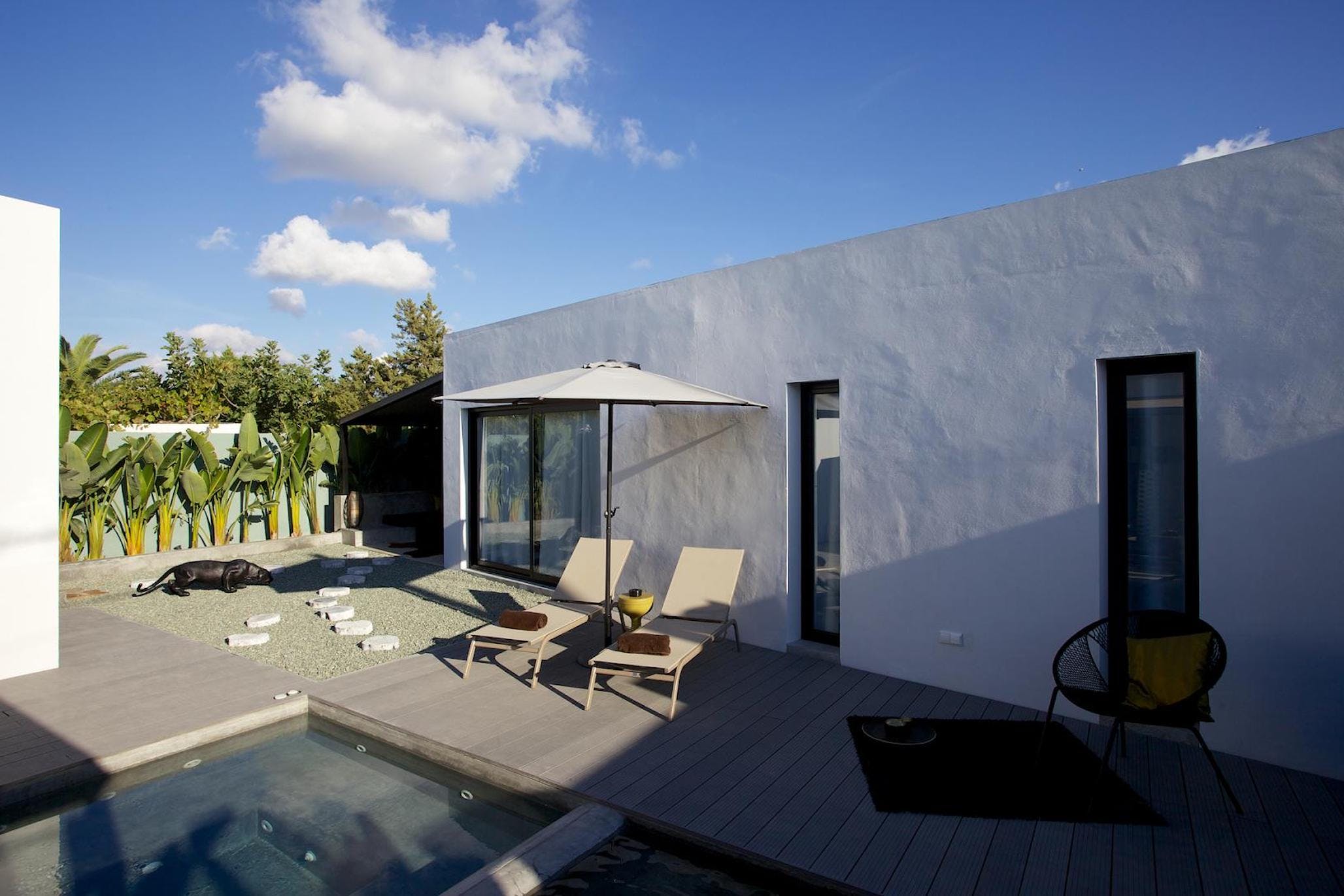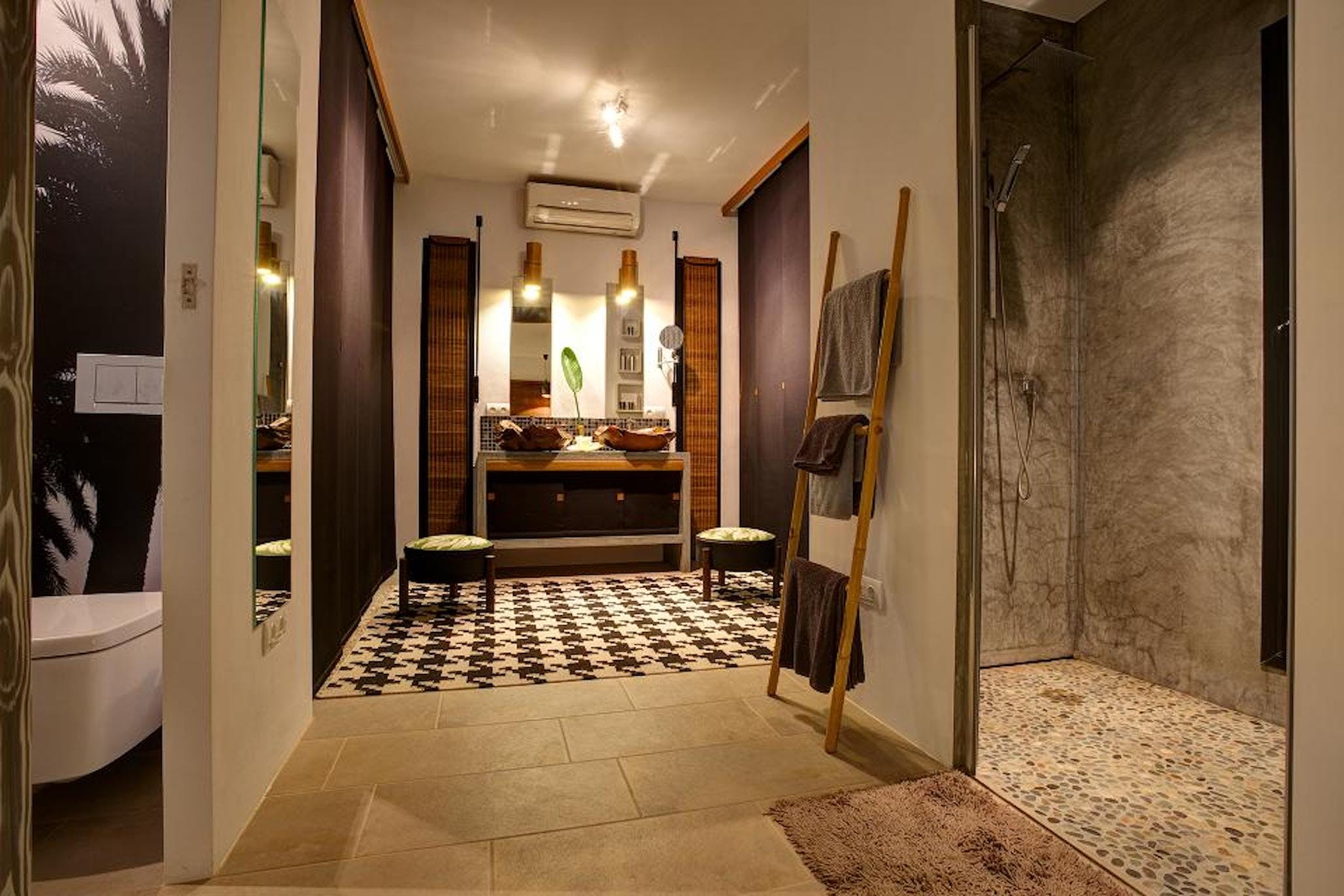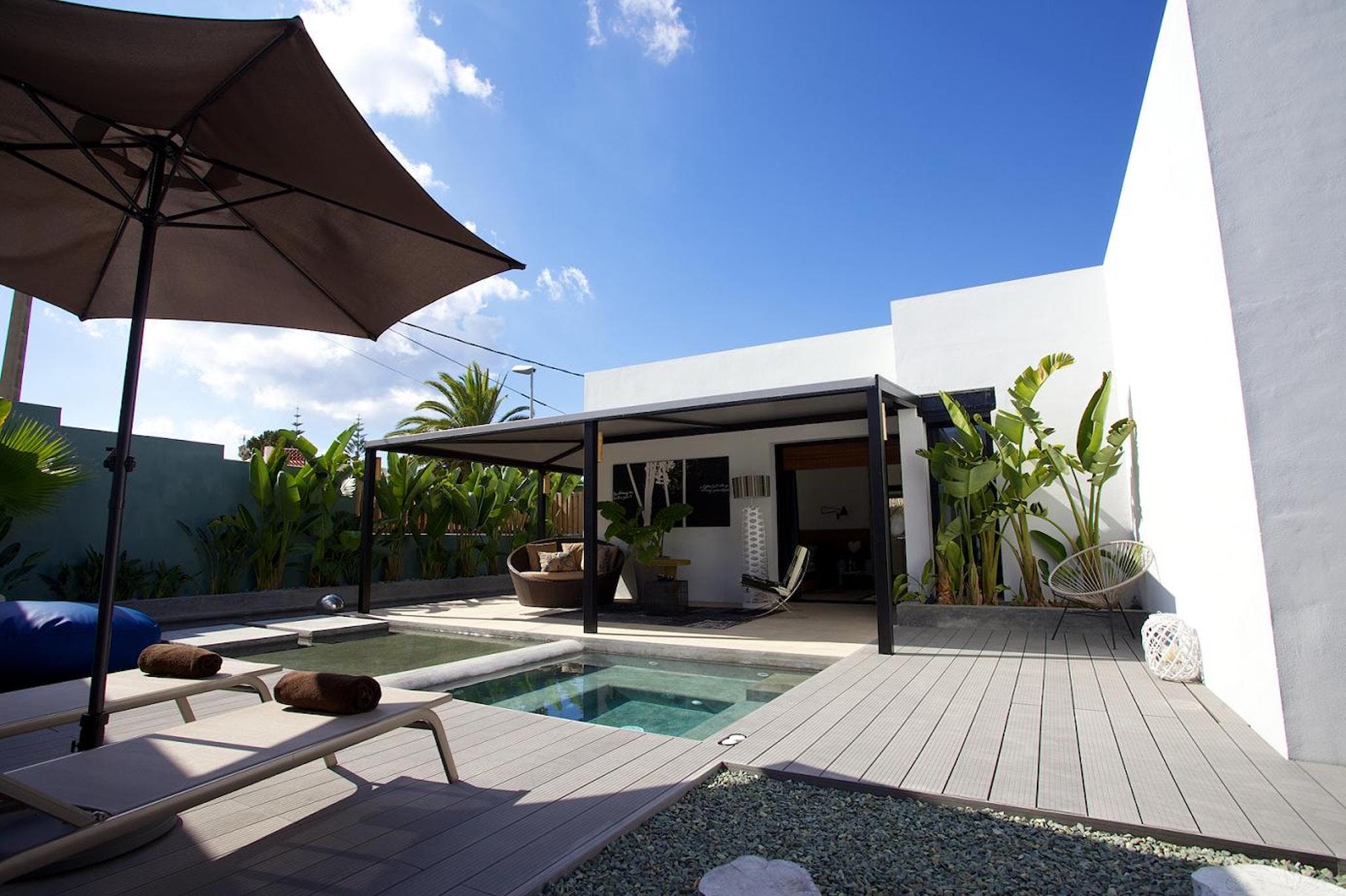 Take a dip in the Japanese style swimming pool (3.5 x 10m), relax in the Jacuzzi (2 x 2m) or pull up a lounger on the poolside wooden deck and bask in the warm Ibizan sunshine. On the terrace which wraps round property, the bespoke al-fresco living spaces are to be found and include a covered dining area seating eight, a lounge space with comfortable sofa seating and a king size lounge/day bed, all of which are surrounded by the stunning exotic gardens.